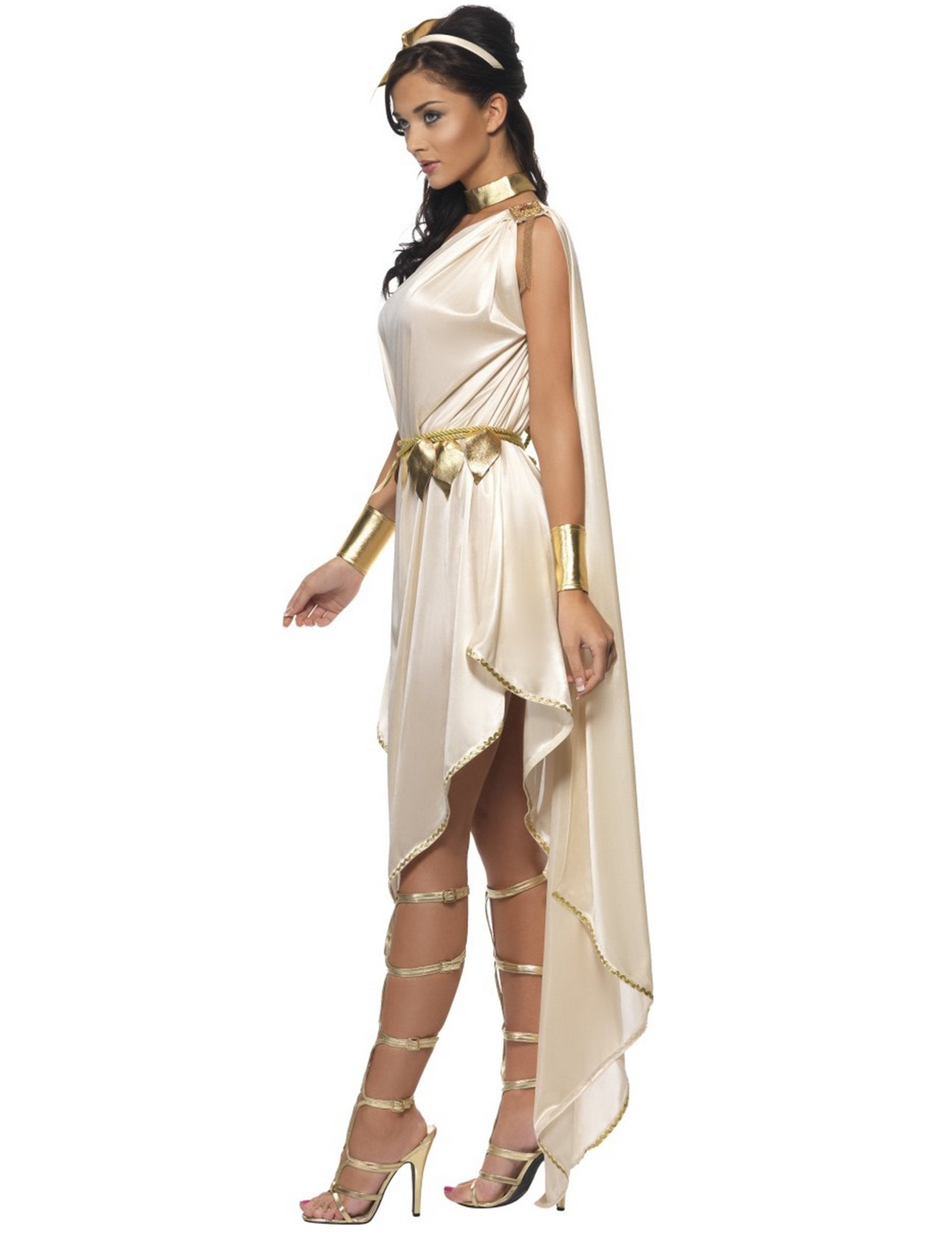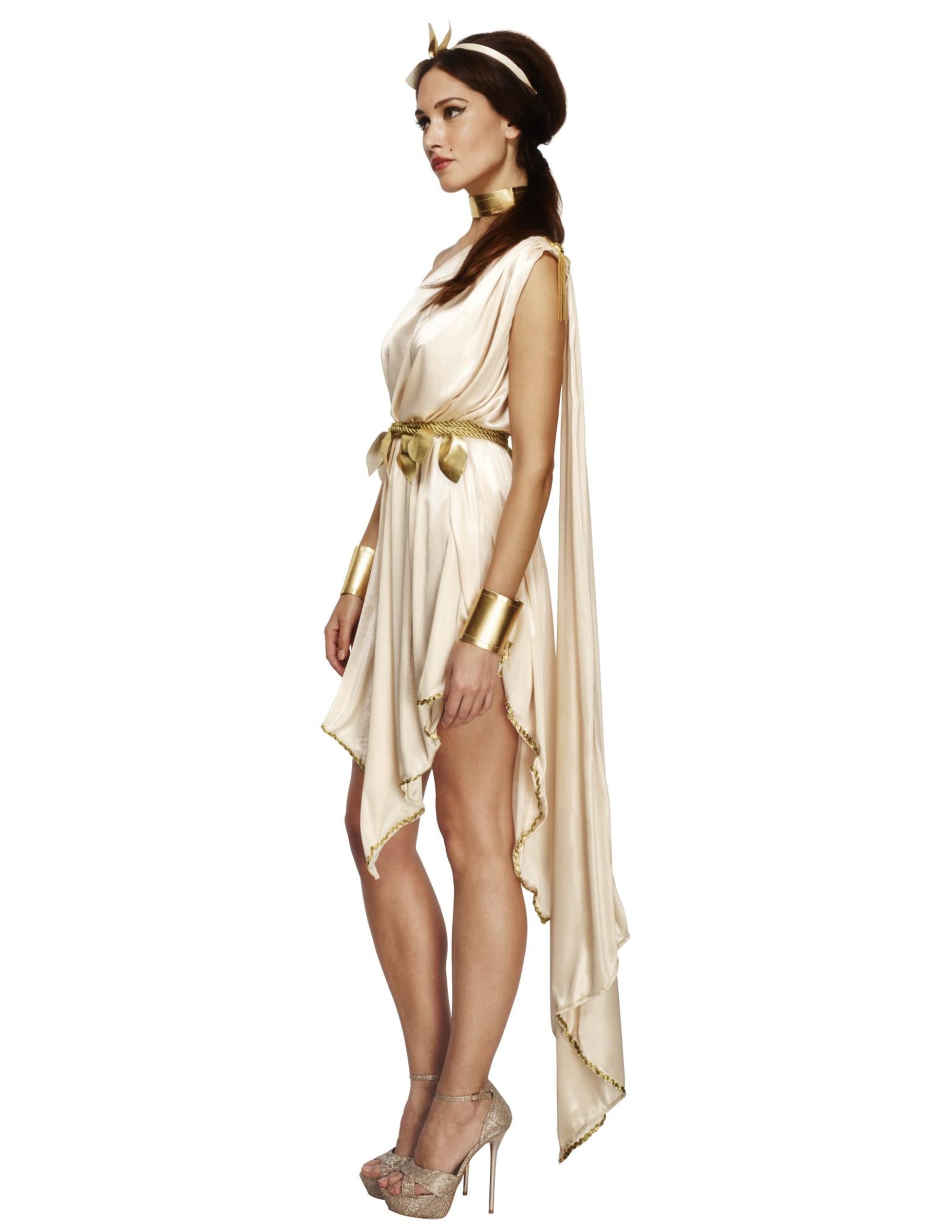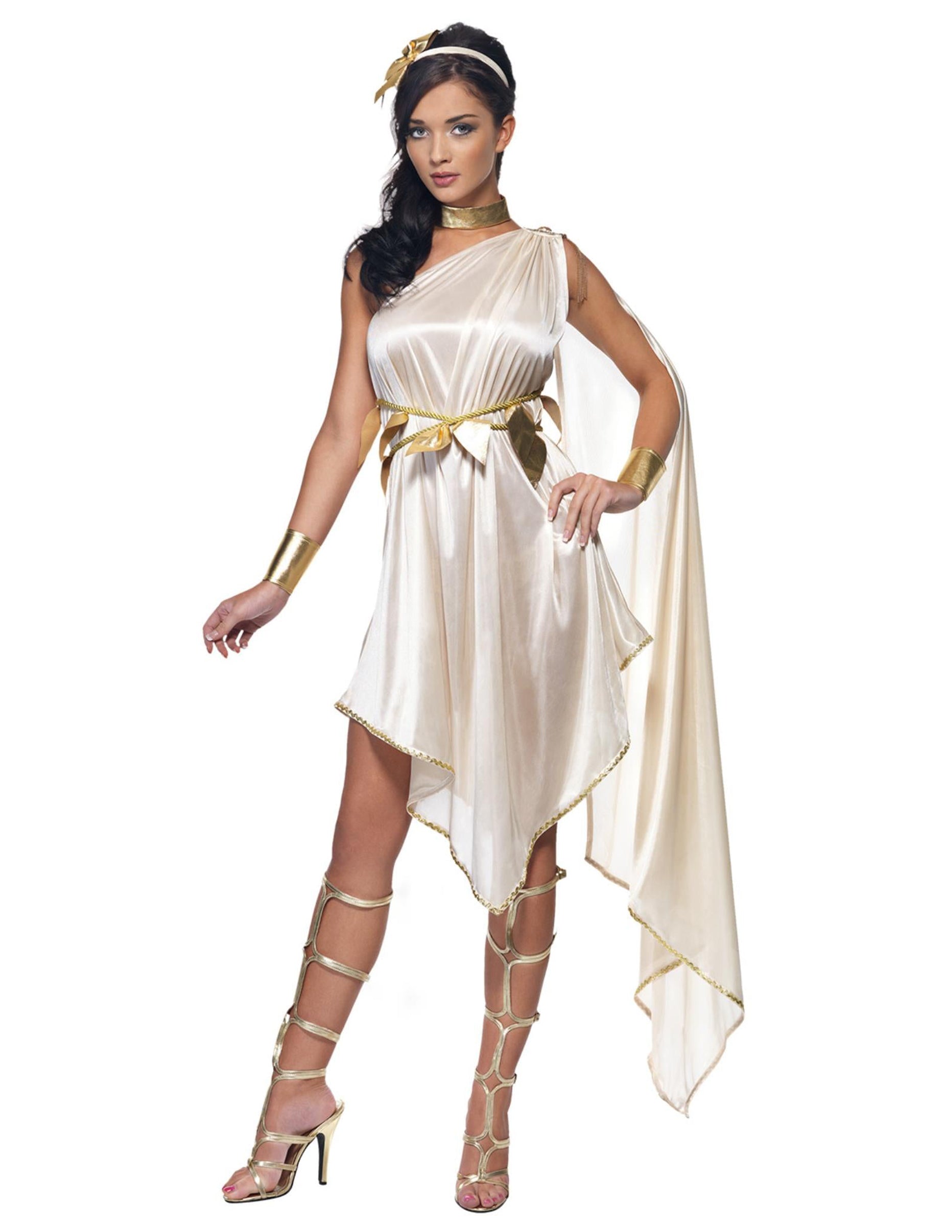 Ta grška boginja je sestavljena iz obleke, traku za glavo, pasu, par zapestnic in ogrlice (čevlji niso vključeni). Bež obleka je kratka in asimetrična, v sijoči bež tkanini. Dno obleke je vzdolž zlate pletenice. Dolgo ogrinjalo je prišit na rami. Trak za glavo je prekrit z bež tkanino. Okrašena je z zlatim cvetjem v imitacijski usnjeni tkanini. Pas vam bo omogočil upogibanje obleke. Ta pas je sestavljen iz zlate vrvi, na kateri so prisotni nekaj zlato usnjenih listov tkanine. Vrat in zapestnice so zlate. Zlahka se zaprejo z uporabo praske. Ta boginja kostum bo kot nalašč za sodelovanje v grškem rimskem večeru ali zabavi za karneval.