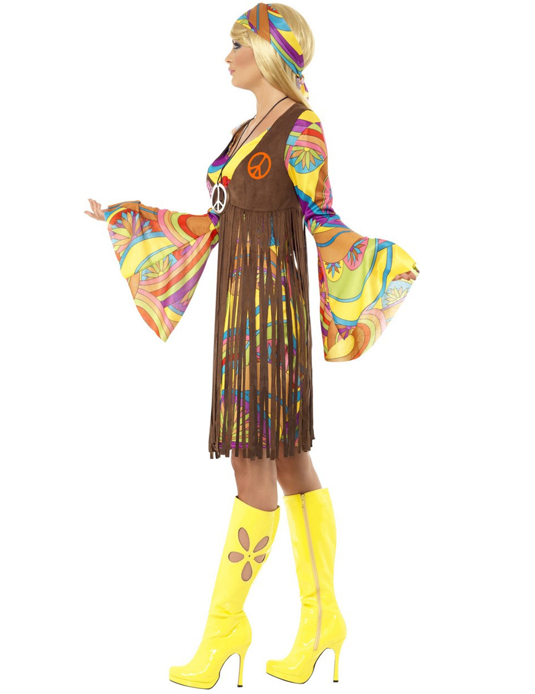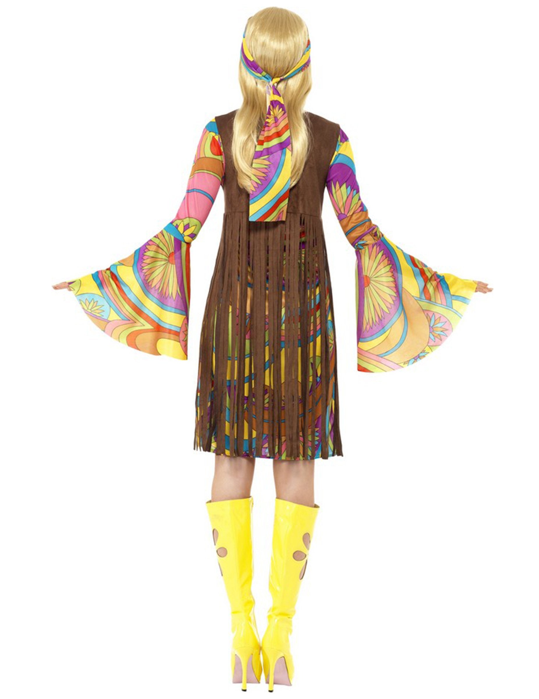 Ta hipi kostum za ženske je sestavljen iz zelo barvite cvetlične obleke, obrobnega jopiča, ki ga lahko položite čez obleko in trak za glavo. Ognjeni rokavi bodo odlično predstavljali slog 70 -ih, realizem tega kostuma vas bo popolnoma zapeljal. Ta komplet vam bo omogočil, da se iz tega znanega časa postavite v čevlje ženske. Kostum hipi cvetov za ženske je idealen za vse vaše večere na retro temo.