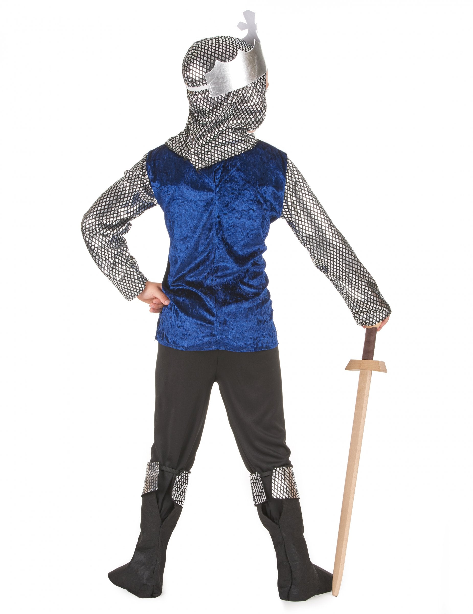 Ta otroški kostum predstavlja vitez. Sestavljen je iz tunike, kapuce, krone, hlač in sur-čepov (čevlji niso vključeni). Tunika je dolgi rokavi. Ti rokavi imajo diamantne vzorce, ki simulirajo kočo mrež. Na dnu majice je prišit trak te tkanine. Prsni koš je v modrem poliestru z žametnim učinkom. Na prsni koš je prišit grb, ki predstavlja leva v križu, znak pripadnosti suverenosti. Črne hlače so narejene iz poliestra, deloma pa jih skriva črni sur-zagon. Kapuca je narejena iz poliestra in pokriva glavo. Obraz je odkrit, vendar ga preseže krona. Tkivo spominja na tunično mrežo. Med prigrizkom za rojstni dan ali karneval bo vaš sin lahko pokazal svoje talente meča z nošenjem tega branilca kostuma.