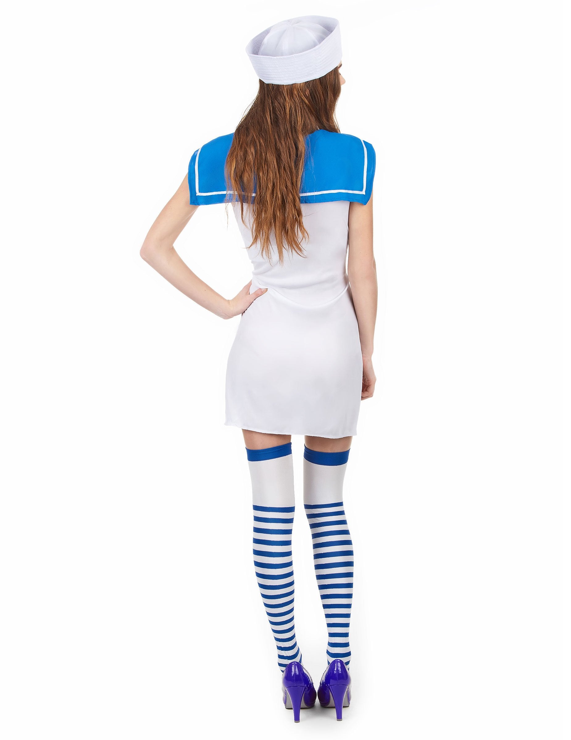 Ta kostum za odrasle je imitacija mornarske uniforme. Vključuje obleko in klobuk (nizki in čevlji niso vključeni). Vgrajena obleka na velikosti je v modrih in belih tonih. Modri ovratnik z vozliščem okrasi izrez. Dno je belo z gubami z modrimi črtami na sprednji strani. Beret je bela, sidro mornarja pa je spredaj pritrjeno v modri barvi. Preoblikujte se v moussaillon za tematski večer ali za karneval.