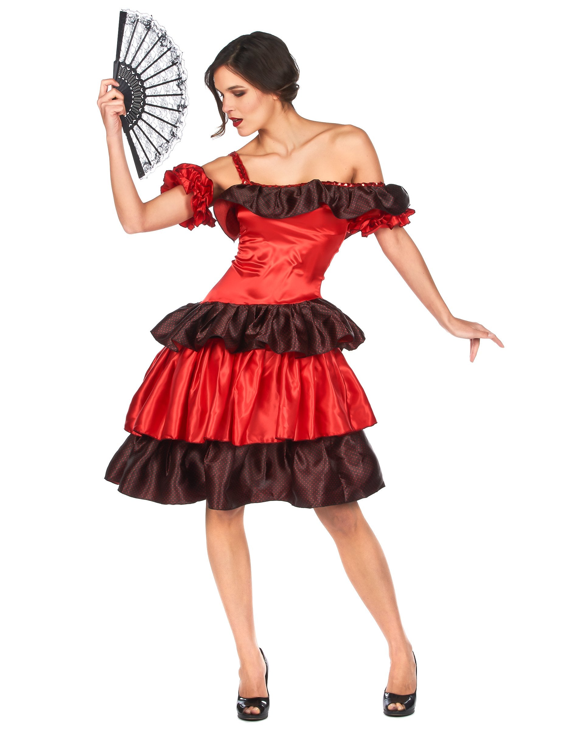 Ta kostum za odrasle vzbuja andaluzijsko plesalko. Vključuje obleko, trakove in sponke za lase (čevlji niso vključeni). Obleka je dve. Sestavljen je iz več penečih rdečih in črno rdečih ruffles. Ovratnik je asimetričen z eno samo klančino. Črne in rdeče roke v obliki lasne elastike je treba postaviti na roke, da dokončajo to obleko. Črne klešče za lase je preseženo s penečim rdečim poliestrskim cvetjem. Med latinskim večerom ali za karneval vžgete sobo s španskimi plesi!