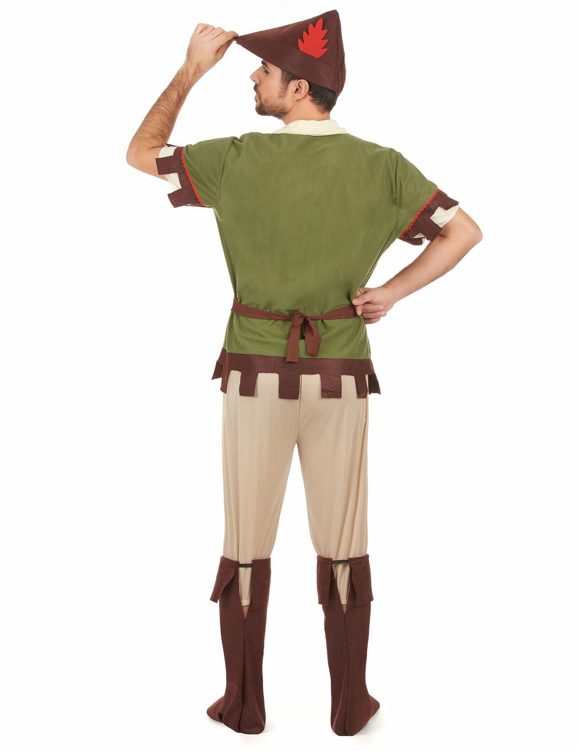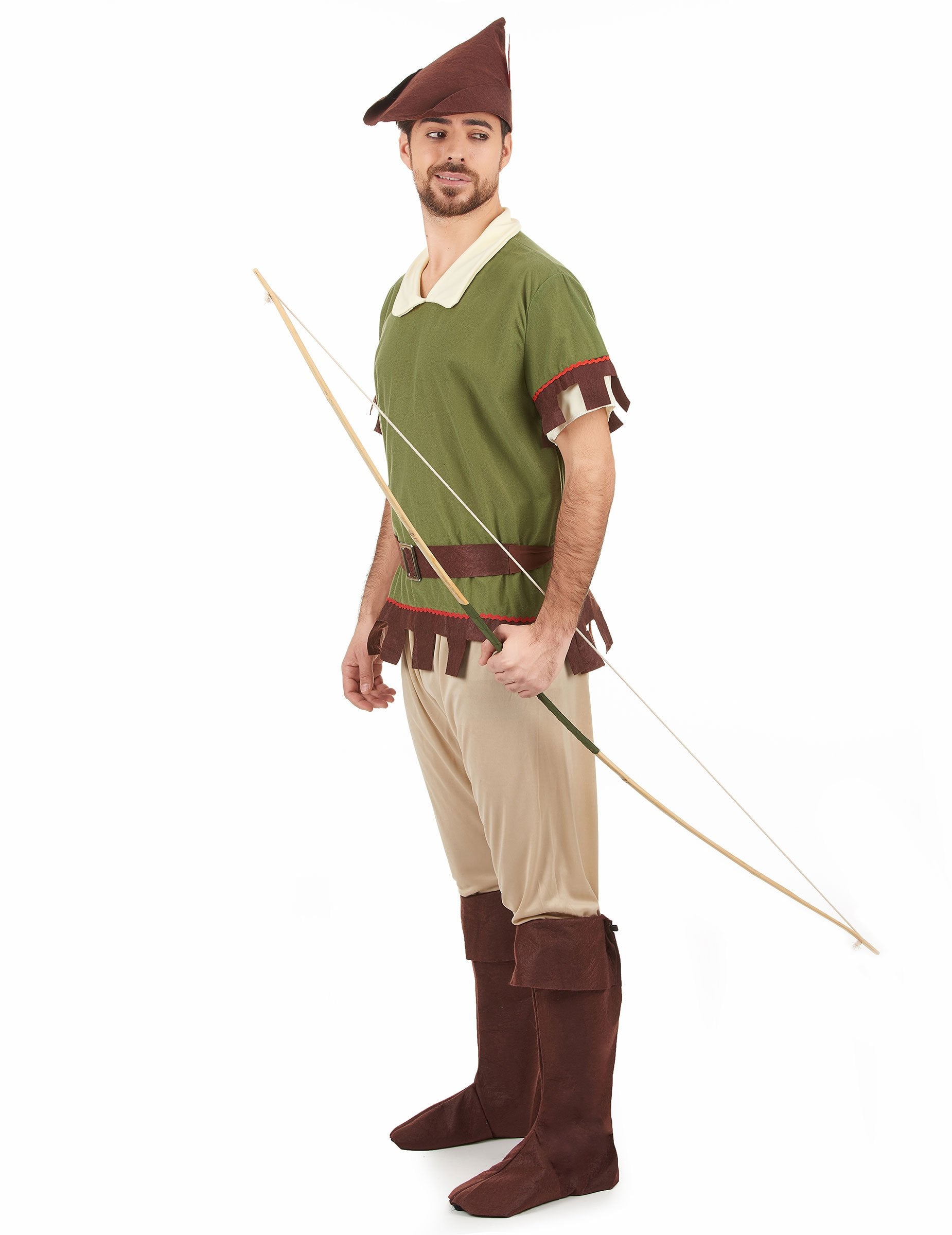 Ta kostum za odrasle predstavlja brigand Sherwood. Vključuje majico, pantacourt, pas, sur-čevelj in klobuk (čevlji in lok niso vključeni). Majica je narejena iz malce debelega poliestra. V glavnem zeleni ima lažni ovratnik in bež rokave. Dno majice in konec rokavov se razreže v obliki rež v rjavem filcu. Pas iz rjavega filca s srebrno plastično zanko je zasukan v hrbet s trakovi. Bež poliester Pantacourt je dovolj. Velikost in konci sta elastična. Bo pritrjen v rjavih čevljih. Na čevljih so nameščeni z elastiko. So visoki 46 cm in 40 cm noge. Galleron je narejen iz rjavega filca. Rdeče perje v isti tkanini je pritrjeno na tej starodavni pokrivali. V srednjeveškem tematskem večeru igrajte Vigilante of Middle.