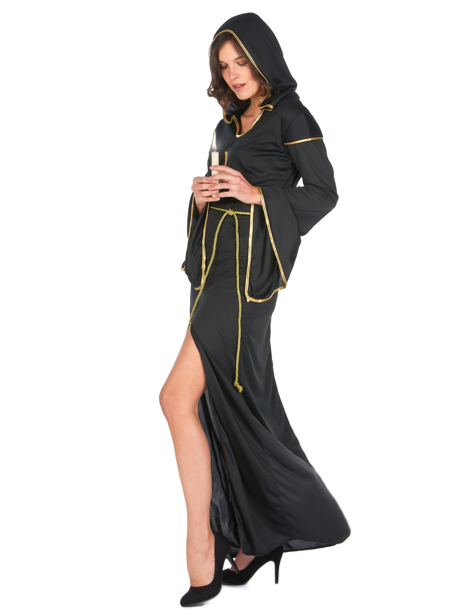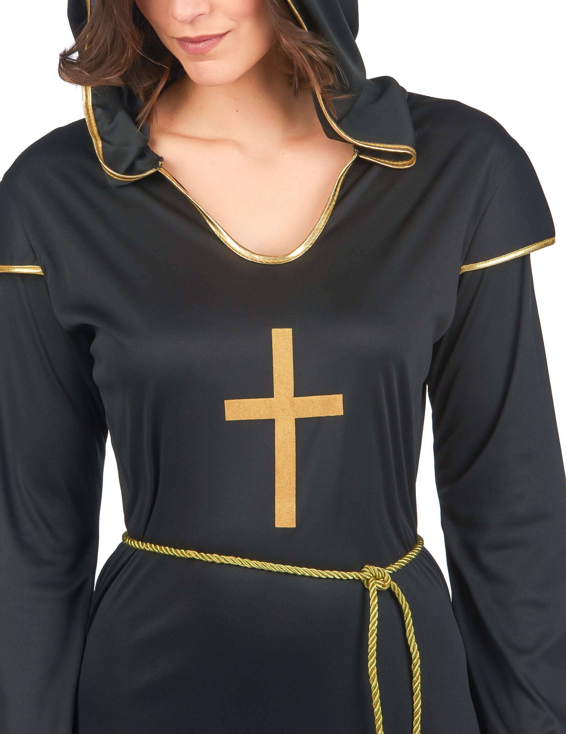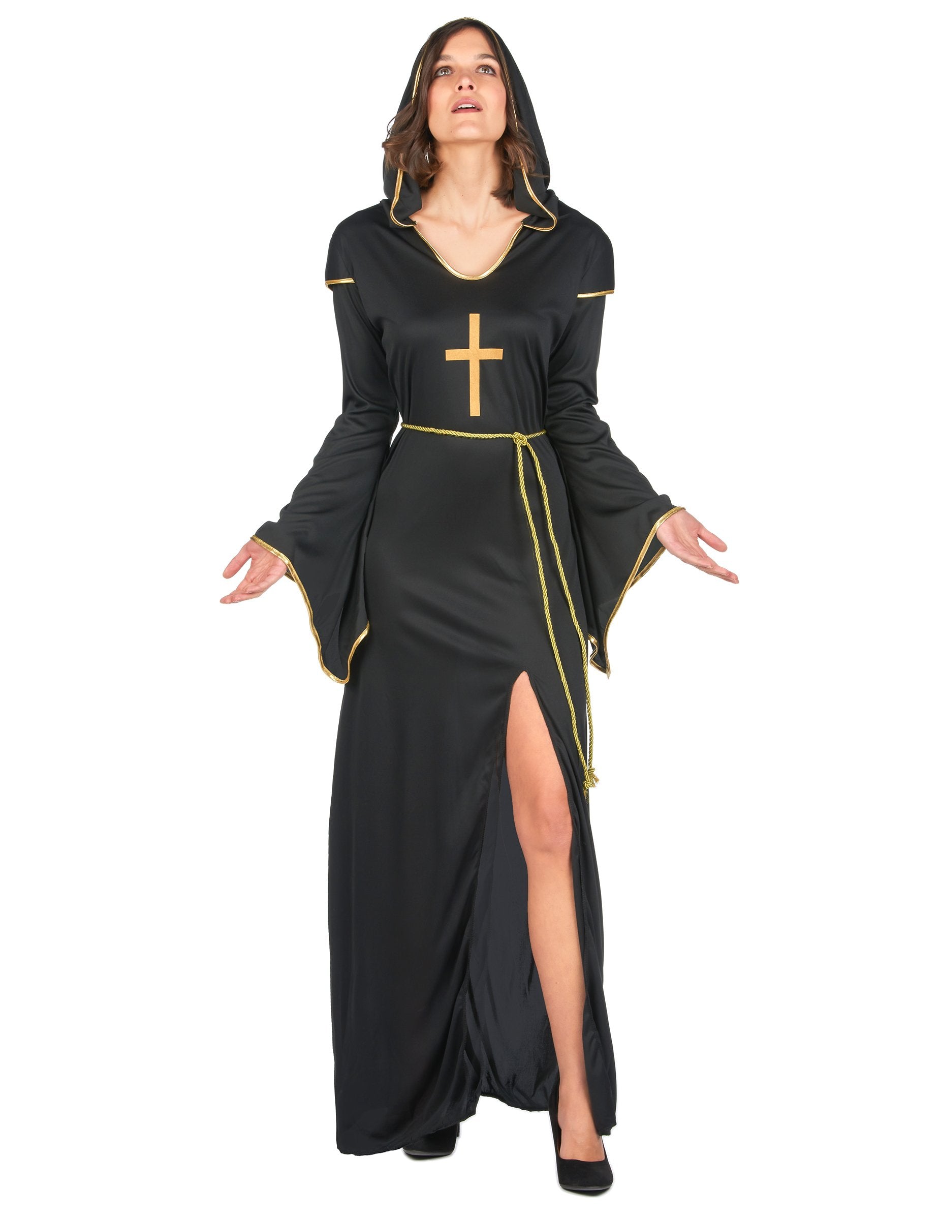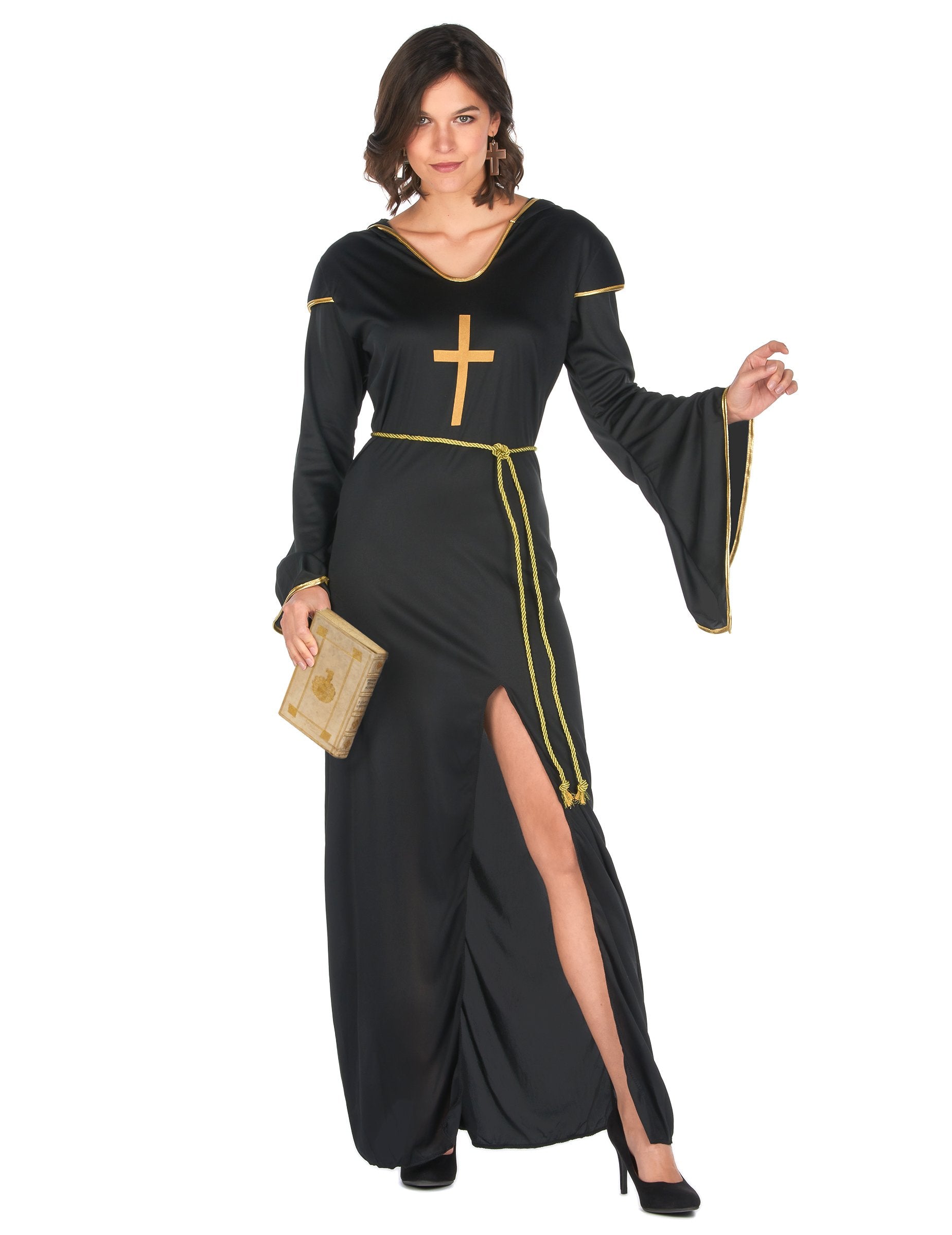 Ta kostum za odrasle je verska obleka. Vključuje obleko in pas (čevlji niso vključeni). Črna obleka je veliko bolj ženstvena kot tradicionalna navada. Zaradi vrata in dolga reža na nogi ta kostum naredita seksi. Potok in tiskani križ ga dopolnjujeta. Trgovine dajo šik zrak tej dolgi obleki s finim poliestrom. Dodelavi so zlata barva. Zlati pas je vezan kot tanka vrv. Bodite privlačni, a oddaljeni z igranjem sestre med tematskim večerom ali za karneval.