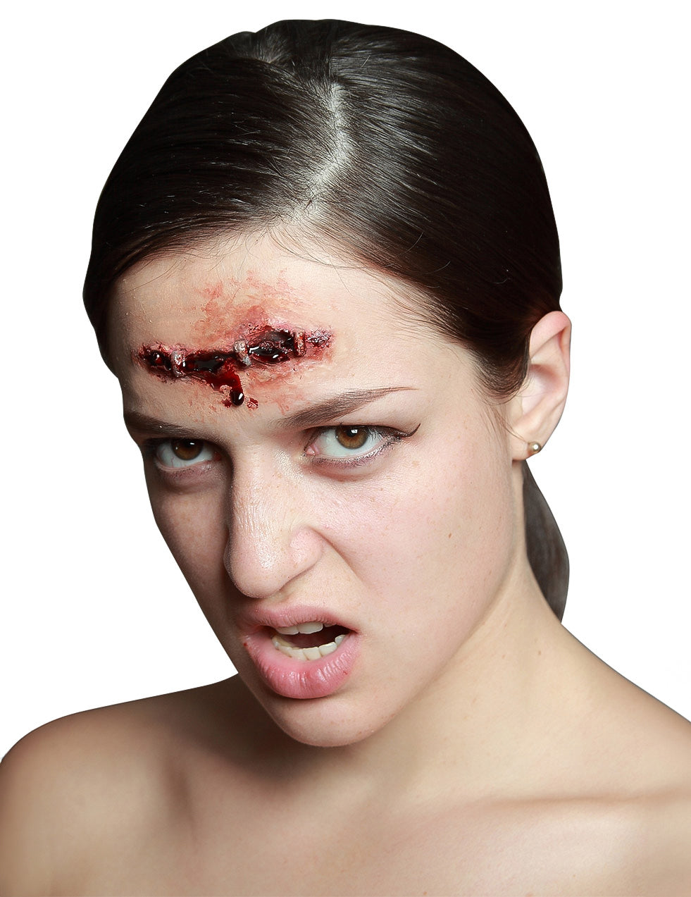 Ta lažna rana predstavlja poškodbo. Postavljen na čelo, lateks simulira globoko in krvavo zarezo omamljeno, kar je najbolje, da lahko z sponkami (lepilo ni vključeno). Spremljevalec ali prijatelj Frankensteinovega bitja bo ta ličila kot nalašč za noč čarovnic.