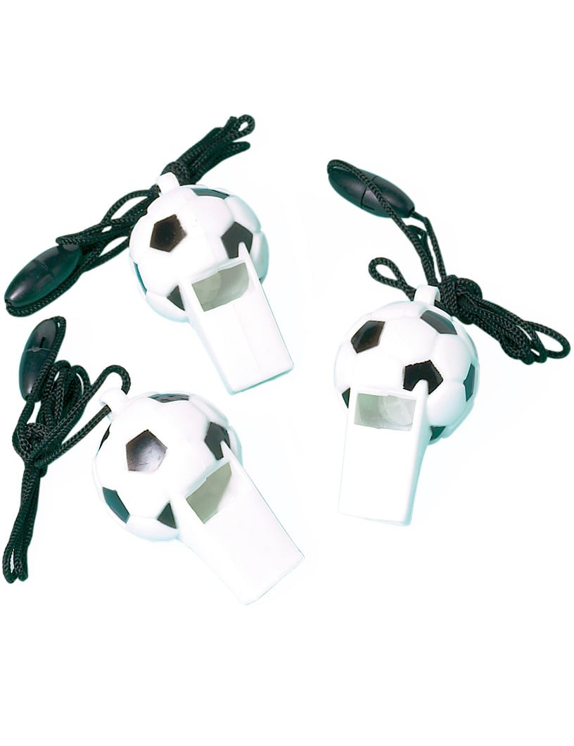 Ta sklop ima 12 nogometnih piščalk v prvenstvu, ki merijo 5,5 cm. V plastiki so te bele in črne piščalke predstavljale nogometne balone. Te žvižge so hrupne in črna vrvica je prisotna, da se lahko nosite okoli vratu. Vstavite te male žvižge v piñato na rojstni dan na nogometno temo vašega sina, da jih potem ponudite svojim tovarišem!