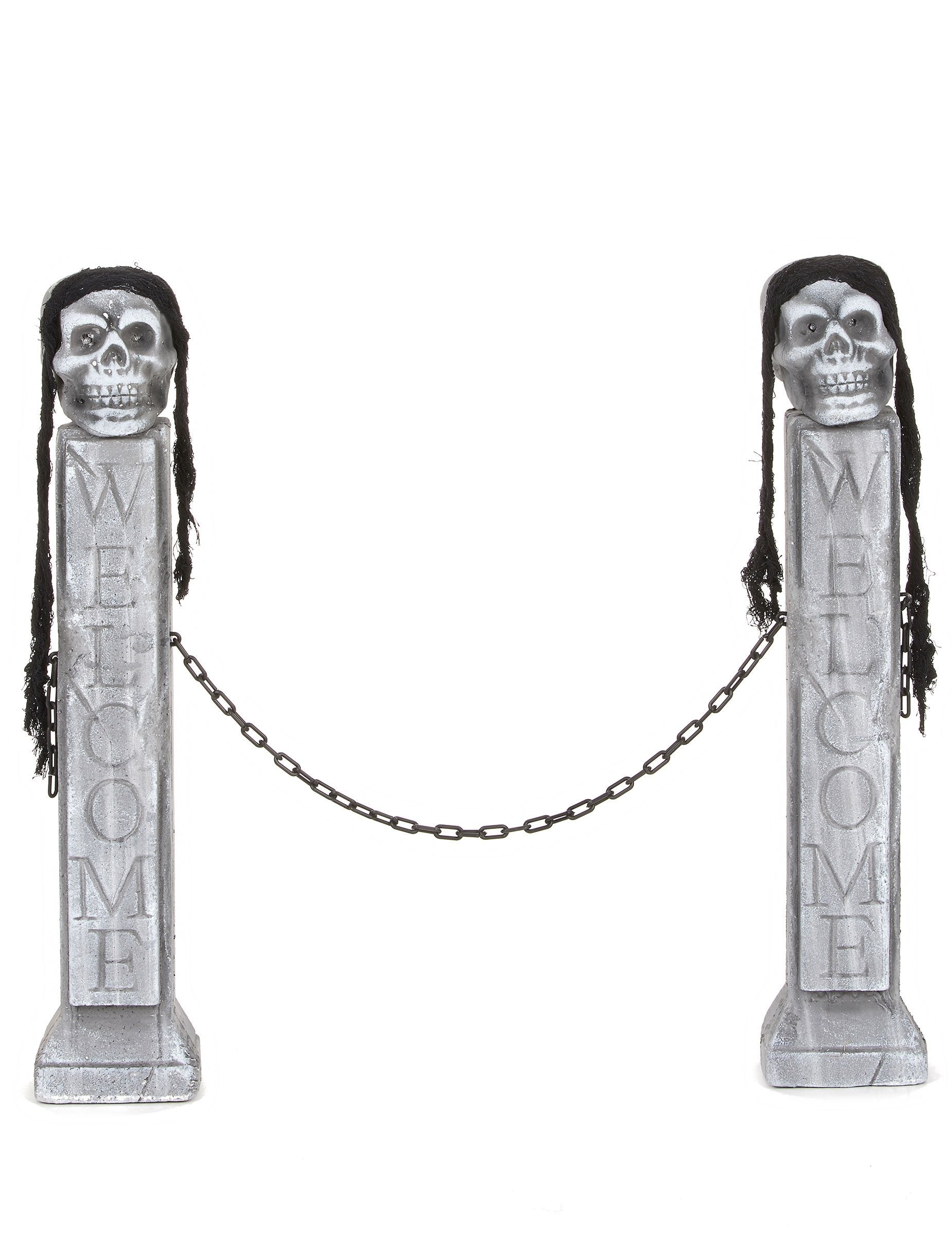To pokopališče Halloween je sestavljeno iz 2 polistirenskih stebrov. Kamen učinek, ti stebri merijo približno 75 x 15 x 10 cm. Omemba "dobrodošlice" je vgravirana na vsakega od njih. Na vrhu stebrov je prisotna lobanja, ki jo preseže črna mreža. Na zadnji strani teh lobanj je prisoten gumb "Vklop/izklop" (vključene baterije). Z aktiviranjem gumba se bodo oči lobanj prižgale in utripale vse barve. Ti stebri iz kamnitega učinka so med seboj pritrjeni s črno plastično verigo. Ta dodatek bo ves bes s prijatelji in bo kot nalašč za dokončanje vaše notranje ali zunanje dekoracije na noč čarovnic.