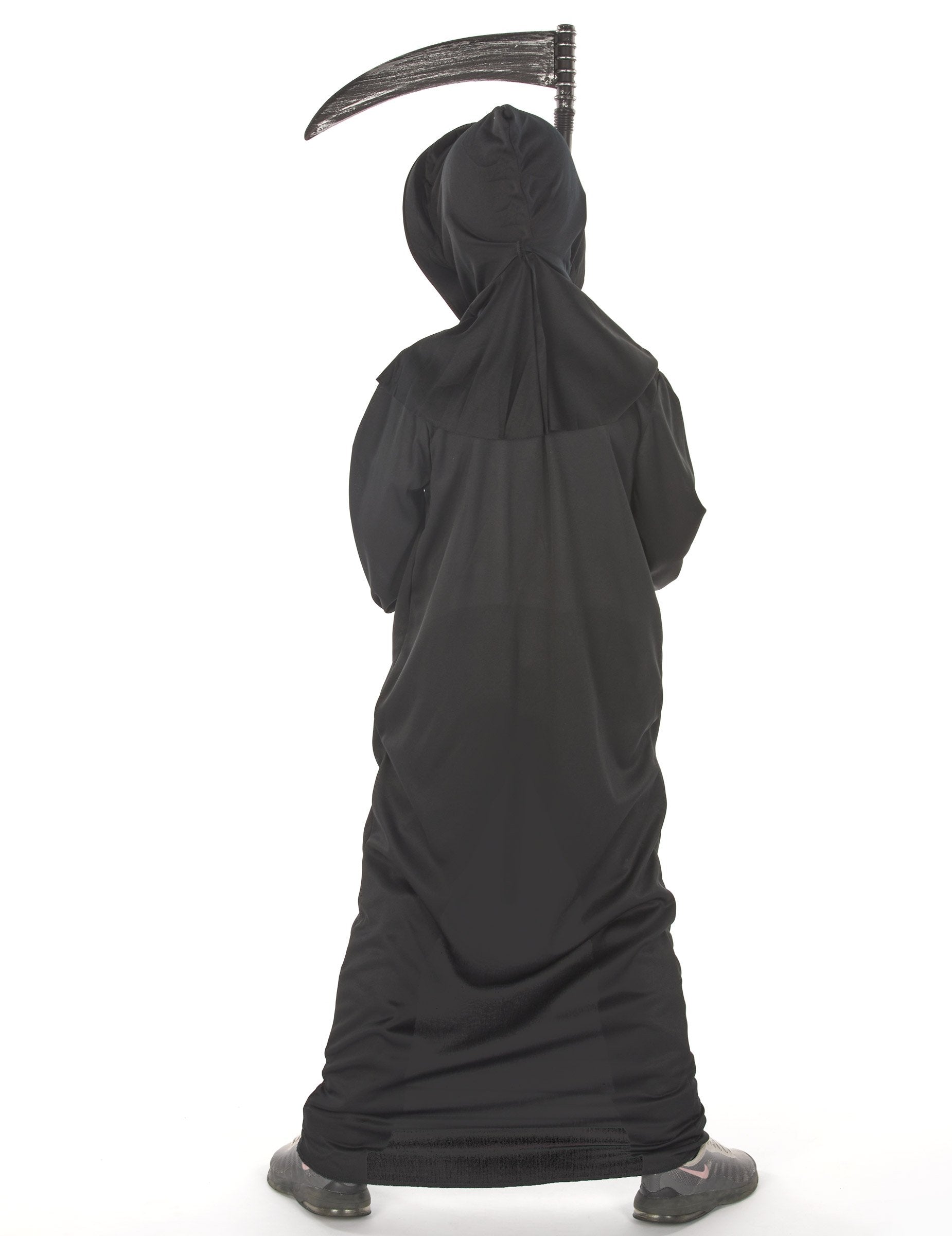 Otroška odpoved preobleke je sestavljena iz črne obleke, zaprte kapuce z masko in rokavicami. Dolga črna obleka ima razgibane rokave. Praska na vratu vam omogoča, da jo zaprete. Rokavice so črno natisnjene iz kosti za mrtve mrtvega učinka na konice prstov. Črna kapuca se spusti do ramen, prefinjena je in zaprta na sprednji strani obraza z masko v lobanji. Praska na dnu glave vam omogoča, da jo zaprete. Njegov hudobni nasmeh vam bo dal strašljiv pogled. Dve očesni odprtini vam omogočata, da z lahkoto vidite, da začnete z iskanjem novih žrtev. Vaši gostje ne bodo ostali ravnodušni do tega grozljivega kostuma. Ta preobleka bo kot nalašč za utelešenje slavnega žetvena za noč groze ali za noč čarovnic. Avtorske pravice Widmann Srl