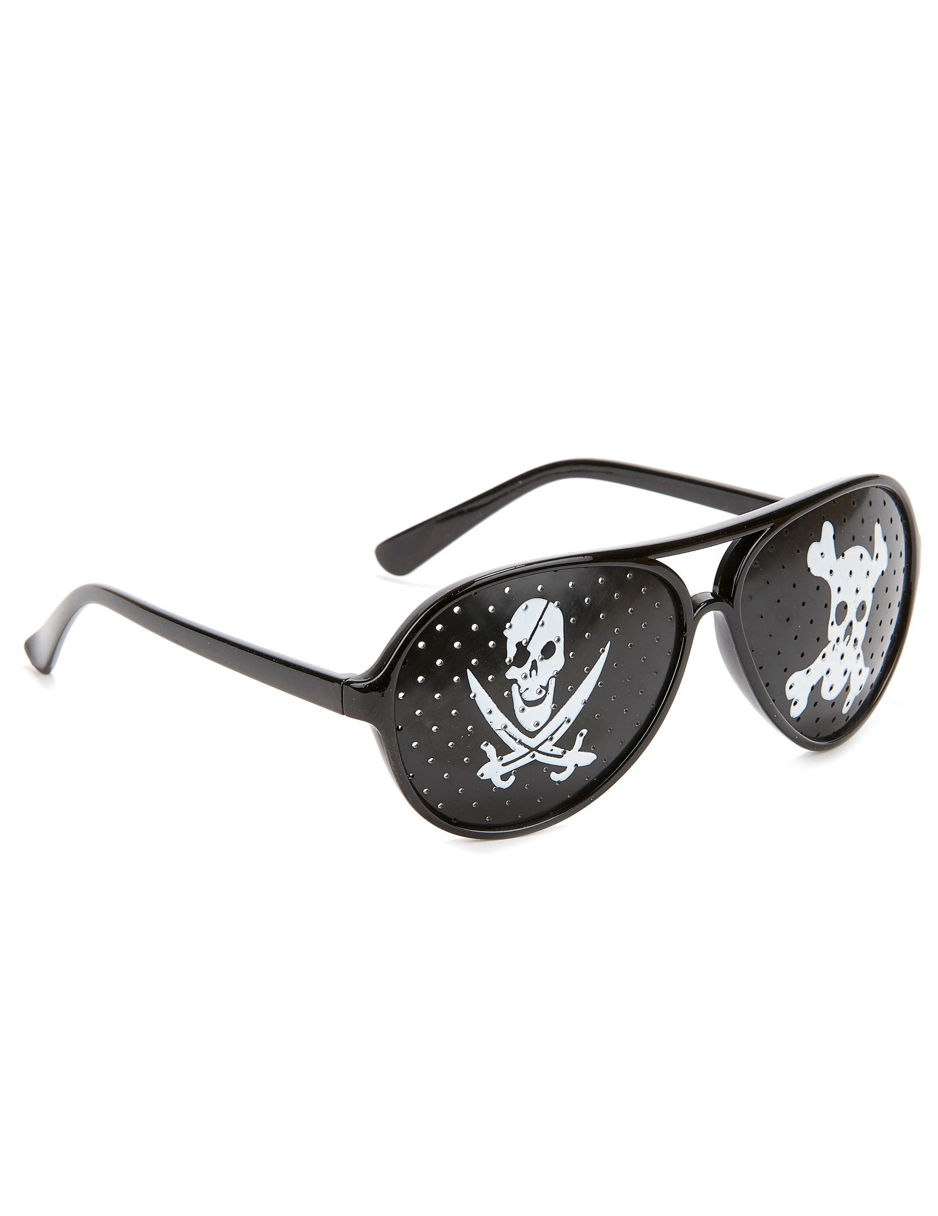 Ta črna piratska očala za odrasle so plastična. Očala so narejena iz neprozorne črne plastike. Natisnjeni so z belimi lobanji. Na očalih so prisotne majhne luknje, tako da lahko vidite skozi. Ta očala bodo kot nalašč za namestitev piratske preobleke z izvirnostjo.
