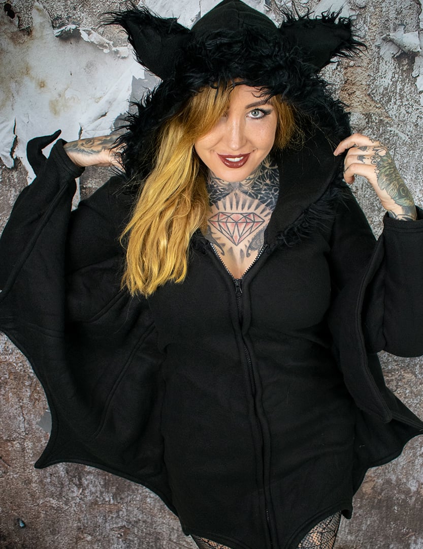 Ta kostum plešaste miške za ženske je obleka s kapuco (hlačne nogavice in čevlji niso vključeni). Obleka je črna v debeli tkanini, ki jo zapre spredaj z zadrgo. Kapuca je obdana s črnim fauxnim krznom in ima 2 ušesa. Ta velik kostum bo kot nalašč za 31. oktober ali za tematski večer.