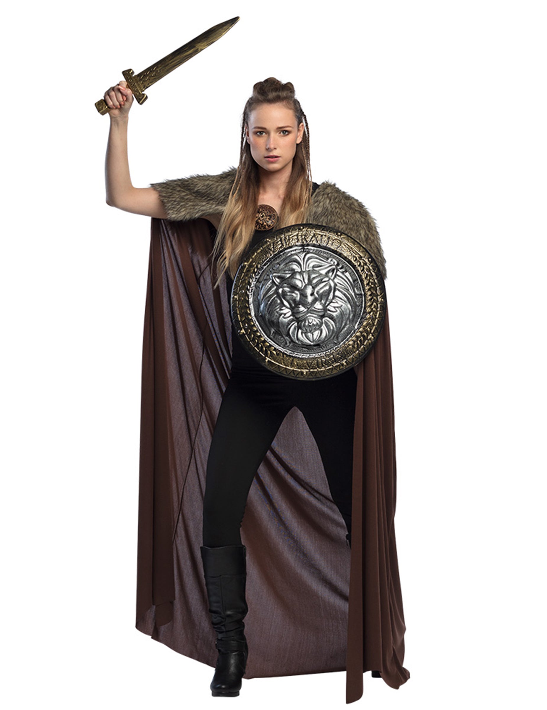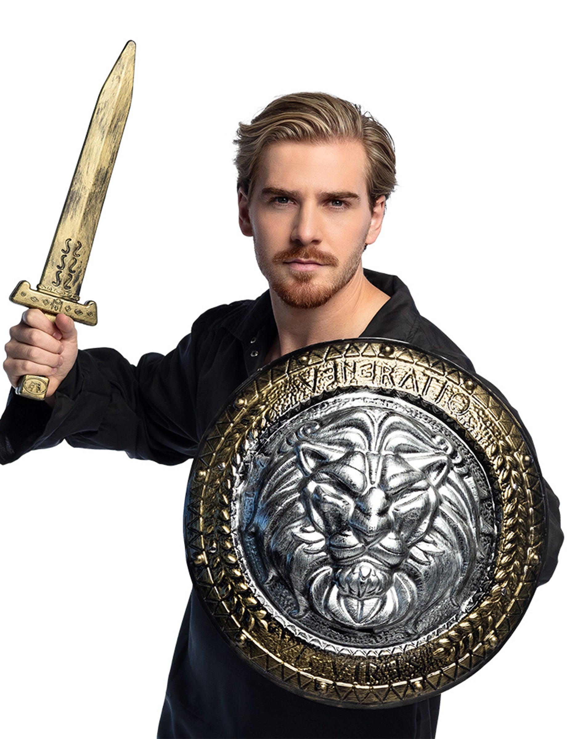 Ta nabor dodatkov je sestavljen iz ščita in meča gladiatorja. Plastični ščit je zlate barve. Izmeri premera približno 46 cm in je okrašen z levjimi glavi in rimskimi vzorci. Ujemajoč meč meri približno 61 cm. Rezilo je srebrno in rjav ročaj. Izpolnite kostum Gladiator med naslednjimi prikritami večeri.