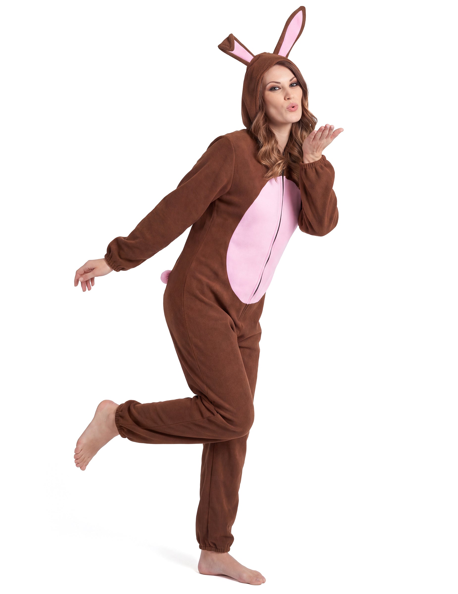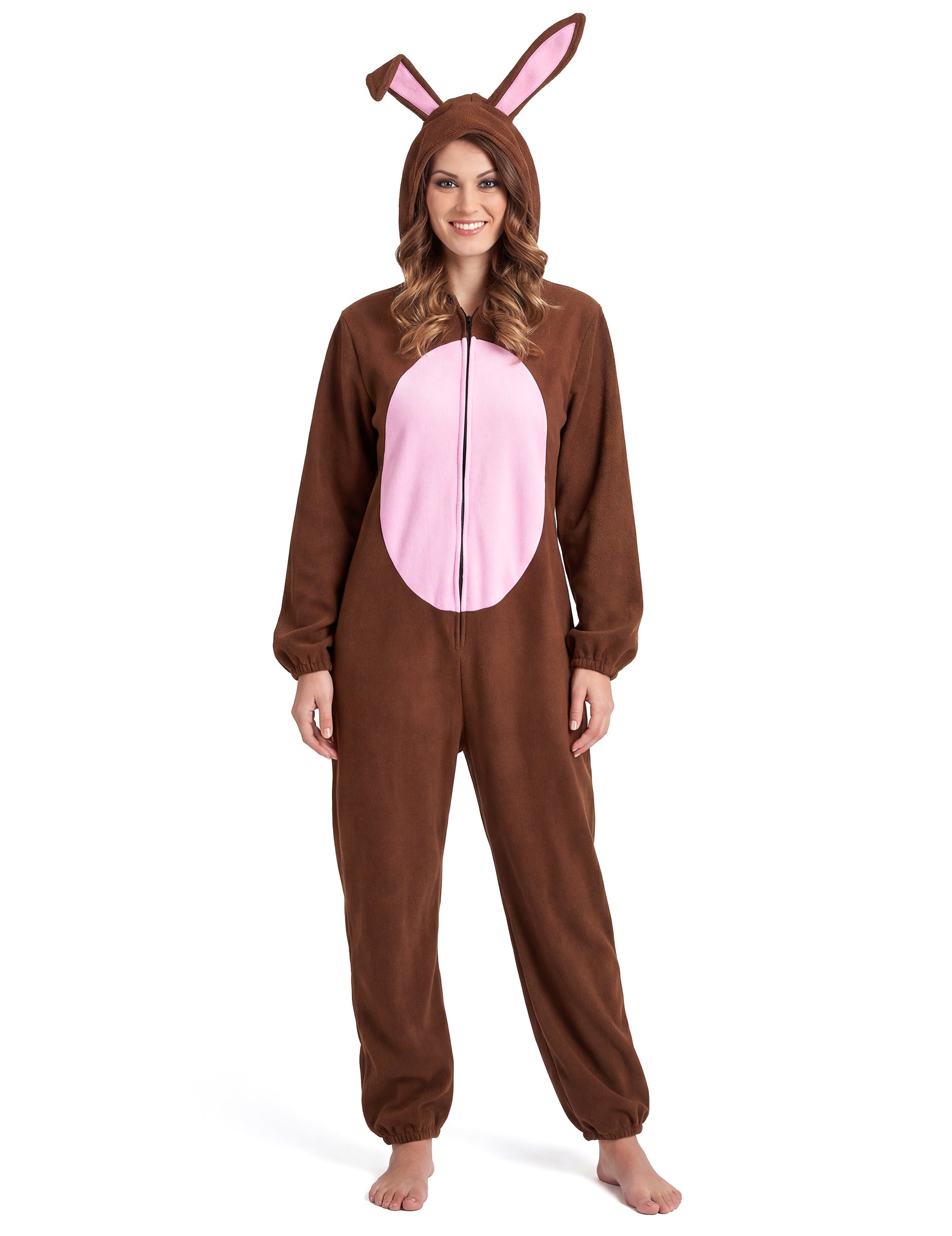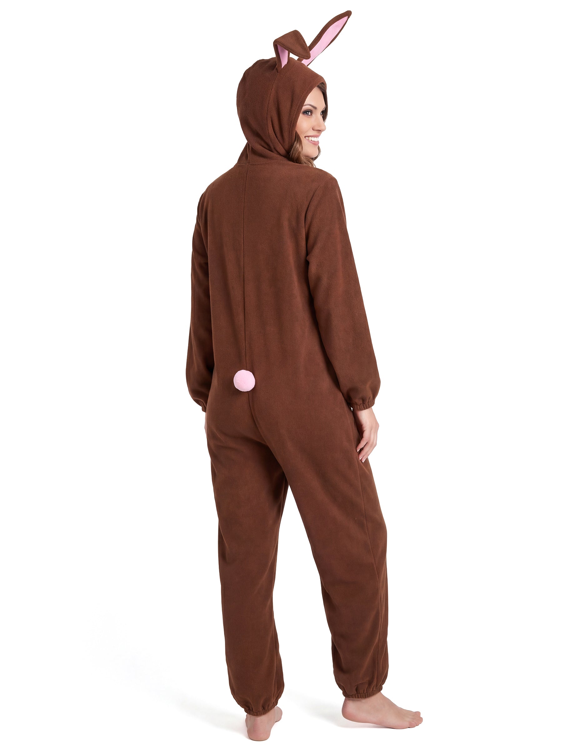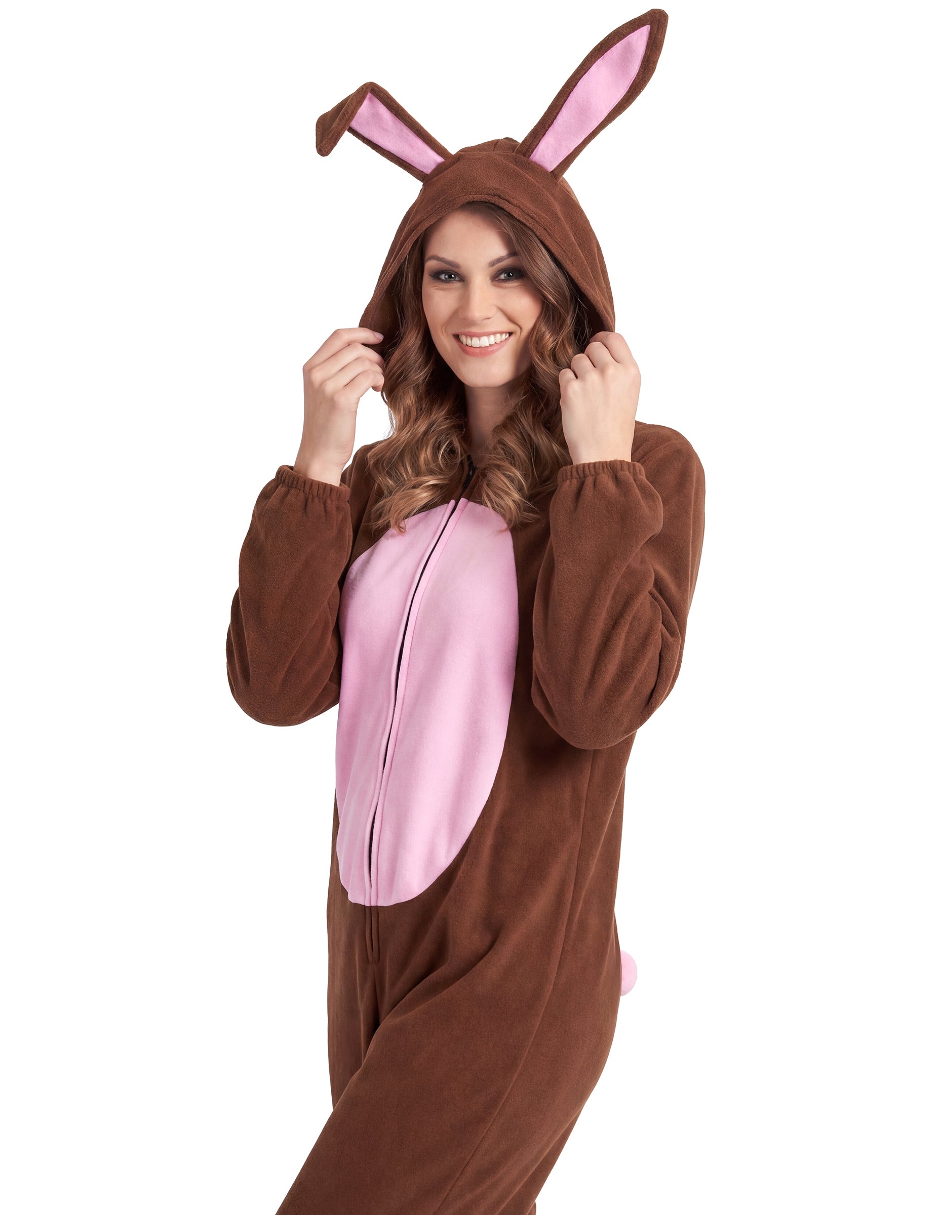 Ta zajčji kostum za ženske je kombinacija. Rjava kombinacija je v polarnem učinku. Trebuh in notranjost ušes sta roza za najbolj čudovit učinek! Kombinacija se spredaj zapre z zadrgo, ušesa pa imajo okvir, da jih zložite, če želite. Na voljo v eni velikosti, meri 155 cm v dolžini (brez pokrova). Odločite se za to simpatično in smešno definicijo ob tematski zabavi ali za karneval.