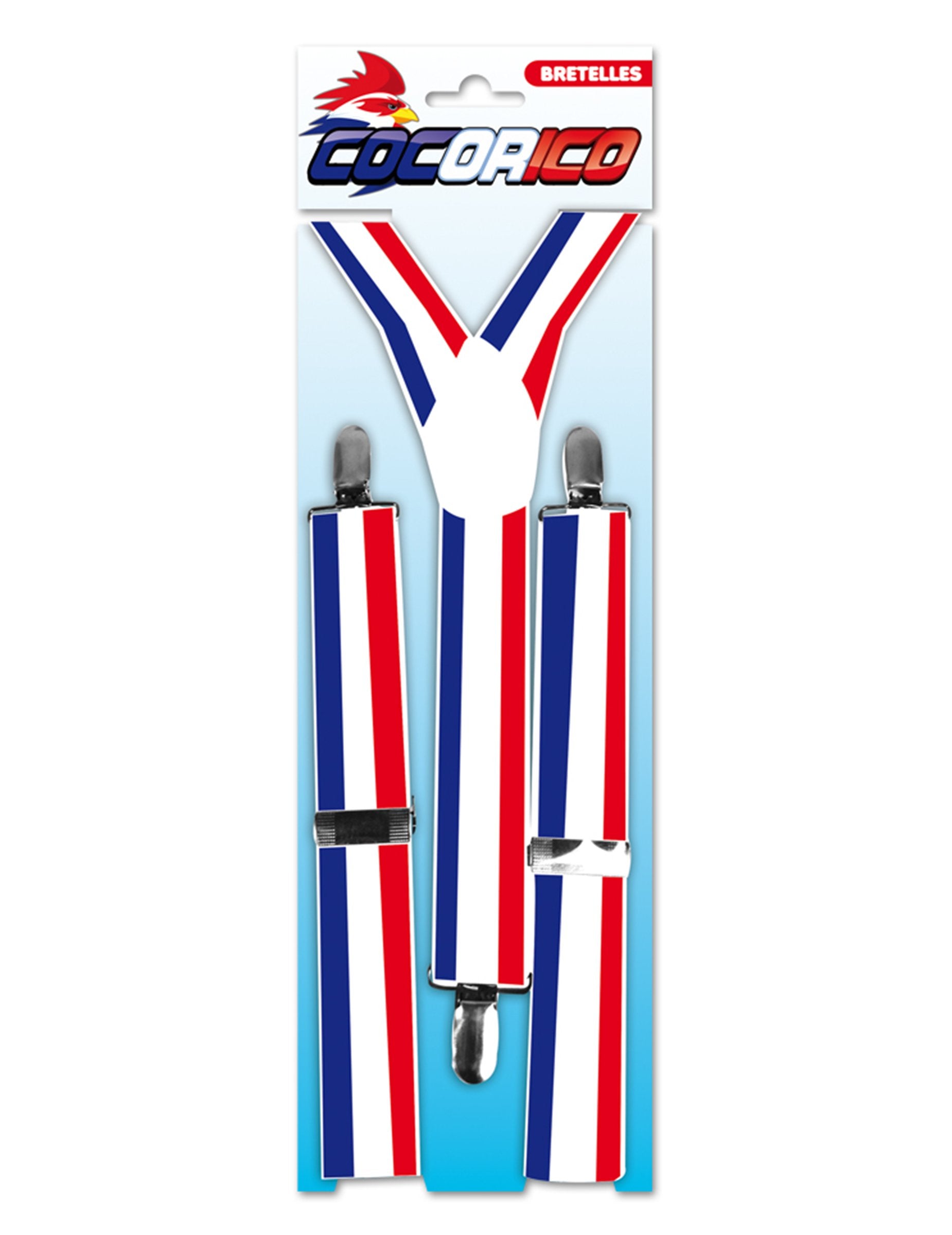 Ta par obešalnikov je za odrasle. So črtaste modre, bele in rdeče in imajo kovinske pritrdilne elemente. Ta dodatek bo kot nalašč za podporo vaše najljubše ekipe med športnim dogodkom ali za tematski večer.