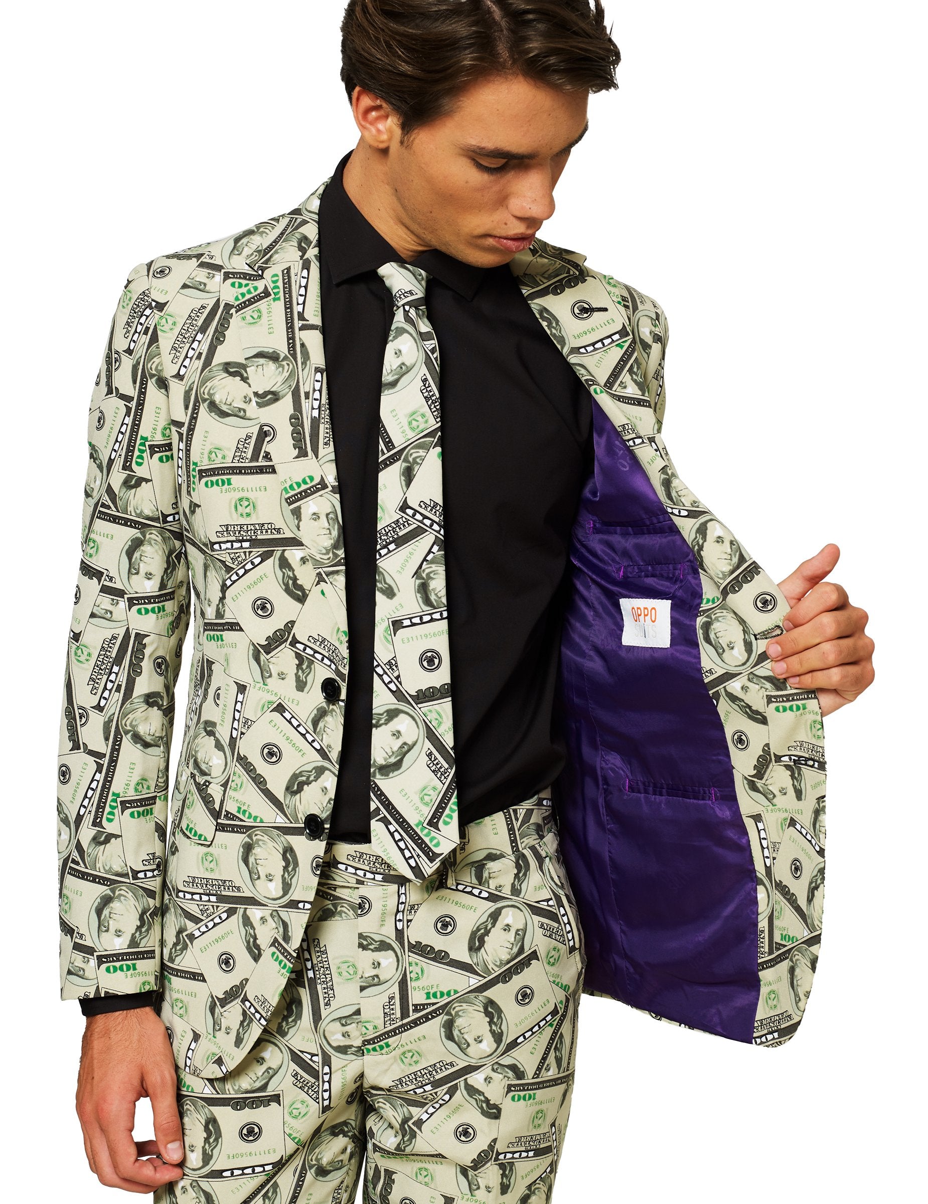 Ta kostum gospoda Cashanova za moške je nasprotne blagovne znamke. Sestavljen je iz jakne, hlač in kravate (majica in čevlji niso vključeni). Celoten kakovostni kostum je natisnjen z bančno opombo v vrednosti 100 USD. Jakna se spredaj zapre z dvema gumboma. Dokonča se s kravato, ki jo je treba privezati okoli vratu. Hlače imajo žepe, spredaj in zadaj. Z zadrgo se zlahka zapre. Ta gangsterski kostum bo kot nalašč za prikaz vašega dobrega okusa v očeh vseh med prikrito večerom.