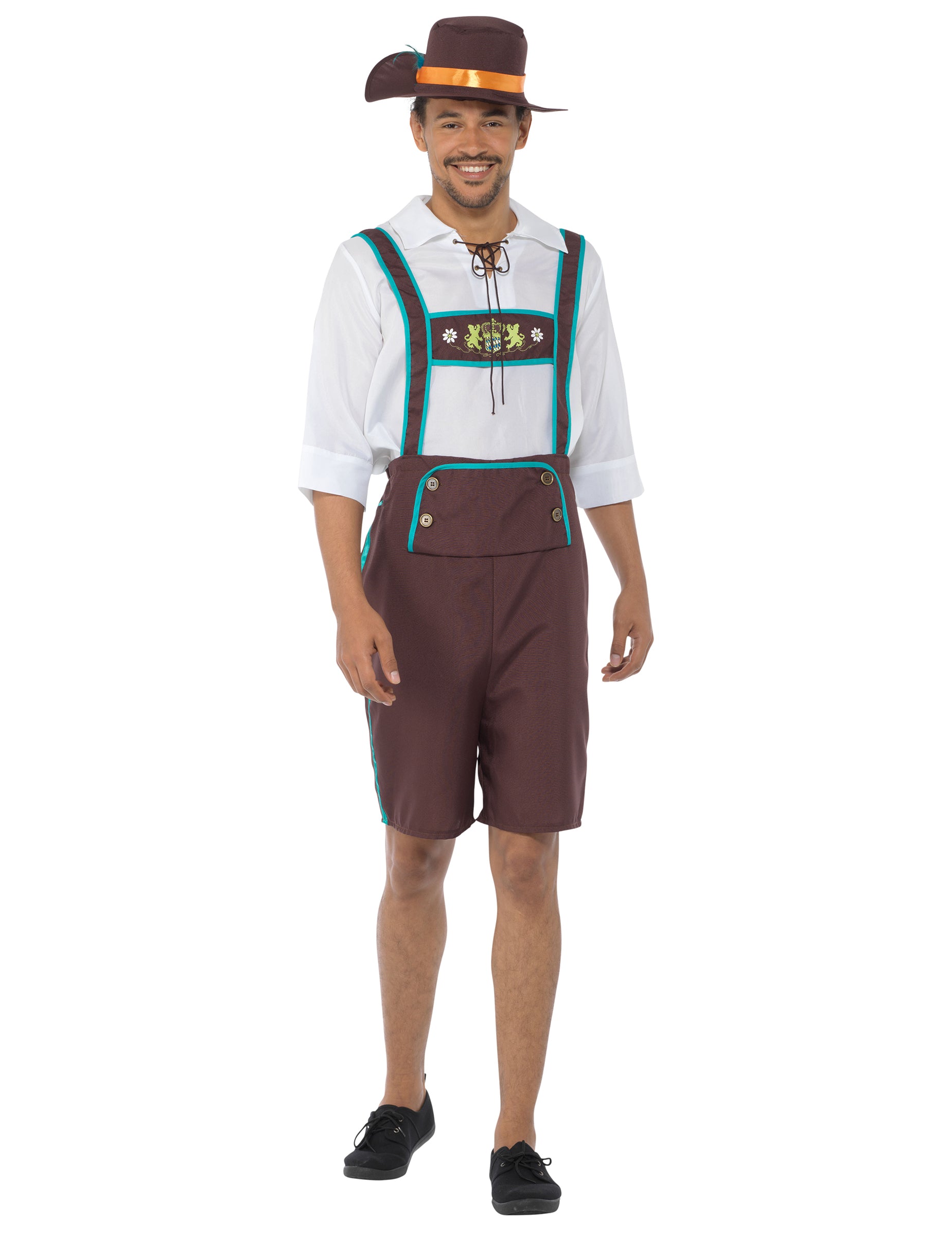 To bavarsko preobleko za moške sestavljajo kombinezon, majico in klobuk. Rjavi kombinezoni poudarjajo zelene vezi. Kratka je in bo prispela nad kolena. Na vrhu so tudi razlogi. Končno bela majica dopolnjuje to značilno obleko. Rjavi klobuk bo ta bavarski kostum prinesel končni pridih. Ta bavarska preobleka bo kot nalašč za praznovanje slavnega festivala piva!