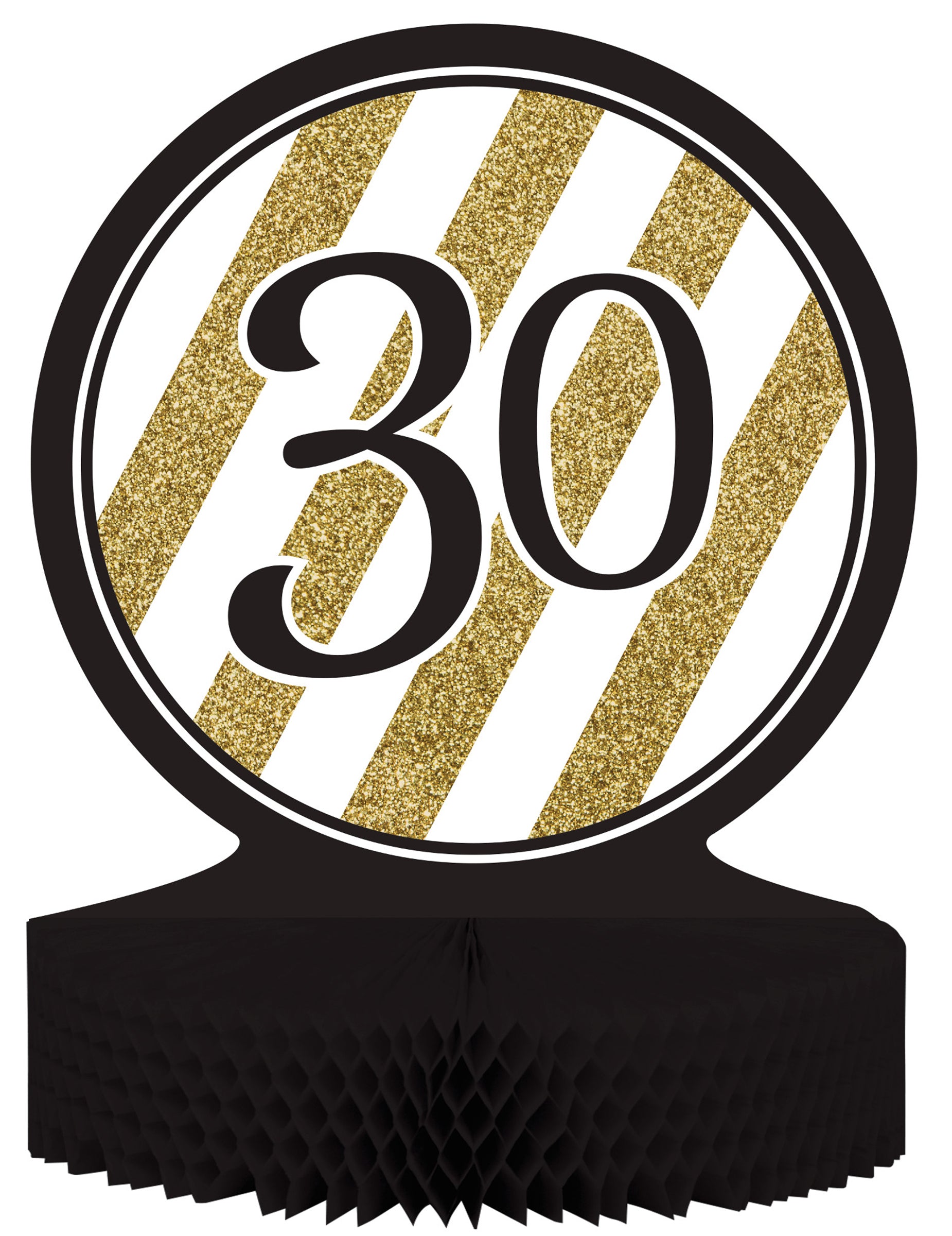 Ta miza za rojstni dan je narejena iz kartona. Sestavljen je iz kartonskega diska s premerom približno 23 cm in podpore črnega razbitega papirja, ki ga je mogoče premeriti 30 cm. Na disku s črnimi robovi je figura "30" natisnjena s spredaj / nazaj v sredini in okrašena z zlatimi pasovi. Ko se bo razvil, bo papir satja potekal zahvaljujoč majhnemu lepilnemu obližu. Ta osrednji del bo popoln sredi elegantne in zlate dekoracije na 30. mestu ljubljene osebe!