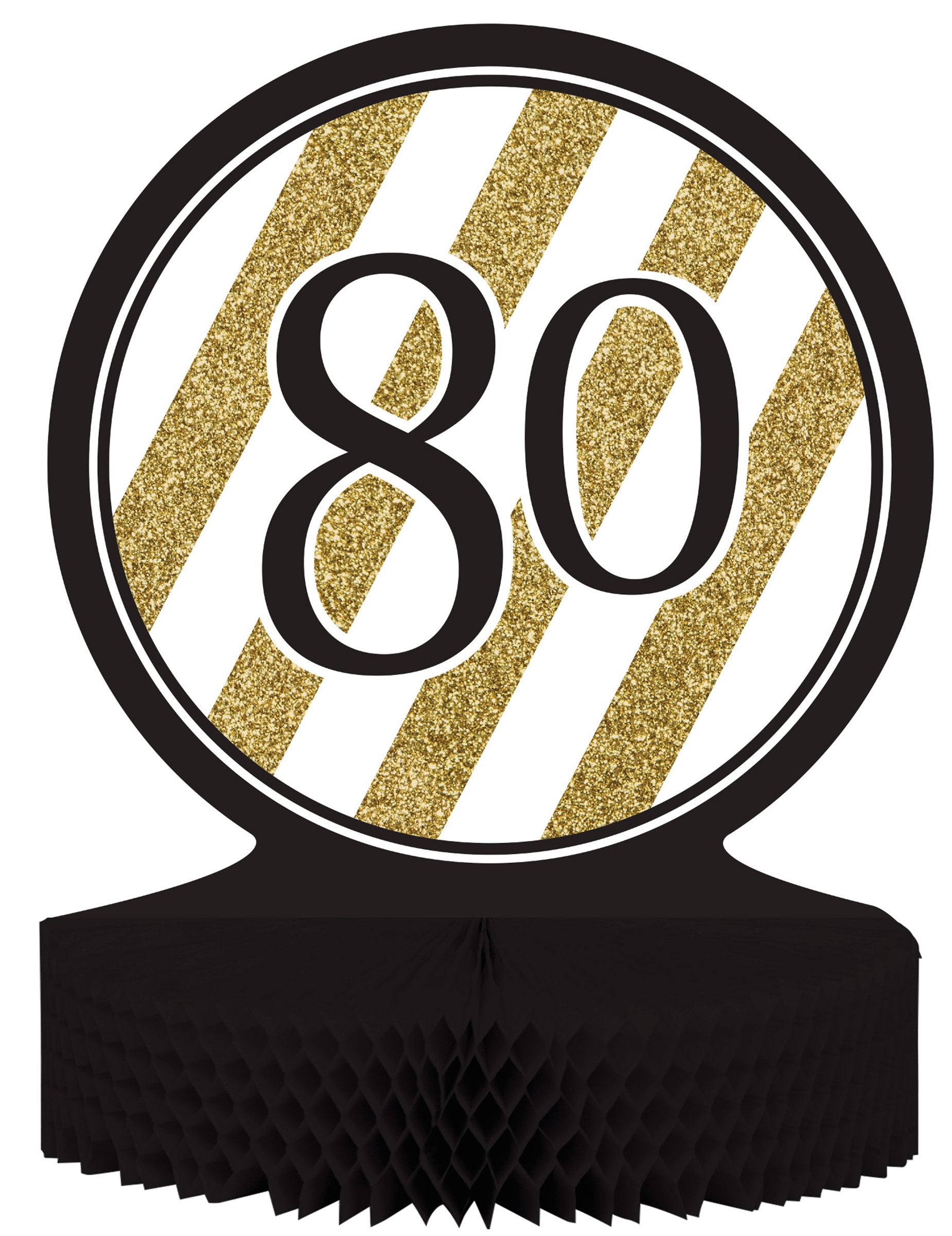 Ta dekoracija je 80 -letni namizni center. Je črna in meri približno 30 cm. Sestavljen je iz diska in papirja za satje. Na disku se pojavijo tudi odtisi belih prask in učinkov z bleščicami, kot tudi na figuro "80". Ta namizni center bo ob 80. rojstnem dnevu odlično dopolnil vašo dekoracijo!