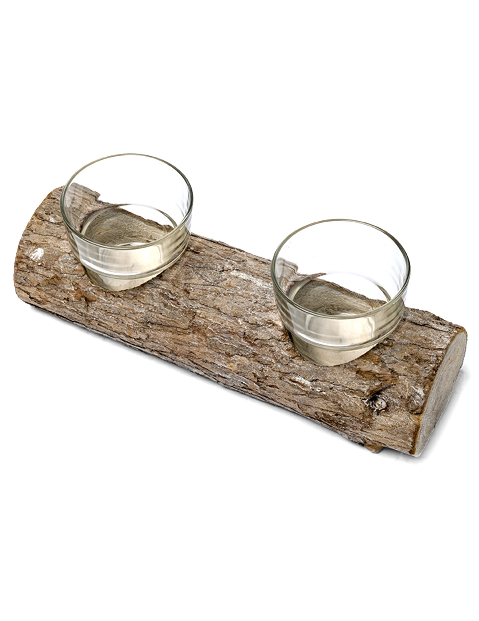 To veličastno držalo za sveče je sestavljeno iz pravega majhnega lesenega hloda in dveh steklenih fotofor. Leseni hlod je dolg približno 21 cm in ima dve zarezi, da bi lahko sprejel fotofor. Majhna očala merijo približno 6 x 6 cm po vsakem. V notranjost lahko postavite majhen grelnik čevljev. To vrhunsko rustikalno držalo za sveče bo kot nalašč za okrasitev središča vaše mize v zimskem večeru ali za romantično dekoracijo za vašo poroko. Naravni izdelek, ki ima lahko nepopolnosti (različen odtenek, vozli v lesu, lubje, ki izstopa).