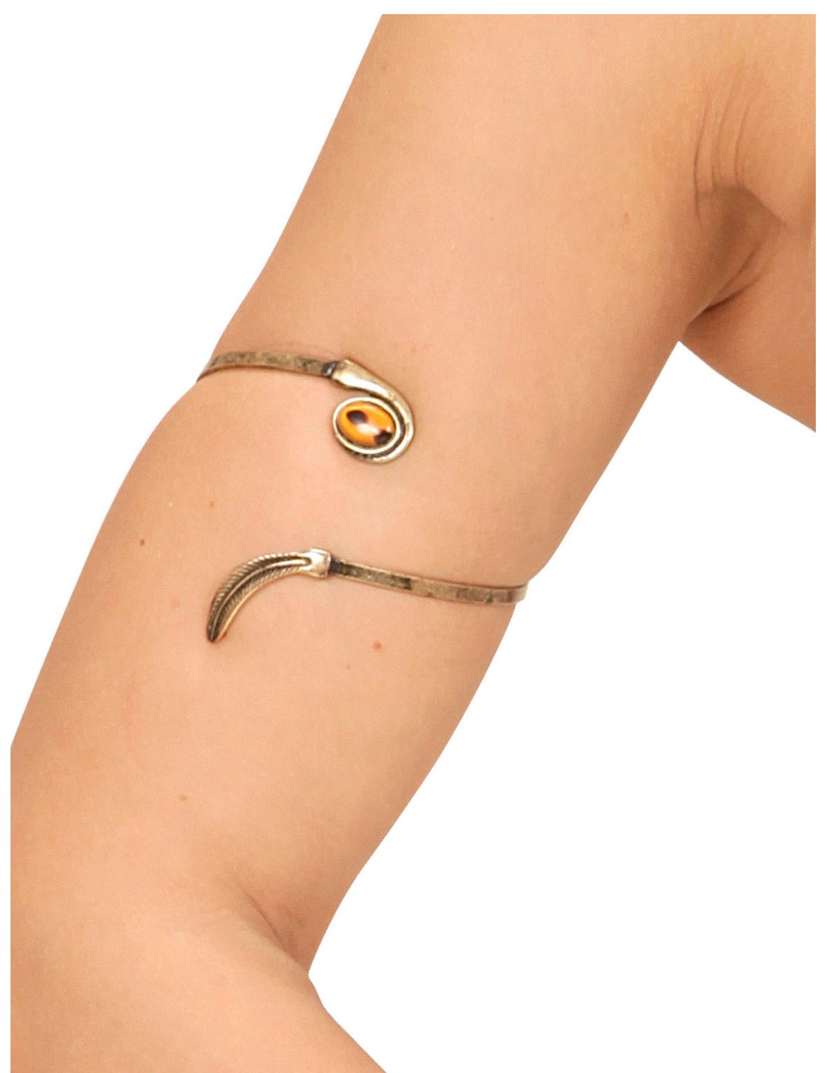 Ta zgornja zapestnica za odrasle je izdelana iz kovine. Je v barvi starega zlata. En konec je v obliki peresa, drugi pa ima lažen oranžen kamen.