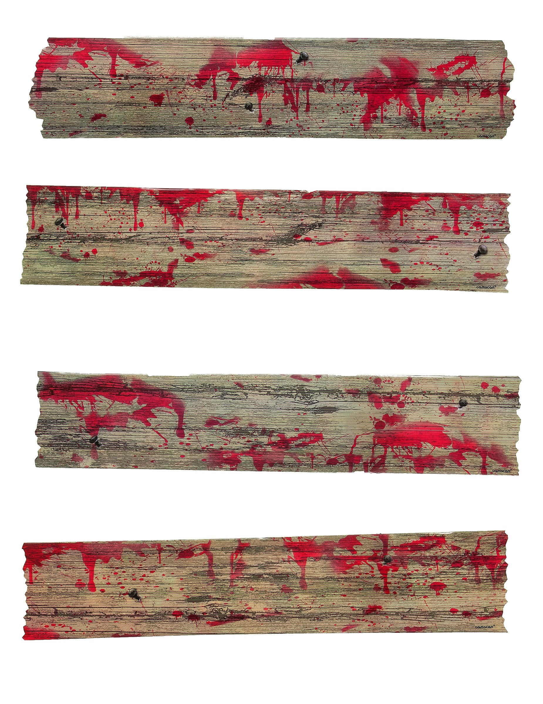 Ta komplet je sestavljen iz 4 okraskov. V medenem PVC predstavljajo lesene deske, obarvane s krvjo! Za najbolj grozljiv učinek jih pritrdite na svoje okno pod kotom in jim pustite, da občutijo vaš večer za noč čarovnic! Izmerijo približno 70 x 12 cm in so natisnjeni le spredaj. V notranjost vstavite moteče vzdušje in objavite barvo: noč čarovnic bo letos grozno!