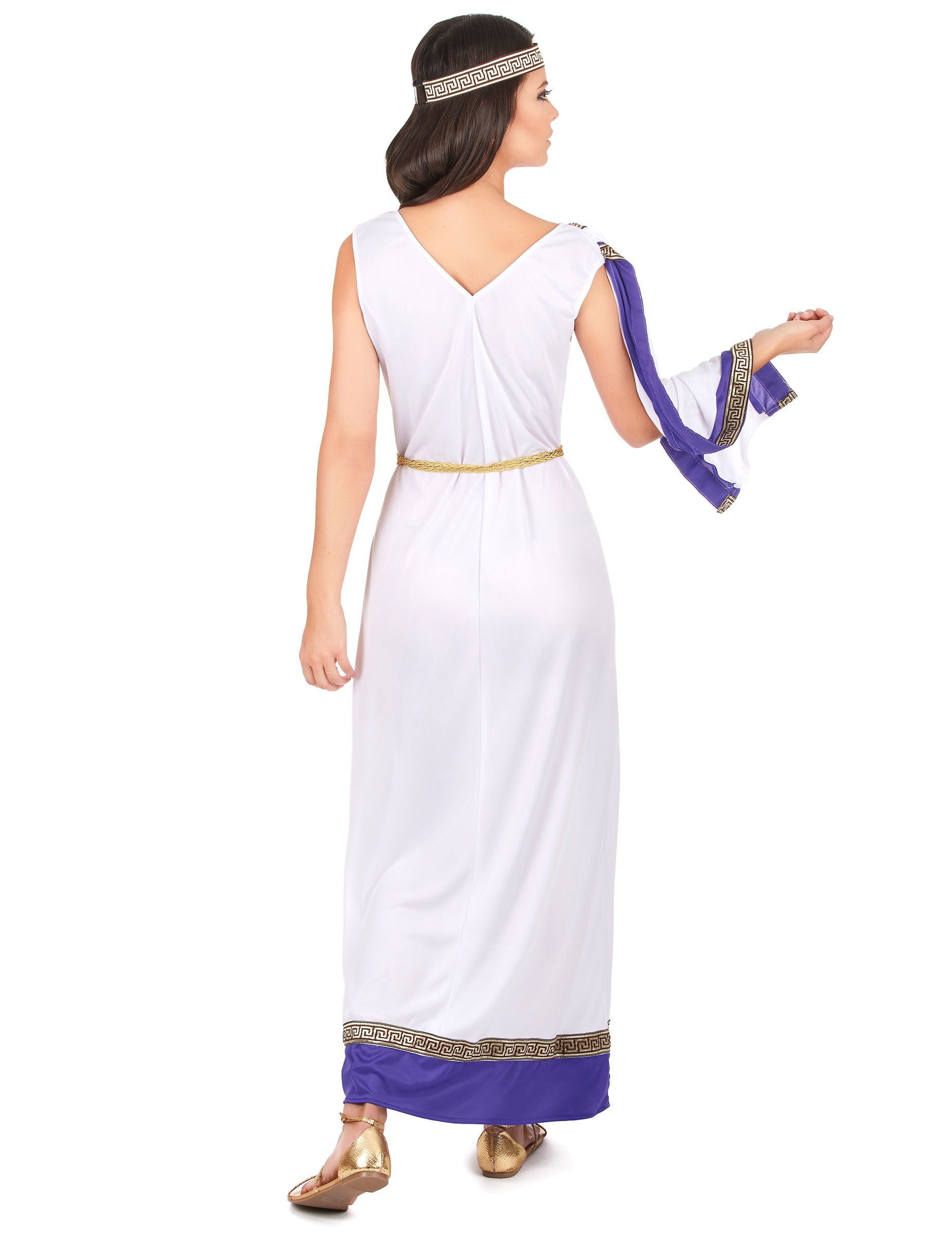 Ta rimski kostum za ženske vključuje obleko, pas in trak za glavo (ne vključujejo čevljev). Obleka je dolga in brez rokavov. Bela barva, dno obleke je vijolična in zlata. Majhna toga, prišita na rami, lepo pade vzdolž roke. Ta toga je obrojena tudi z vijolično in zlato v opomniku na obleko. Pas je sestavljen iz drobnega pletenega zlata, obarvanega kabla. Privezan bo okoli vašega pasu, da ga bo upognil. Končno je trak za glavo elastičen in konča vso to preobleko. Ta kostum je na voljo v eni velikosti in bo ustrezal 40/42. Čas preoblečenega večera med prijatelji, s tem čudovitim kostumom potopite nazaj v obdobje Rimljanov. Ognjevani boste!