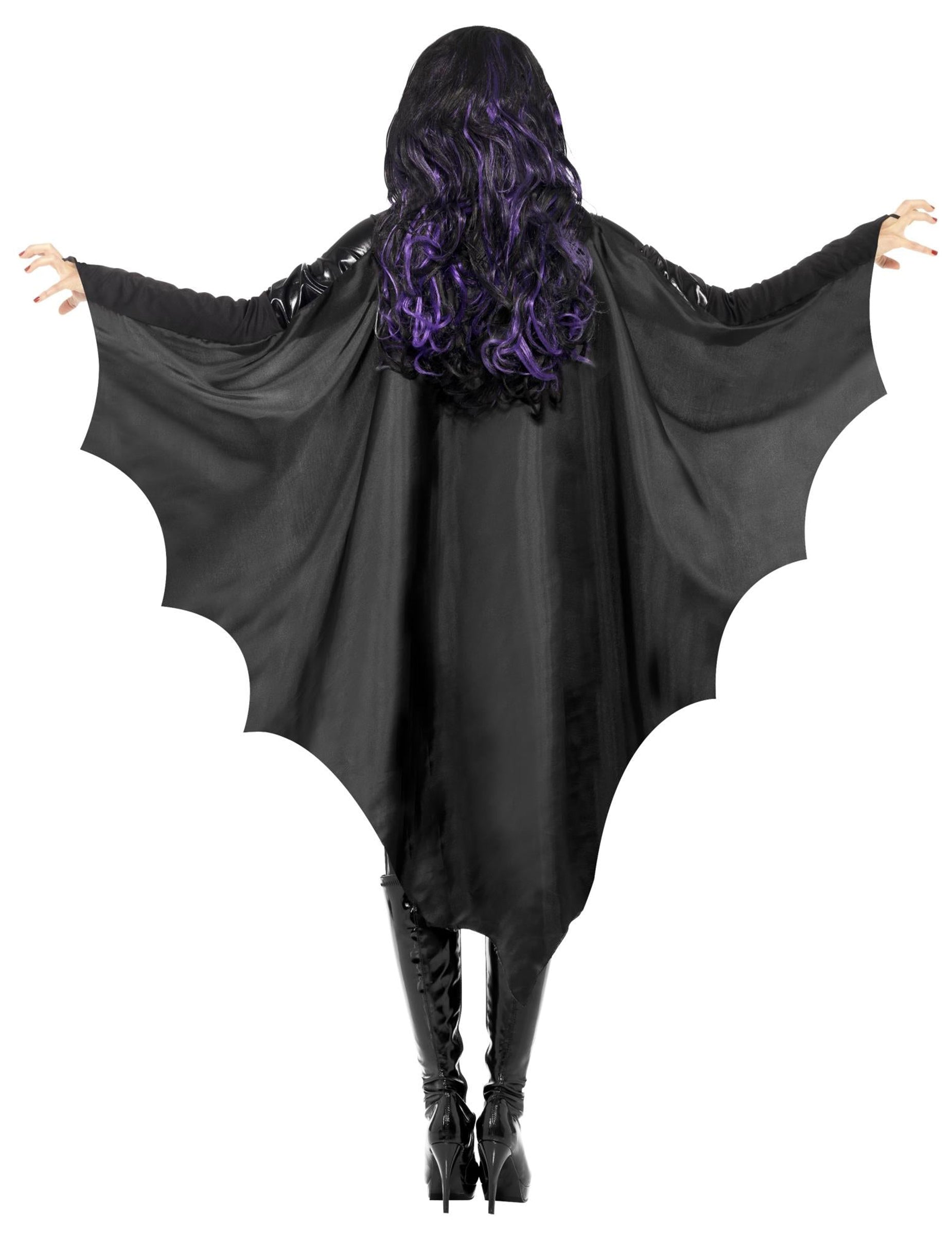 Ta netopir za odrasle je izdelan iz črne satenaste tkanine (vključen je samo ogrinjalo). Izrezan je v nasvetih, da posnema netopirje. Ta ogrinja se vzdržuje na rokah z manšetami. Na ta način se bo ogrinjalo odvijalo, ko odprete roke. Na ravni ovratnika se zapre tudi s praskom. Meri približno 118 cm v dolžini. Ta ogrinjala bo kot nalašč za dokončanje obleke za netopirje na noč čarovnic.