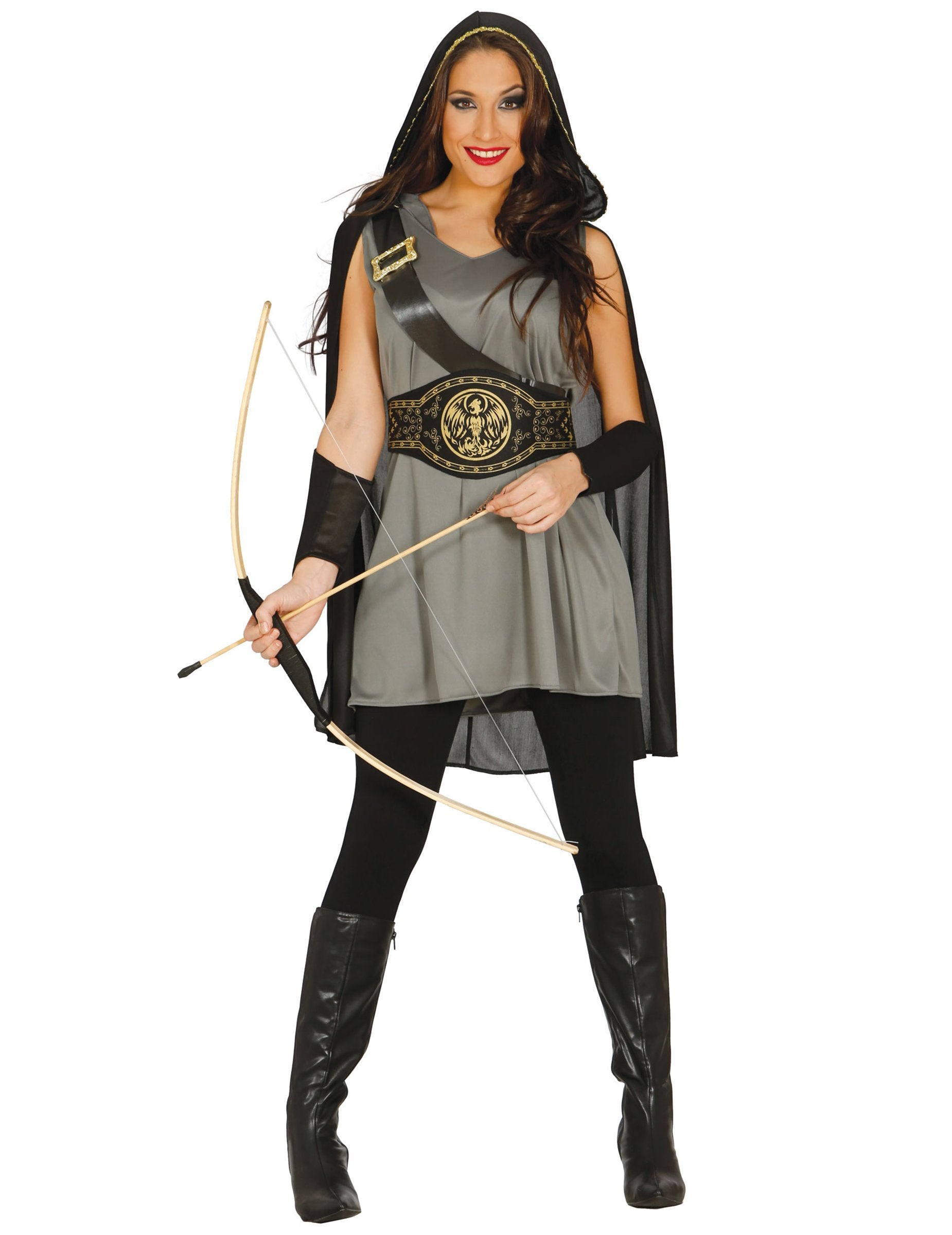 Ta lokostrelski kostum za ženske vključuje obleko z ogrinjalom, dvema manšetama in pasom (nogavice, lok in škornji niso vključeni). Obleka je siva, kratka in brez rokavov. Tkanina je tekoča in bo prijetna za nošenje. Črni ogrinjalo je opraskano po ramenih in ima veliko zlato kapuco, ki bo pokrivala vse vaše lase. V diagonali oprsje je prišita ramena usnjenega videza. Lažna zlata zanka je tam. Manšete so narejene iz črne pene z elastičnim delom, da jih enostavno postavite. Končno bo moral pas privezati v hrbet in predstaviti čudovit zlati tisk, ki predstavlja predvsem feniks v svojem središču. Ta zelo ženstvena preobleka Archère bo idealna za igranje razbojnikov Woods med prikrito prireditvijo.