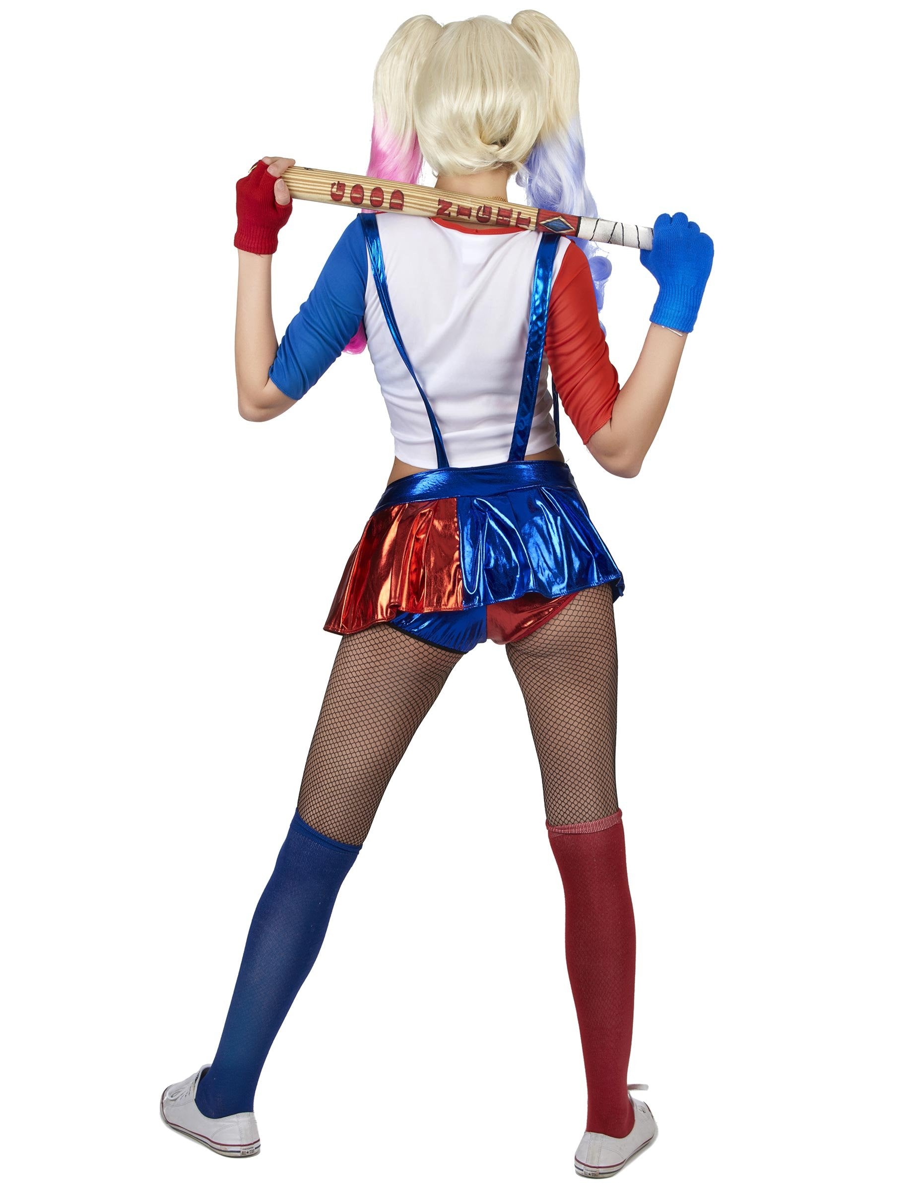 Ta diabolični arlekinski kostum je namenjen ženskam. Sestavljen je iz vrha in krila/hlačk z obešalniki. Zgornji kratek je rdeč, modro in belo s črnim tiskom na robu pisanja: "Očetov Lil Hudič". Krilo/spodnje hlačke so hlačke z mini skirjem, prišitkom zgoraj. Dno je popolnoma sijoče v modri in rdeči. Na strani je prisotna zadrga, da jo zlahka postavimo. Pasme so prišiti za dokončanje preobleke. Ta kostum Arlequine Quinn bo kot nalašč za večer na temo kinematografije, ne boste ostali neopaženi!