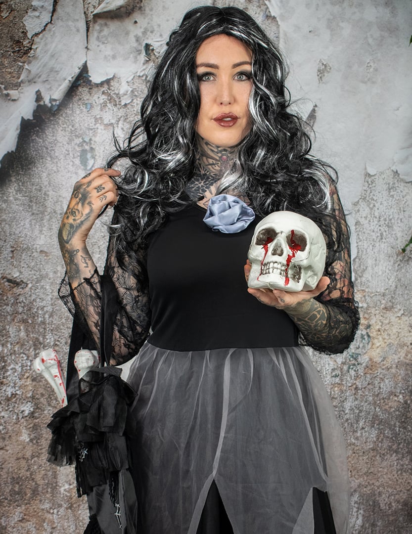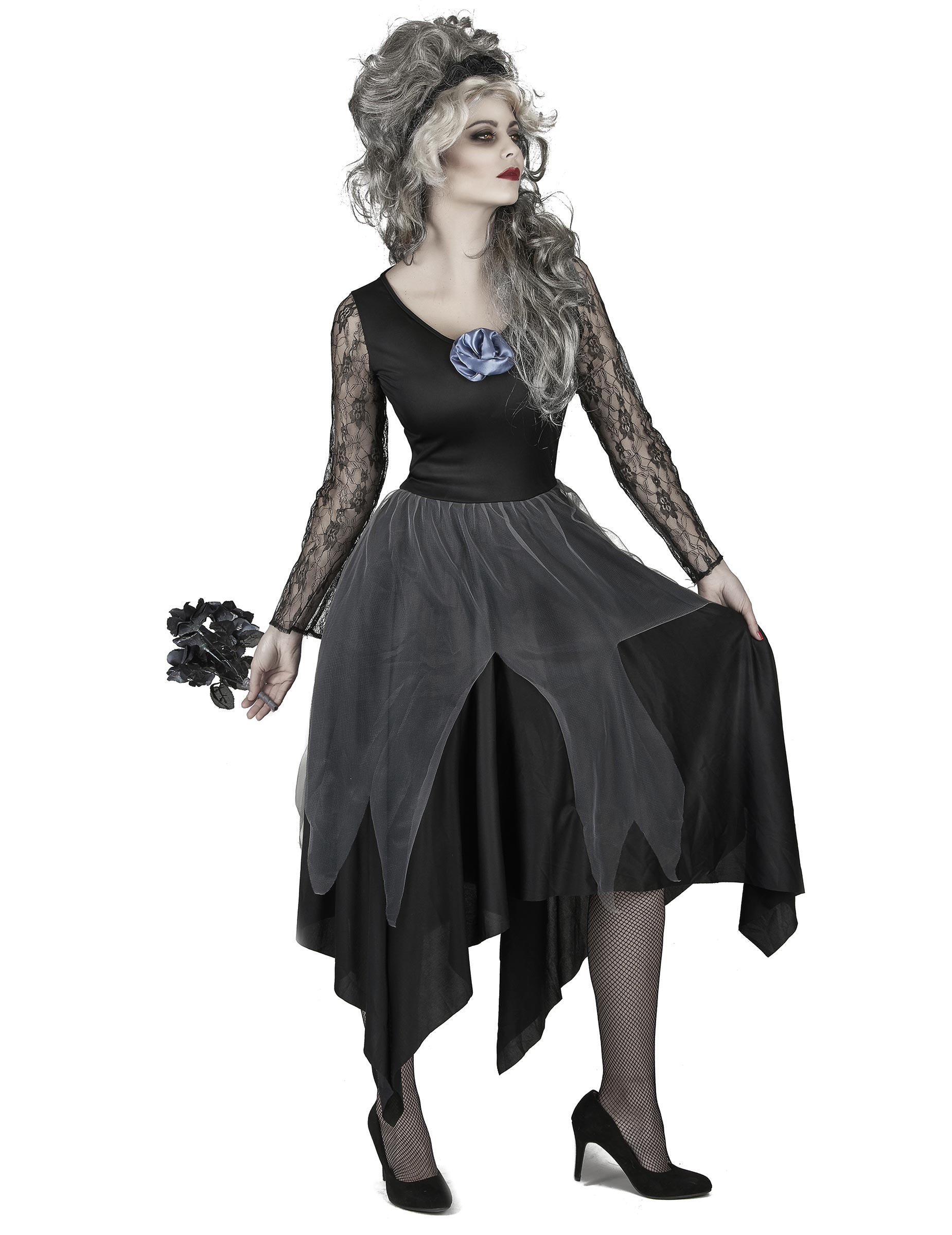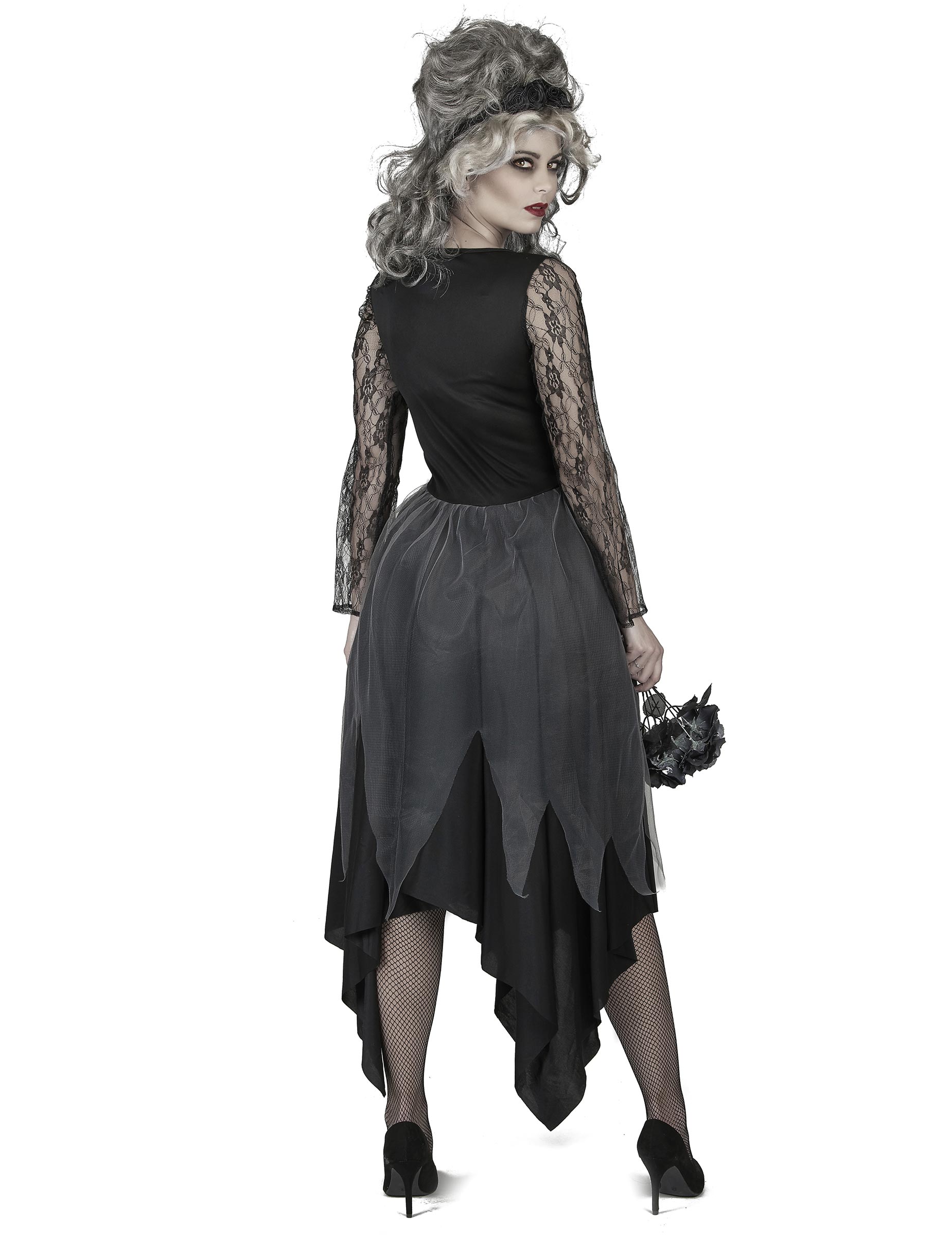 Ta poročni kostum za noč čarovnic za ženske vključuje obleko in pokrivalo (šopek, lasulje, hlačne nogavice in čevlji niso vključeni). Obleka je črna predvsem in zategnjena na pasu. Siva vrtnica okrasi izrez, dolgi rokavi pa v črni čipki. Del krila je vse v glasnosti, zahvaljujoč prekrivnim prekrivanjem tila in črni fleksibilni tkanini. Poglavje je sestavljeno iz trakove za glavo, okrašeno z vrtnicami v satenasti črni tkanini. Ta komplet vas bo ob svoji zabavi za noč čarovnic najbolj temno od neveste.