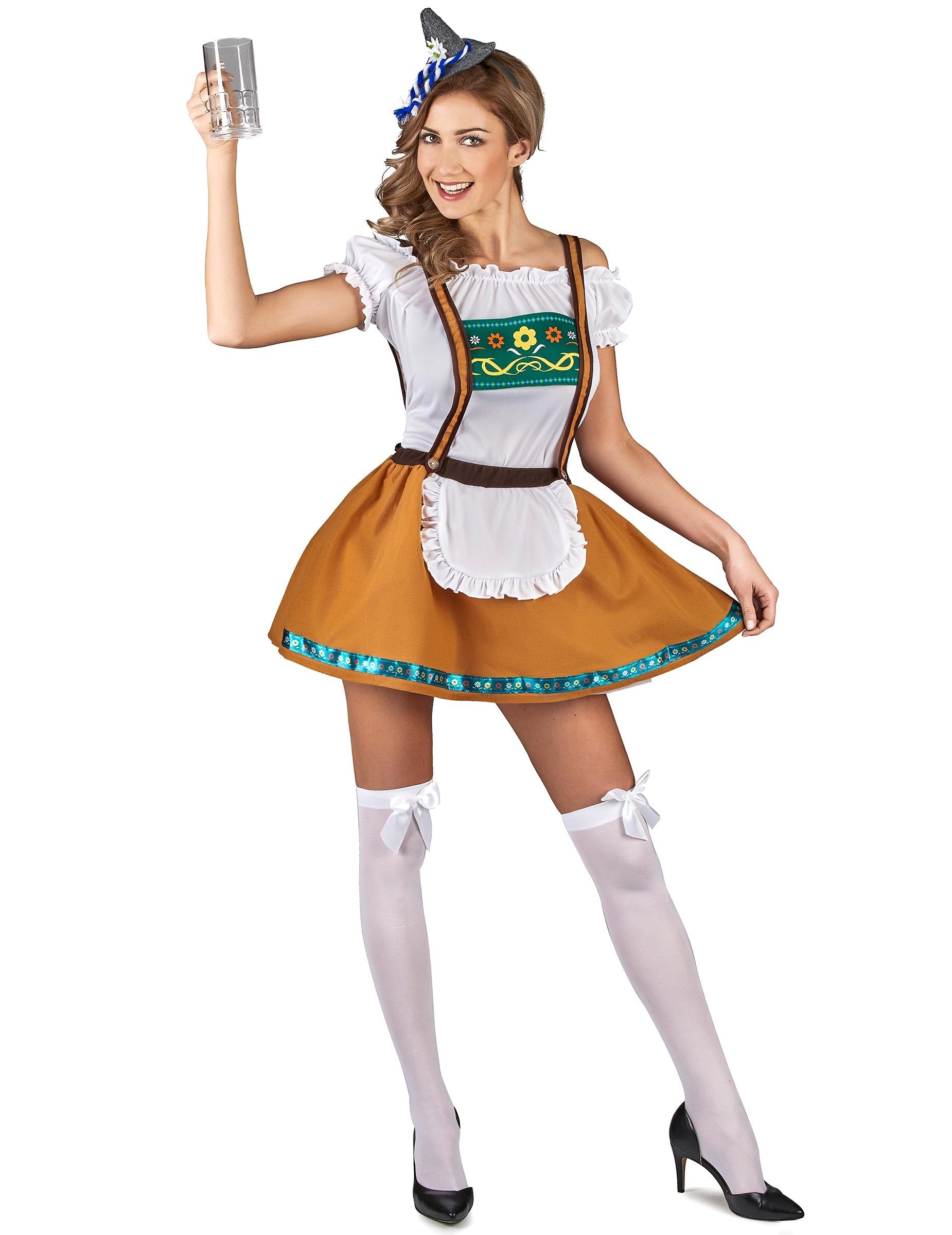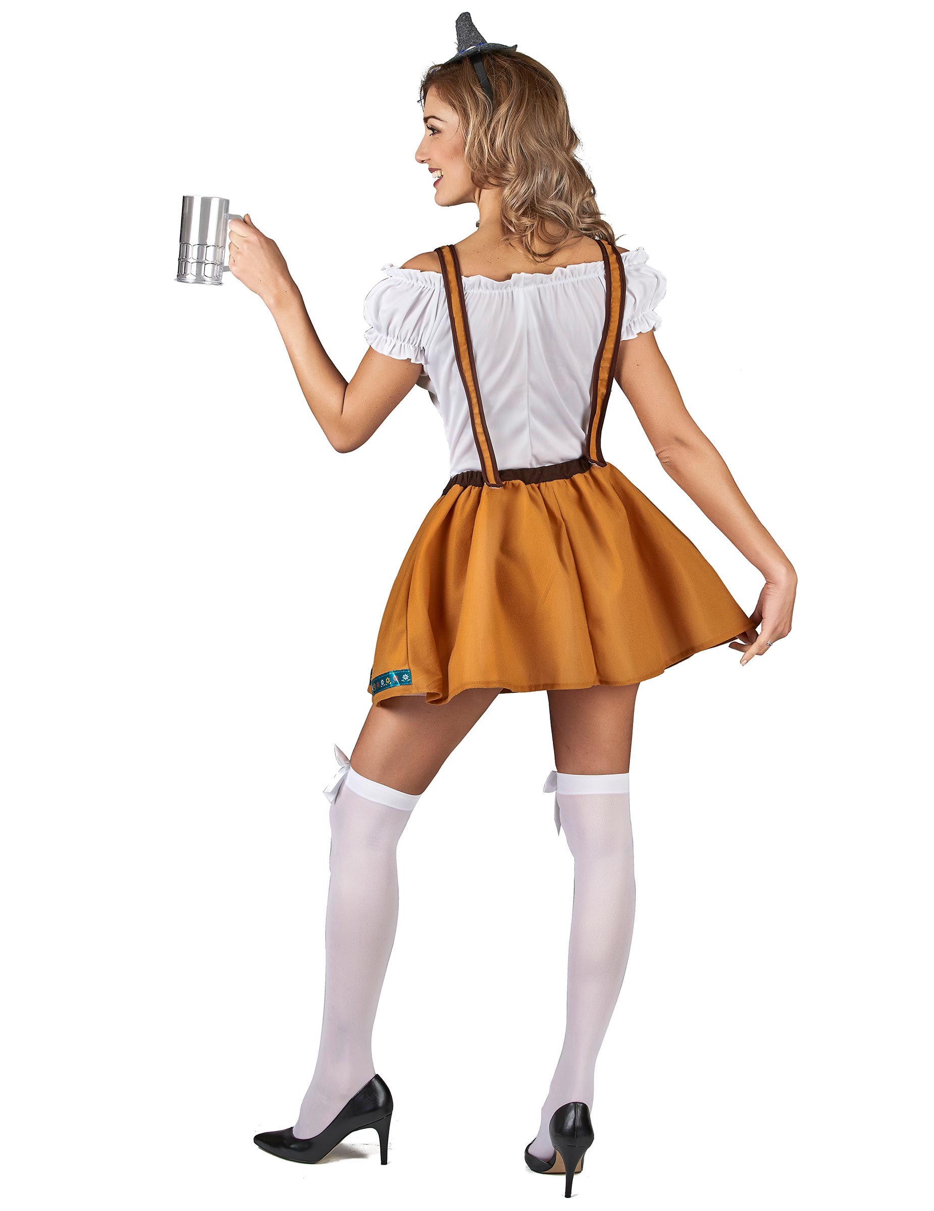Ta kostum Bavaroise za ženske vključuje vrh in krilo (klobuk, nogavice, čevlji in vrč, ki niso vključeni). Beli in kratek zgornji del ima raven rokavov rokavov in elastičnega izrezov. Krilo elastične velikosti je v svetlo rjavem fleksibilnem filcu z zeleno obrobo. Spredaj je prišit predpasnik. Trakovi; S krilom so nastavljivi zaradi praske, ki je prisotna v zadnjem delu. Če želite nazdraviti na festivalu piva, bo ta seksi preobleka idealna! Nasvet: Za še večjo količino priporočamo, da uporabite spodnji del (prodajate ločeno)