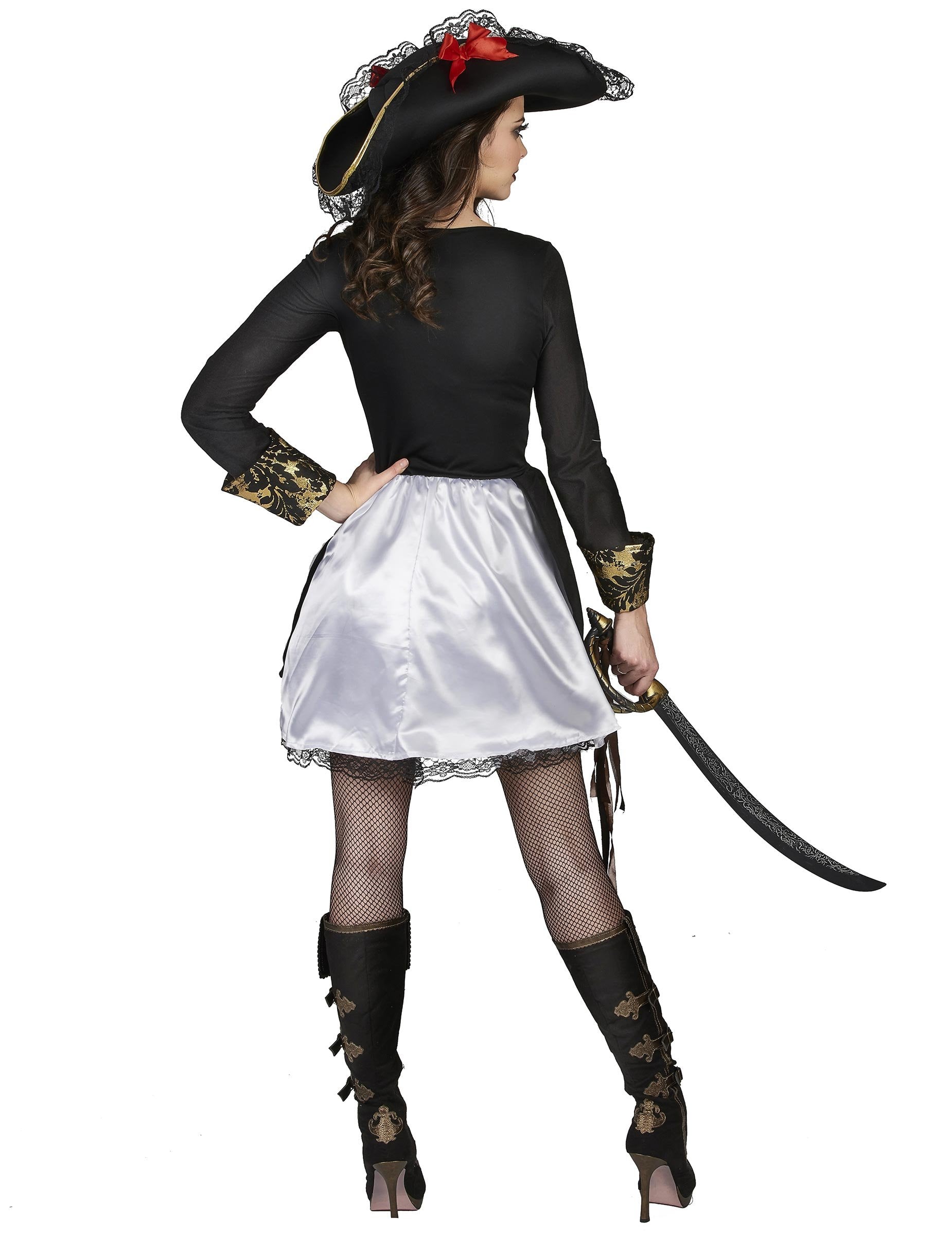 Ta seksi gusarski kostum za ženske je sestavljen iz obleke in klobuka (hlačne nogavice, škornje in sablja niso vključeni). Kratka obleka je ukrivljena na pasu in zabuhla iz krila. Dolgi rokavi so položili z baročnimi zlatimi vzorci, ki jih najdemo na spodnji strani. Črni deli so narejeni iz prilagodljivega filca, medtem ko so beli elementi sateni. Pod krilom bela klobučevina, obložena s črno čipko, daje veliko šik celotnim. Nasvet: Za še več volumna za krilo priporočamo dodajanje dodatnega spodnjega dela (prodane ločeno). Črni klobuk, obremenjen s čipko in okrašen z majhnimi satenastimi rdečimi vozli, bo ustrezal glavnim stolpom blizu 60 cm. Njegov penasti material mu bo zagotovil optimalno podporo. Priložnost za prikrito zabavo boste zagotovo najbolj prepričljivi s to seksi gusarsko preobleko!