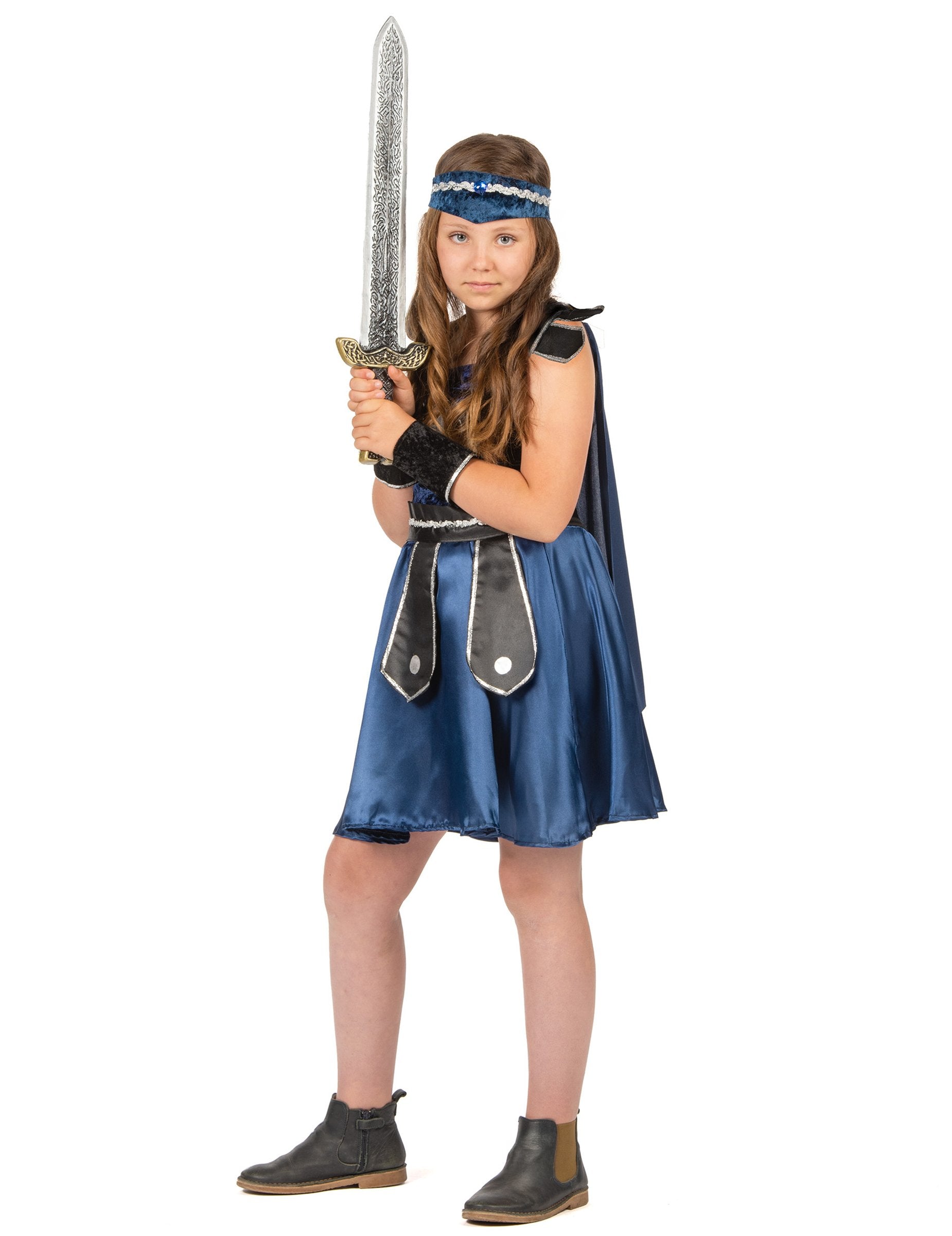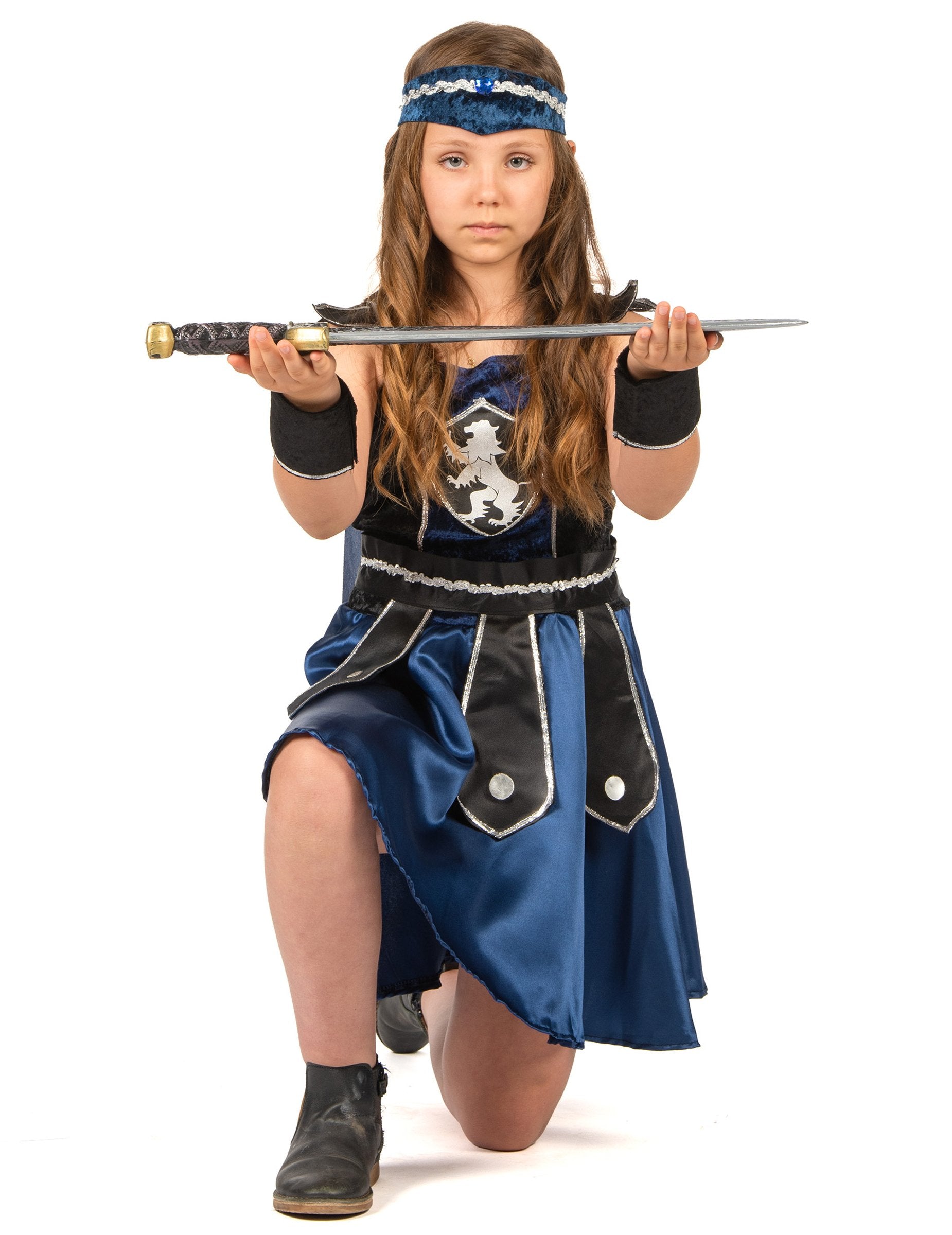 Ta viteška preobleka za dekle je sestavljena iz obleke, ogrinjala, par manšete, pasu in pasice (čevlji niso vključeni). Modra in črna obleka je v žametnem učinku na vrhu in satena na dnu. Značka je spredaj prišita. Temno modro ogrinjalo se praska na zadnji strani obleke. Pas je črn in srebrni, z nasveti spredaj. Zapre se z veliko prasko. Črni manšeti žametni učinek se tudi zaprejo z uporabo prask. Elastični transparent je polnoč modra in srebrna. Ta viteški kostum bo kot nalašč za karneval.