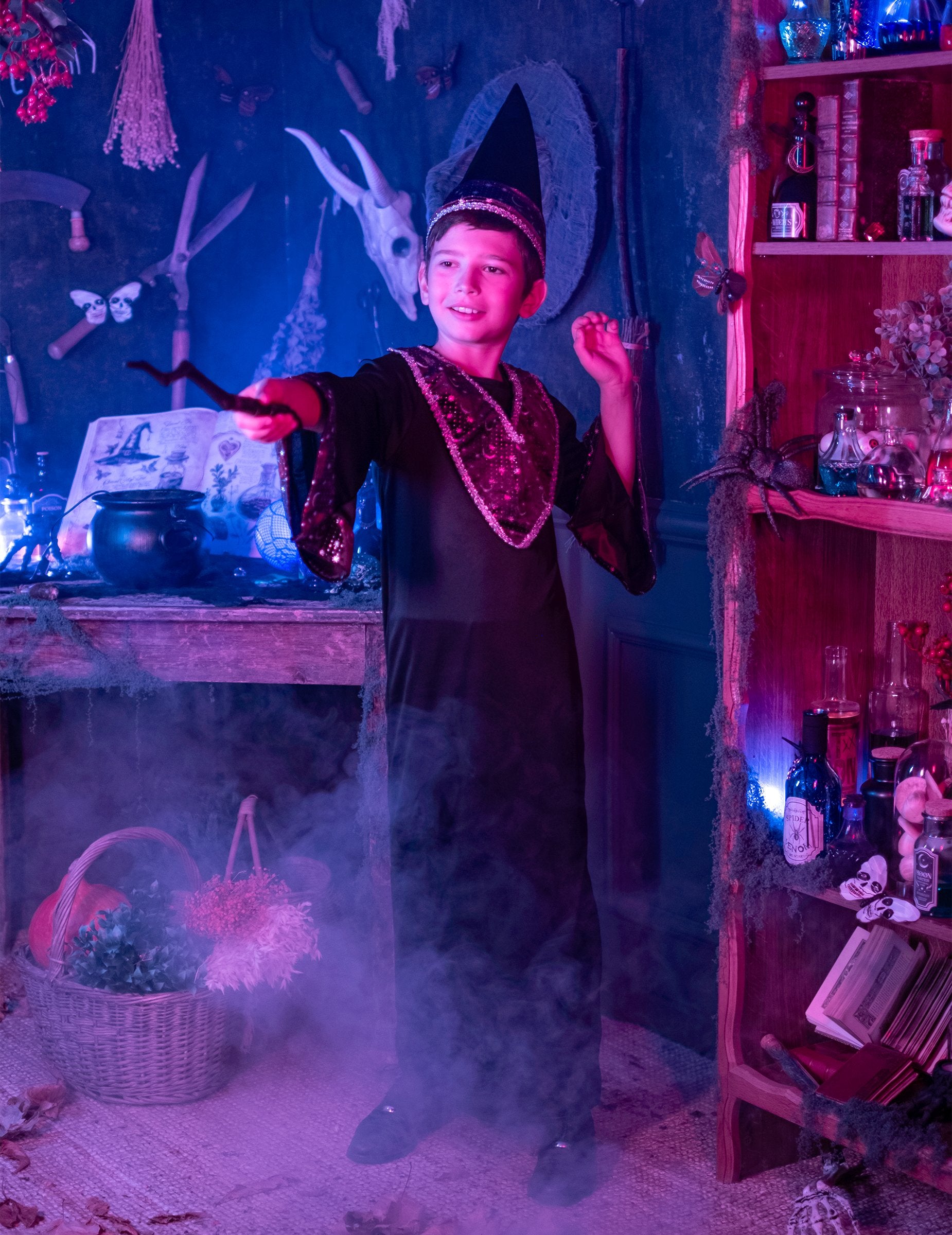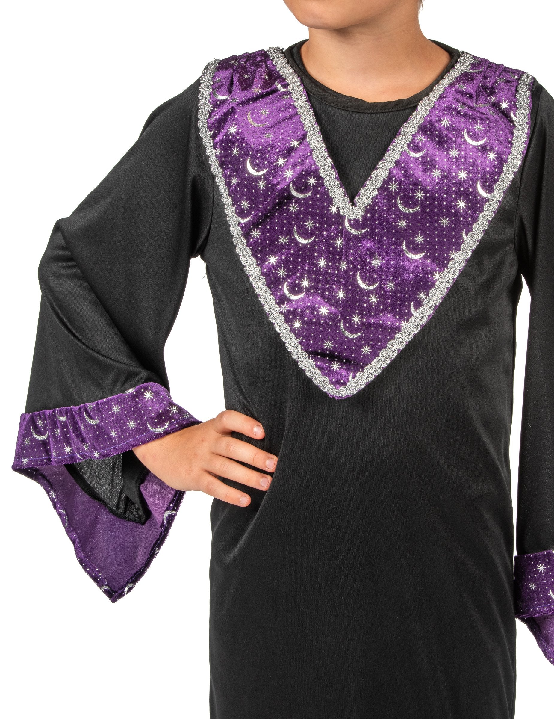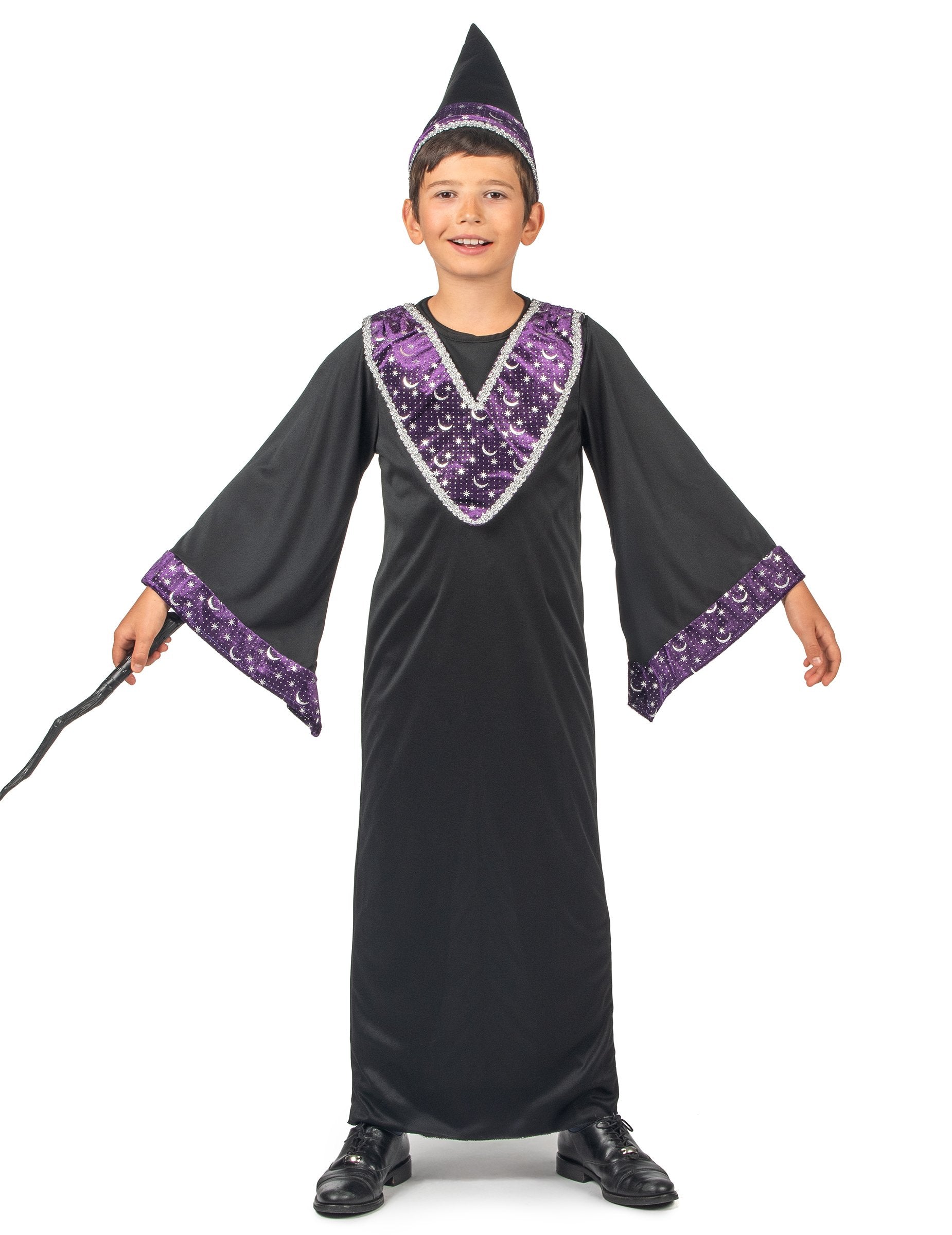 Ta čarovniški kostum je namenjen otrokom. Sestavljen je iz dolge obleke in koničastega klobuka. Obleka je povsem črna. Vijolični ovratnik s srebrnimi zvezdami praska na ramenih. Konci rokavov se ujemajo z ovratnikom. Klobuk je povezan z obleko. Ta čudovit čarovniški kostum bo kot nalašč za noč čarovnic, karnevala ali za ponudbo na rojstni dan.
