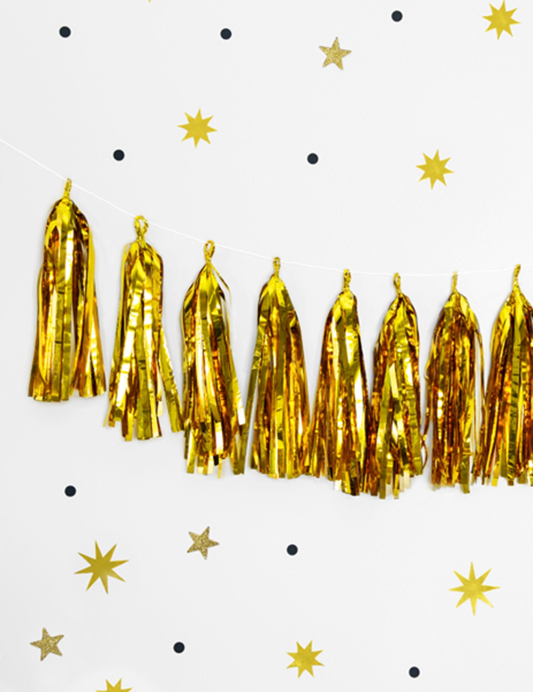 Ta tossel Garland je sestavljen iz 12 zlatih poplavnih pompomov v ognju. Ta girlanda je treba narediti sami. Ko bodo pompomi ustvarjeni, jih boste morali postaviti le na trak, ki je na voljo za ustvarjanje girlanda. Ta trak meri približno 1,5 m dolžine. Ta tossel Garland bo kot nalašč za dokončanje vaše zlate dekoracije za praznični čas!