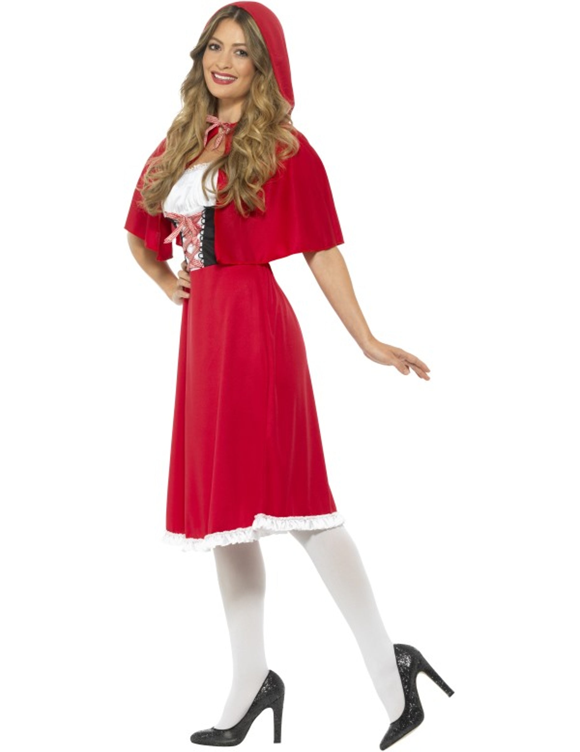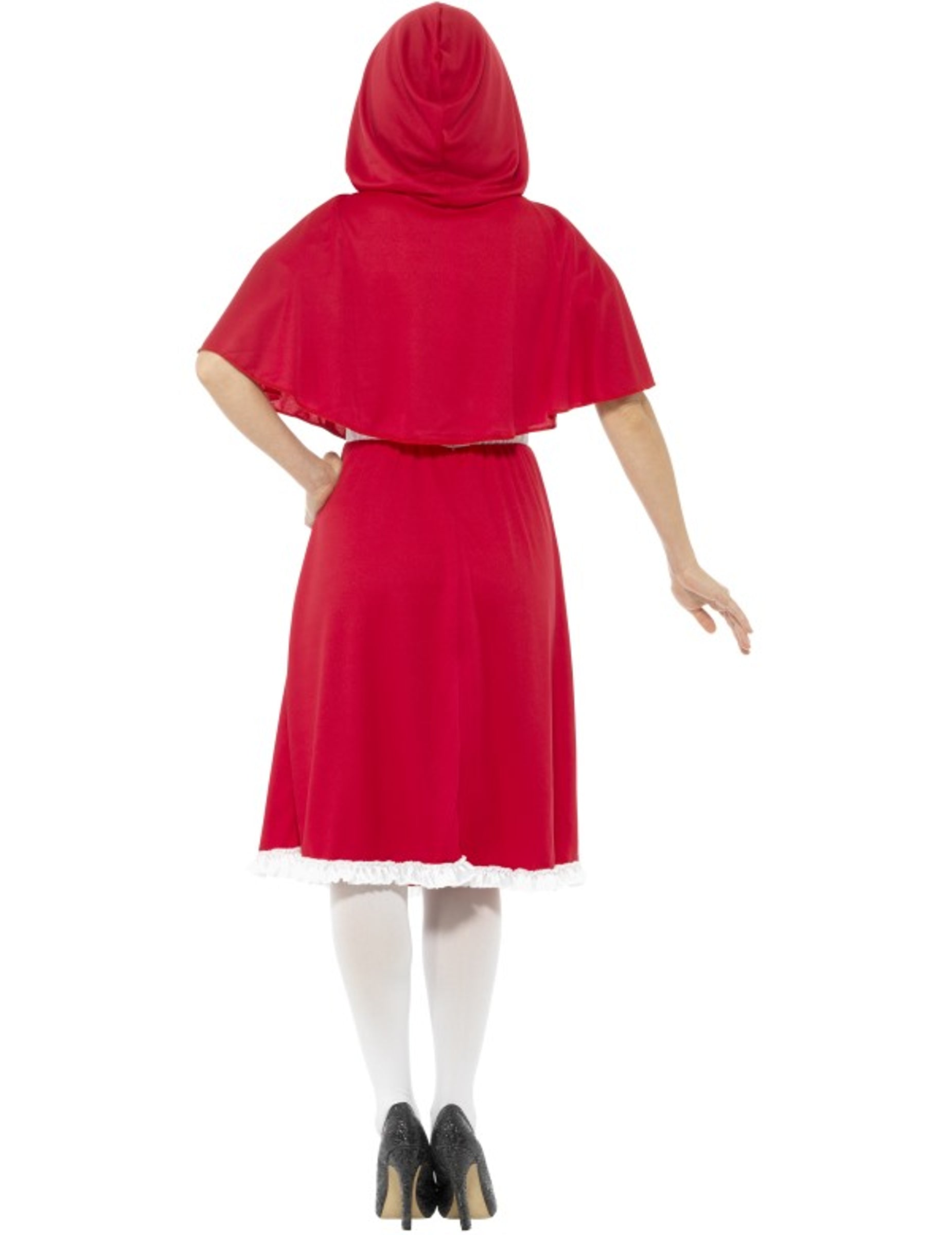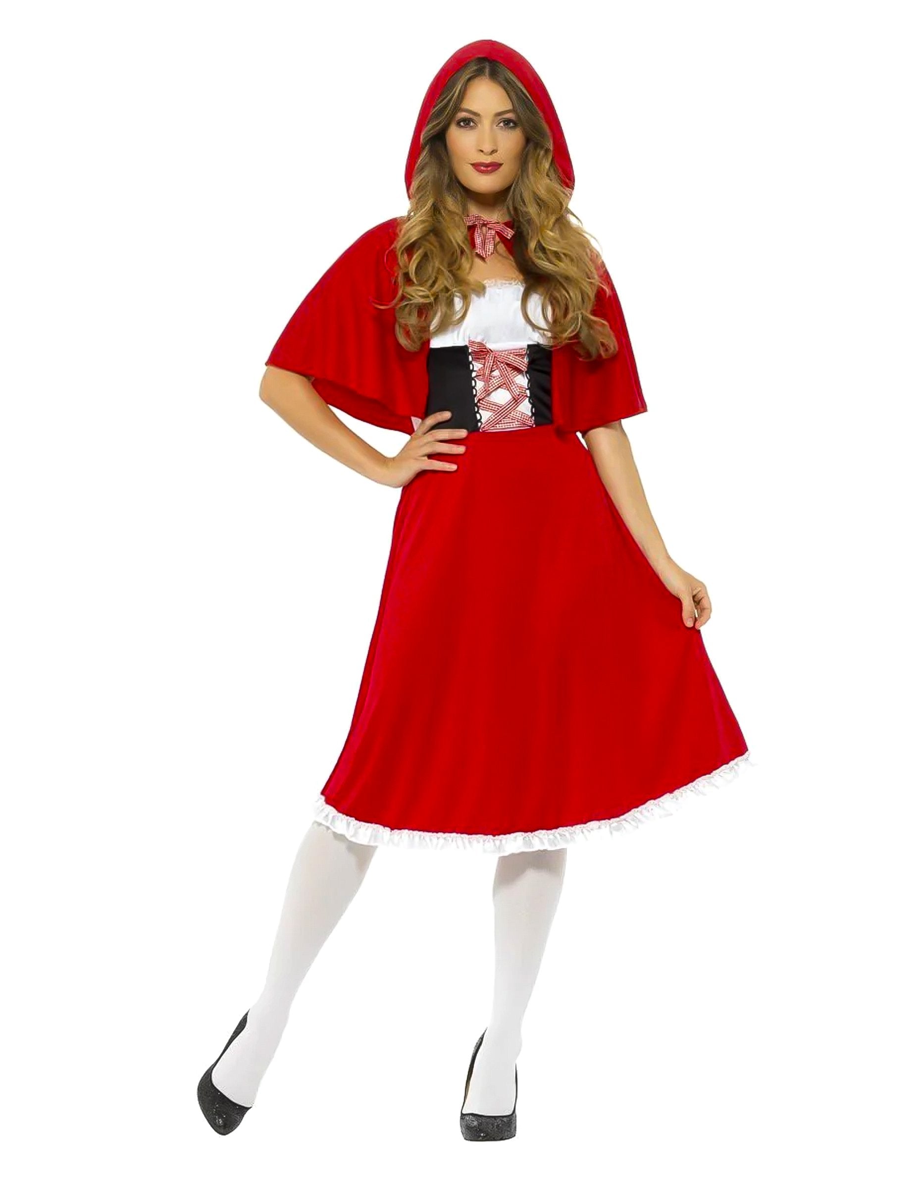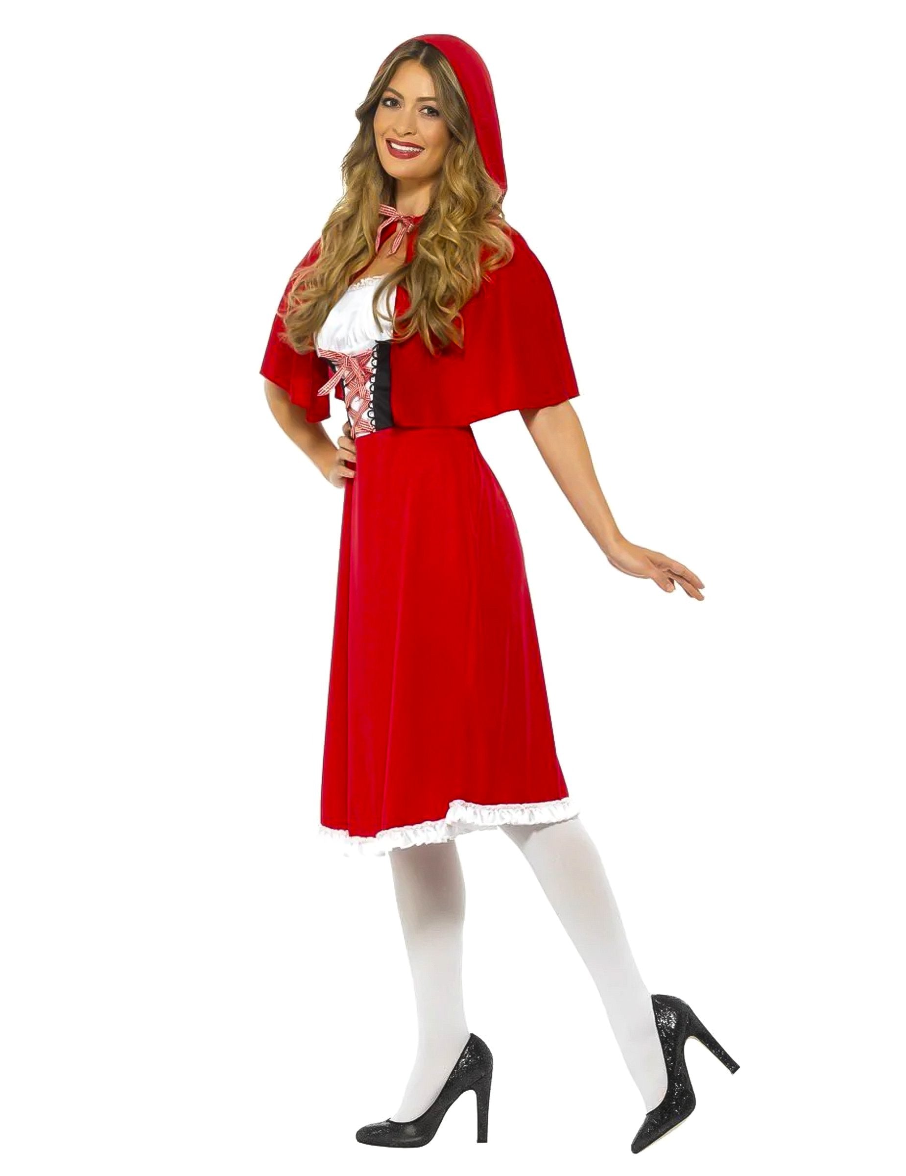 Ta kostum iz rdečega kaperona za ženske vključuje obleko in ogrinjalo (čevlji in nogavice niso vključeni). Obleka je sestavljena iz črno -belega vrha, na katerem je spredaj prisotna vezalka in rdeče krilo. Zlahka je obveščena zahvaljujoč zaprtju zadaj. Rdeča ogrinjala s kapuco dopolnjuje to obleko. Zapre se z vezanjem dveh strun okoli vratu. Ta kostum iz rdečega kaperona bo kot nalašč za prikrito zabavo!