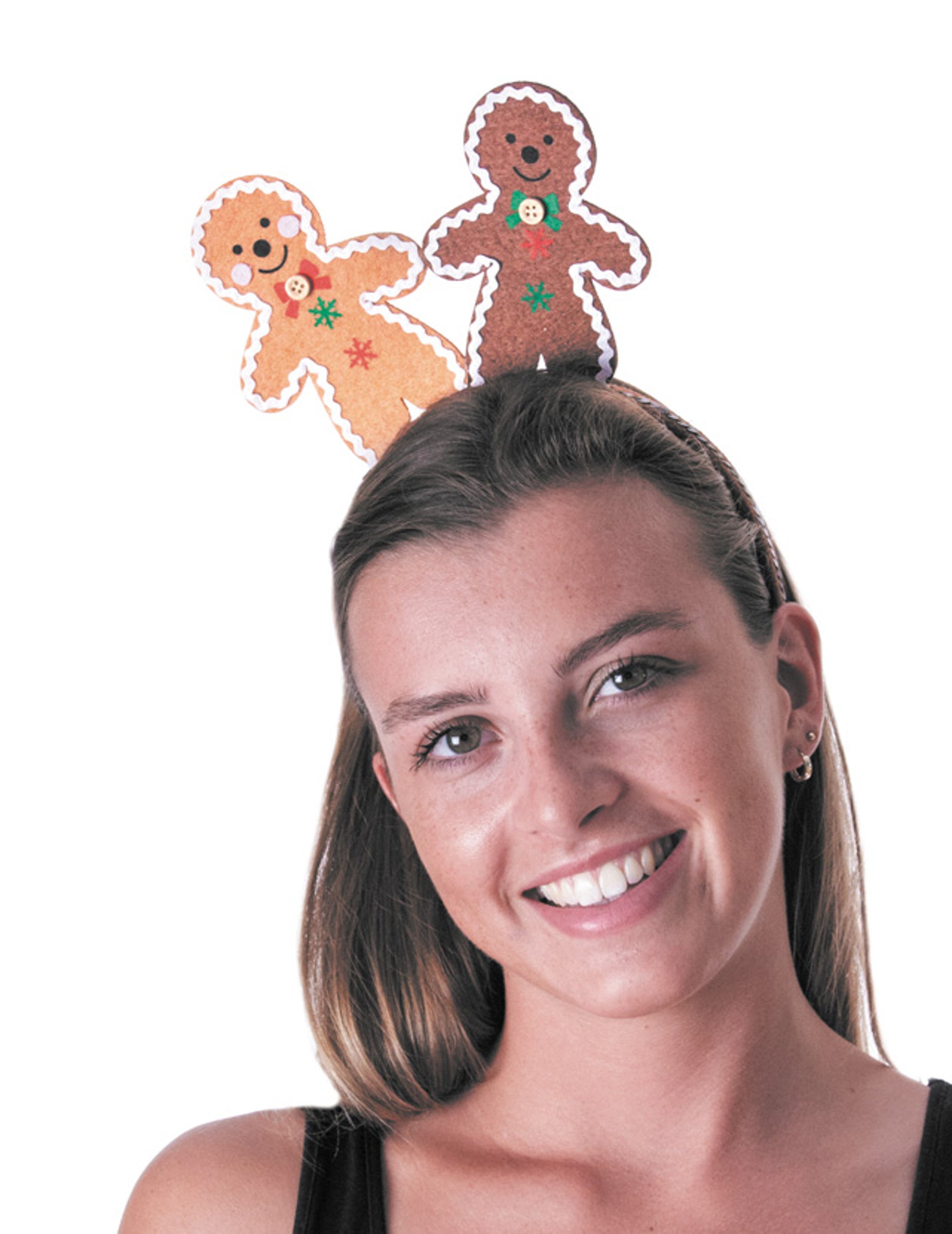 Ta božični trak za medenjake je namenjen odraslim. Izdelana je iz plastike, pokrita z rjavo tkanino. Dva majhna piškotka iz medenjakov iz filca sta premagala, ena svetlo rjava, druga temno rjava. Oba sta okrašena na zelo realen način! Ta trak za glavo bo idealen za božično zabavo!