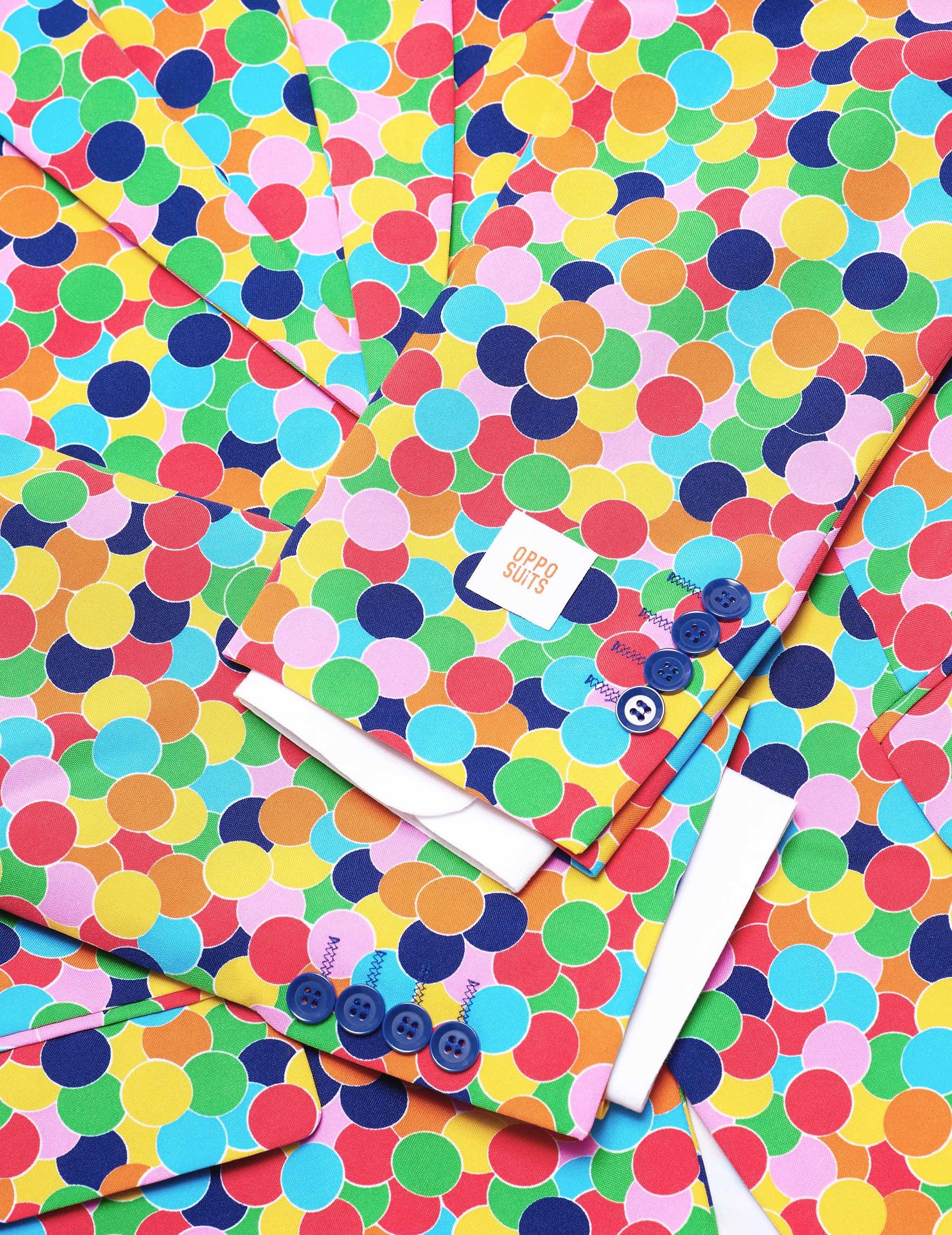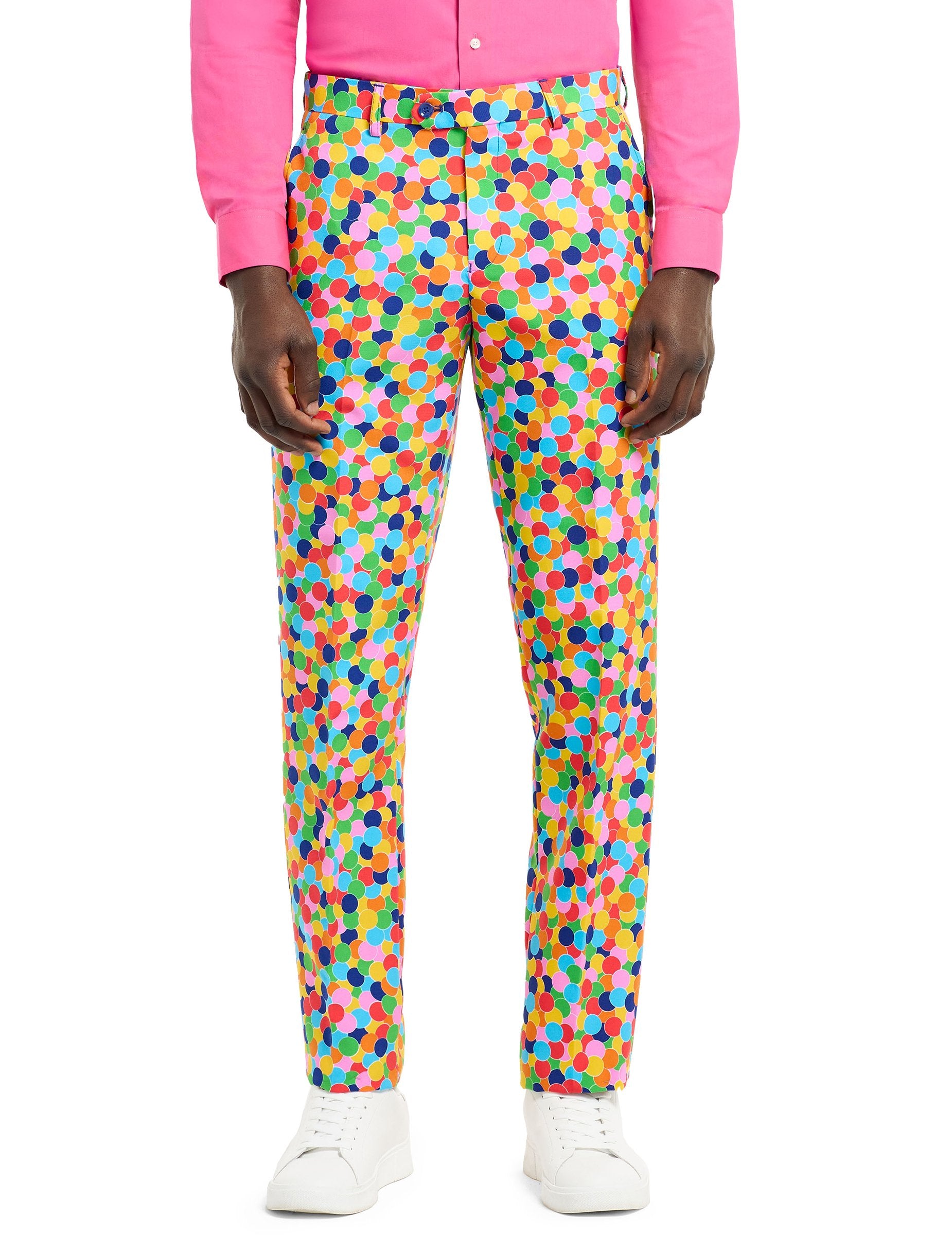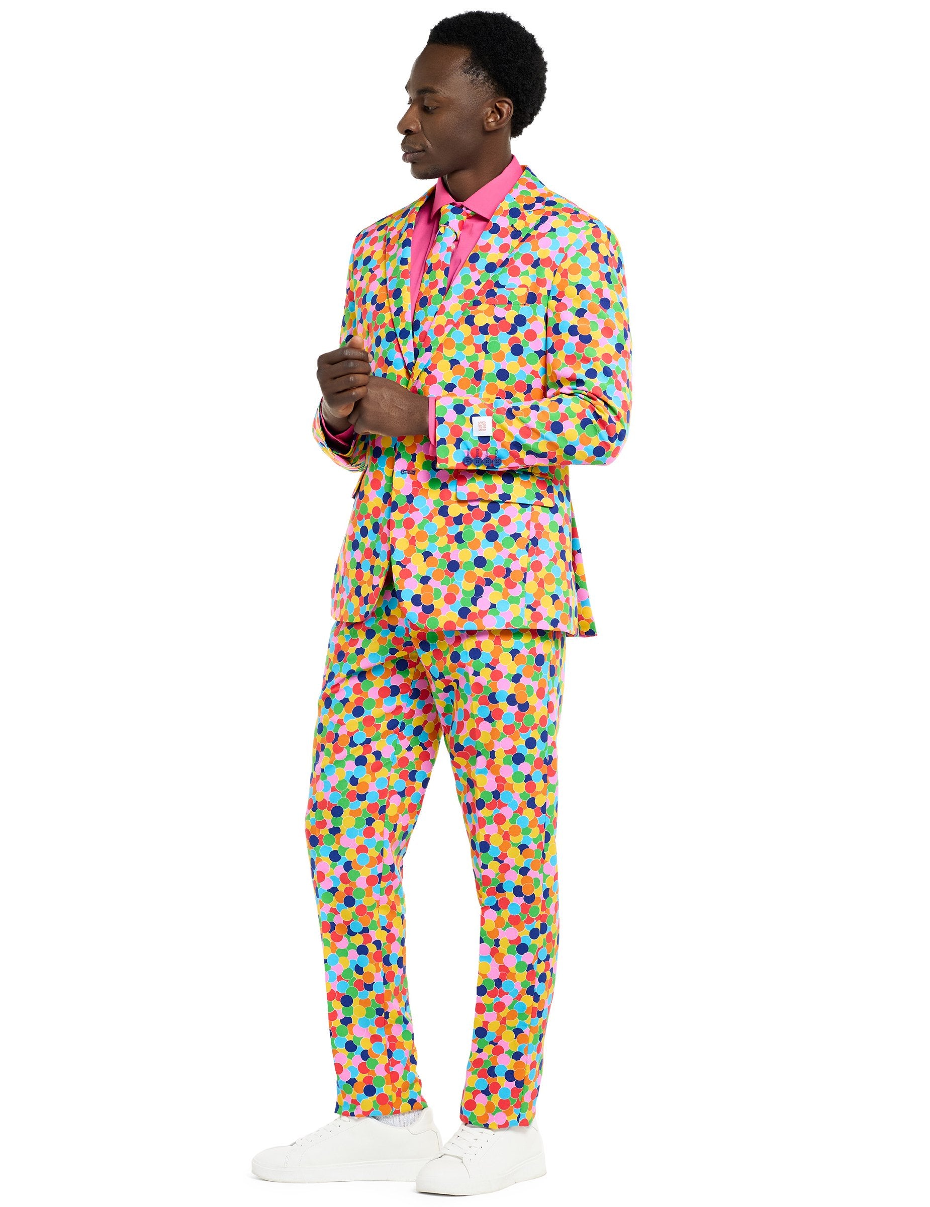 Ta gospod. Popolnoma ukrivljena jakna je okrašena z dvema lažnima žepima na sprednji strani in se zapre z dvema modrima gumboma. Plolišča Panatalon ima dva stranska žepa in se zapre z zadrgo in gumbom. Kravata je privezana okoli udarca in kostum prinaša končni pridih. S tem čudovitim kostumom, ki se zdi izdelan iz konfetov, boste v vseh okoliščinah šik in izvirni.