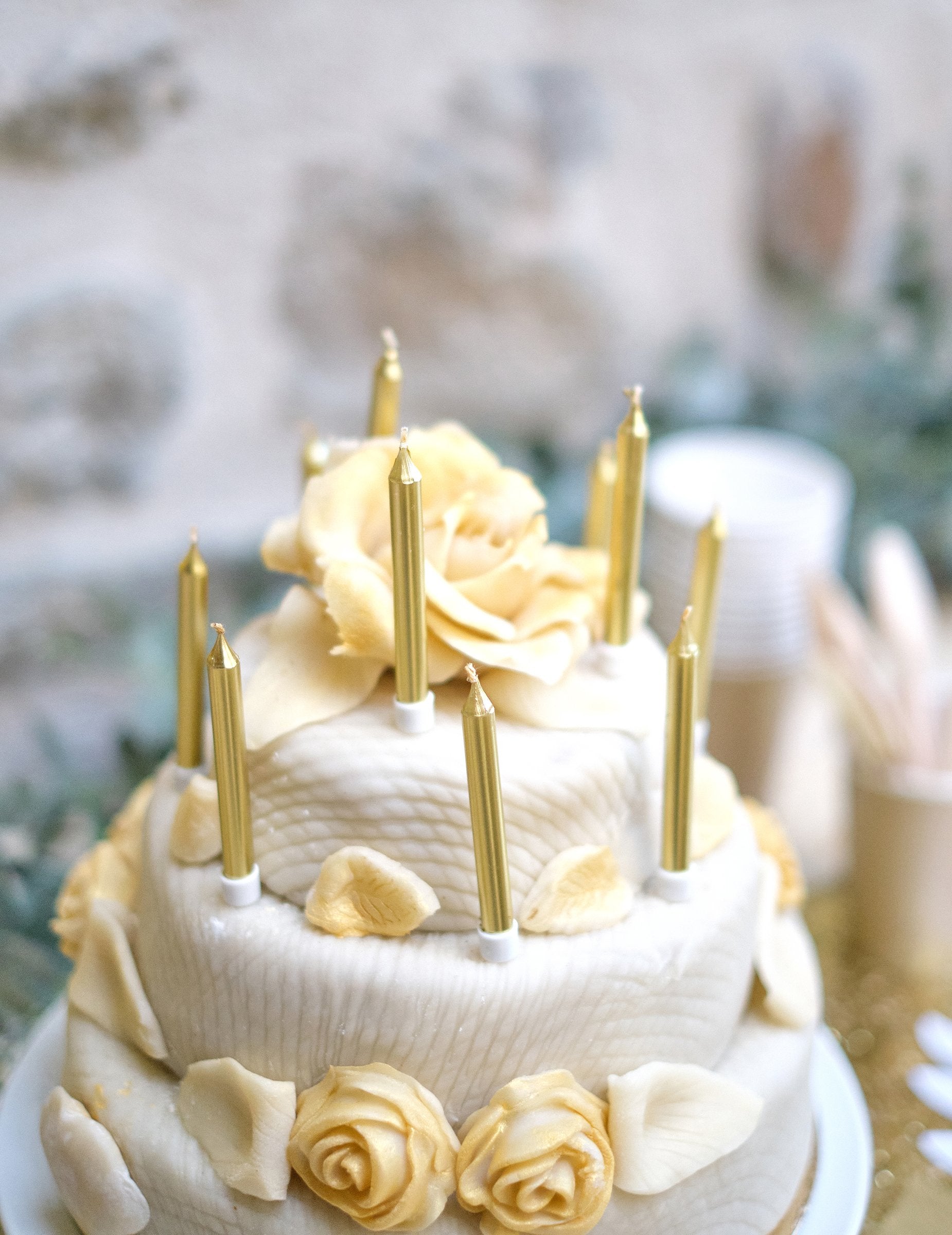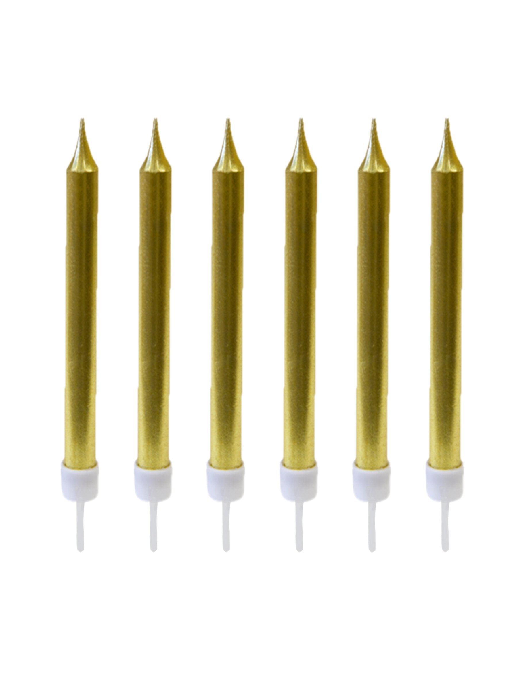 Teh 10 zlatih barvnih sveč je dolge 8 cm. Prodajajo se z 10 belimi bobbi in na primer bodo odlično oblekli lepo rojstnodnevno torto! Vaša dekoracija za zabave bo iskrila s tem zlatim dotikom na vaši sladici!
