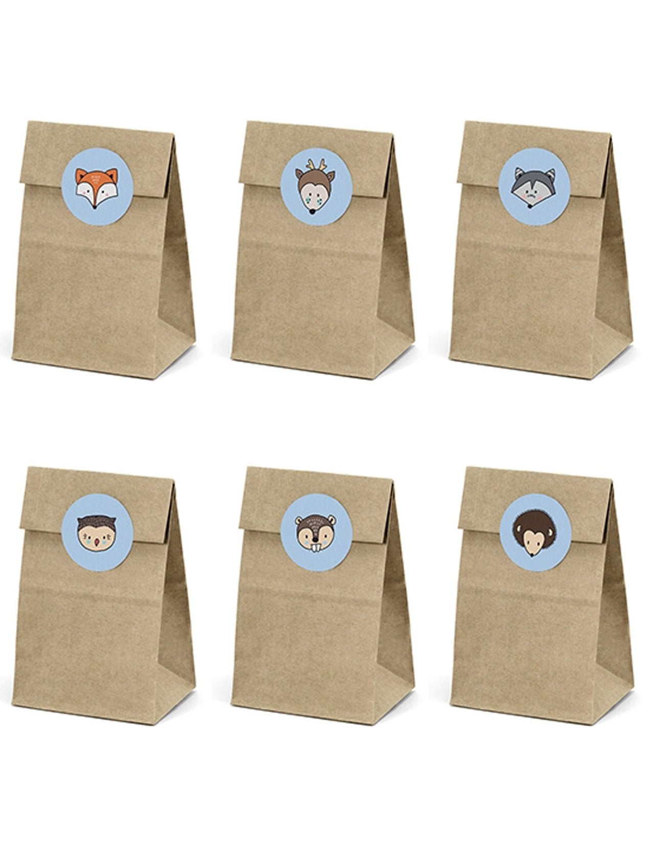 Ta komplet vsebuje 6 vrečk iz naravnega kraft papirja skupaj s 6 dekorativnimi nalepkami. Vrečke imajo dimenzije 7,5 x 18,5 cm. Okrogle nalepke premera 4 cm prikazujejo prikupne gozdne živali na nežni modri podlagi, popolne za elegantno zapiranje vaših darilnih vrečk. Napolnite jih s sladkarijami ali malimi darilci, da razveselite svoje goste. Ti dodatki so idealni za praznovanje baby showerja ali organizacijo tematske rojstnodnevne zabave.