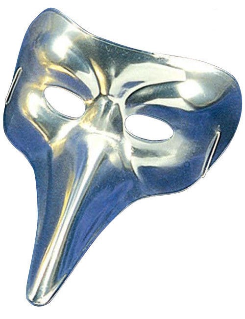 Ta beneški maska v srebrni barvi se pritrdi z elastiko. Ta maska je klasičen primer tega stila s svojim dolgim nosom.
