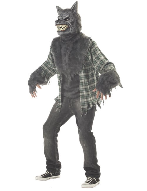Ta prikrivanje volkov za odrasle vključuje masko in krzno majico (hlače in čevlji niso vključeni). Sivo krzno vdre v vašo sivo in zeleno majico v trupu in podlakti. Crocs pridejo iz ust: Metamorfoza v volkodlaku poteka. Čeljusti vaše maske se bodo odprle hkrati z usti. Posebni učinki, zajamčeni za noč čarovnic s to preobleko Wolf!