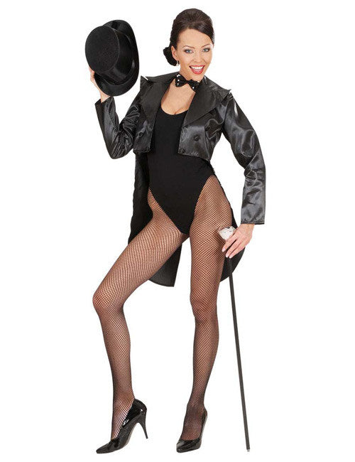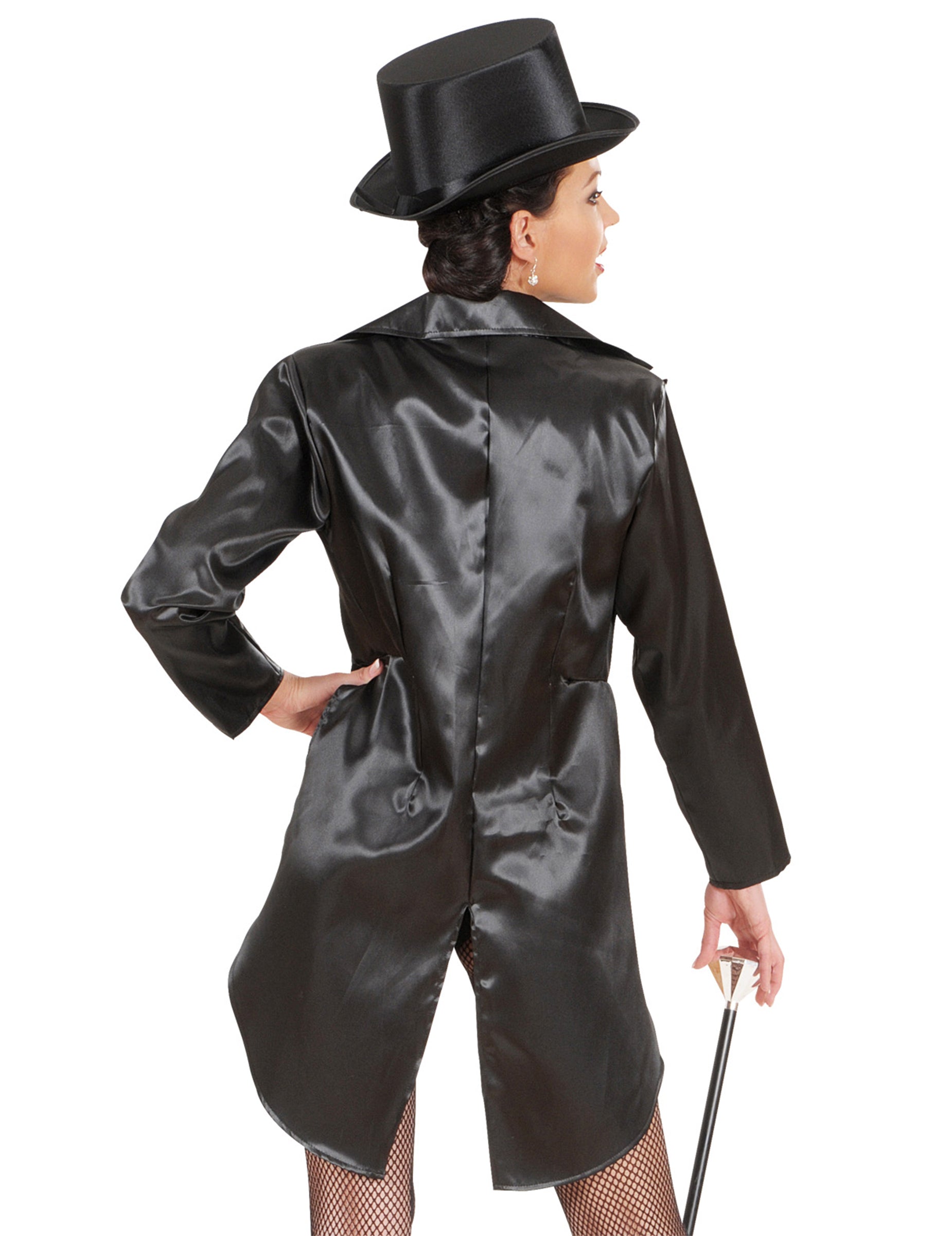 Ta vrhunski frac za rep za ženske je črna barva (kombinacija, klobuk, trs, nogavica in kravata ni vključena). Posebej je narejen za odrsko plesalko in je zasnovan med briljantnim satenom. Ta FRAC lahko nosite med predstavo (na primer čarovnija) ali med pustno zabavo. Avtorske pravice Widmann Srl
