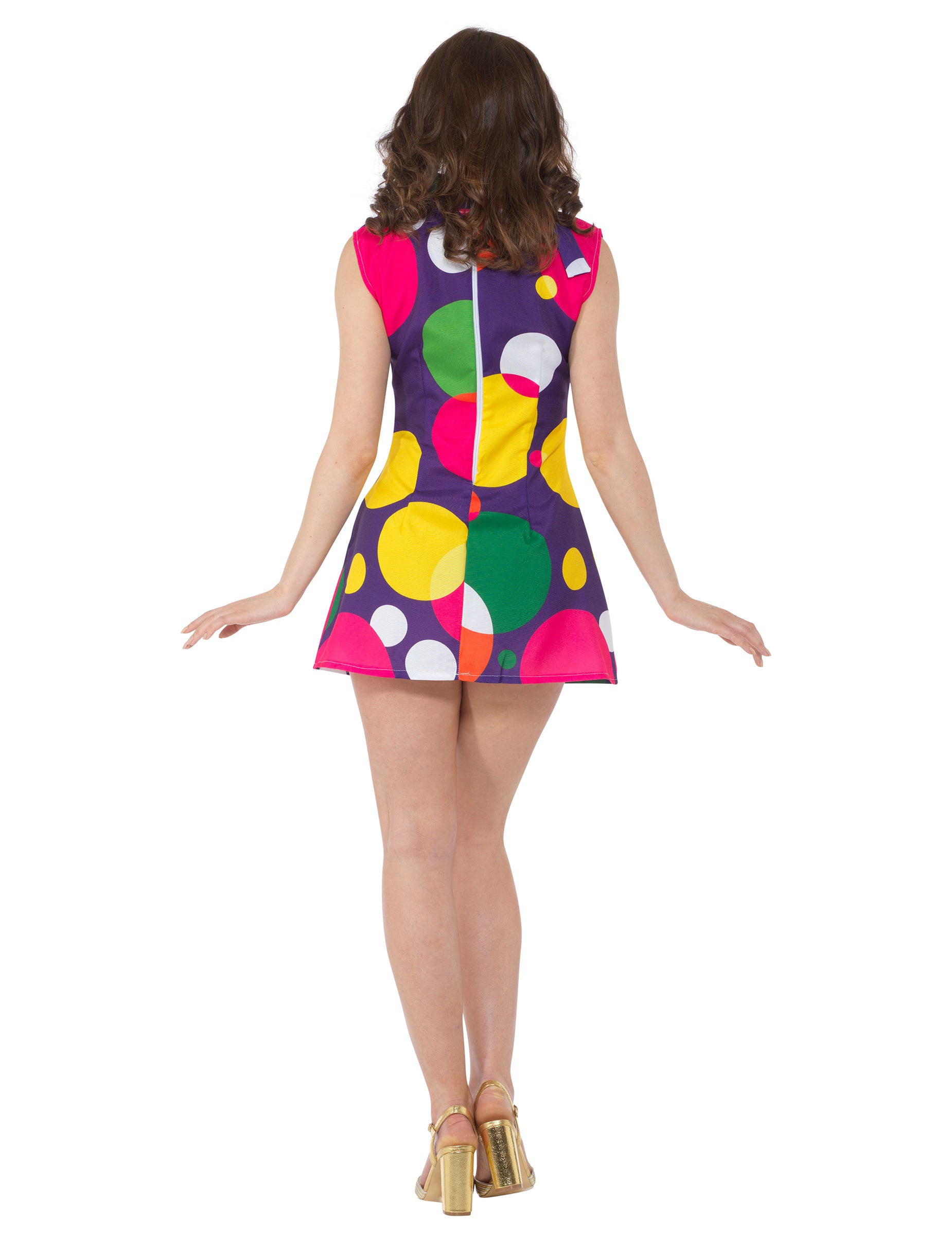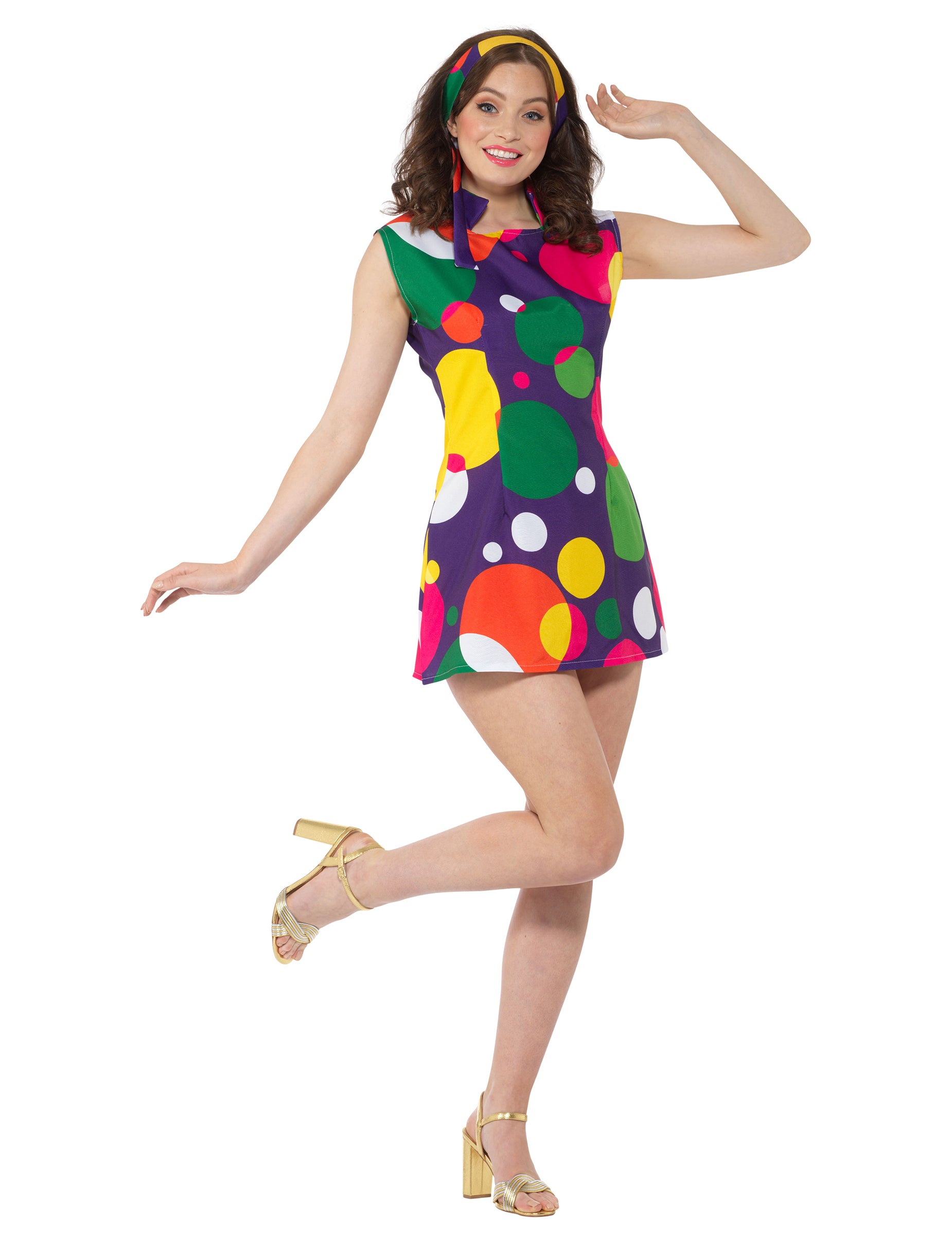 Ta disko kostum vključuje obleko in trak za glavo (škornji niso vključeni). Vijolična barva, obleka je natisnjena s grahom različnih barv in različnih velikosti. Je brez rokavov in ima ovratnik. Trad z glavo istega vzorca, ki ga je treba obleči privezati v lase. Ta pop ansambel za ženske bo popoln kot obleka za večer, preoblečen s prijatelji!
