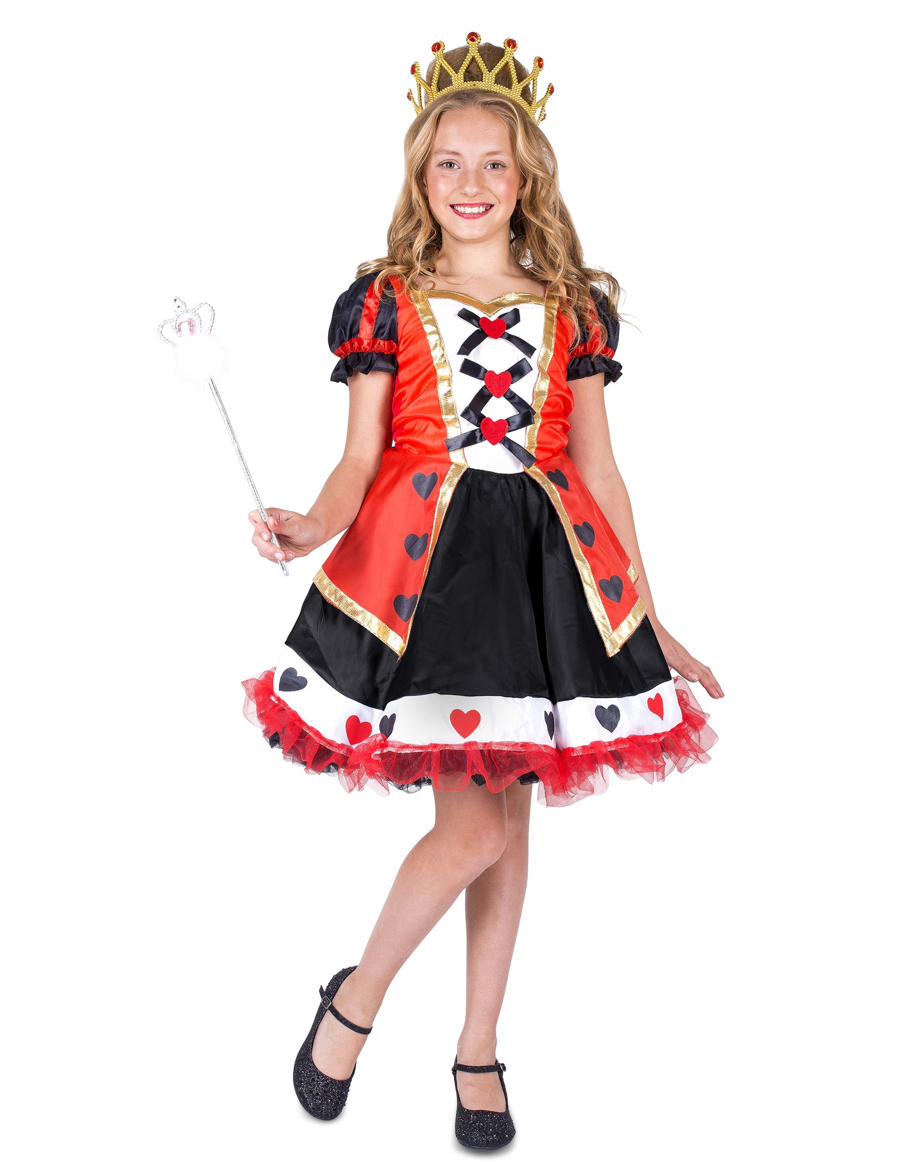 Ta kraljičin kostum za dekliška srca je sestavljen iz obleke in krone (bagueta in čevlji niso vključeni). Rdeča, črno -bela barva je natisnjena s srci. Ima kratke rokave in na dnu meji na til. Vključuje tudi precej majhne vozle na sprednji strani. Krona je zlata v barvi. Ta komplet bo kot nalašč za vašo deklico med pustno zabavo!
