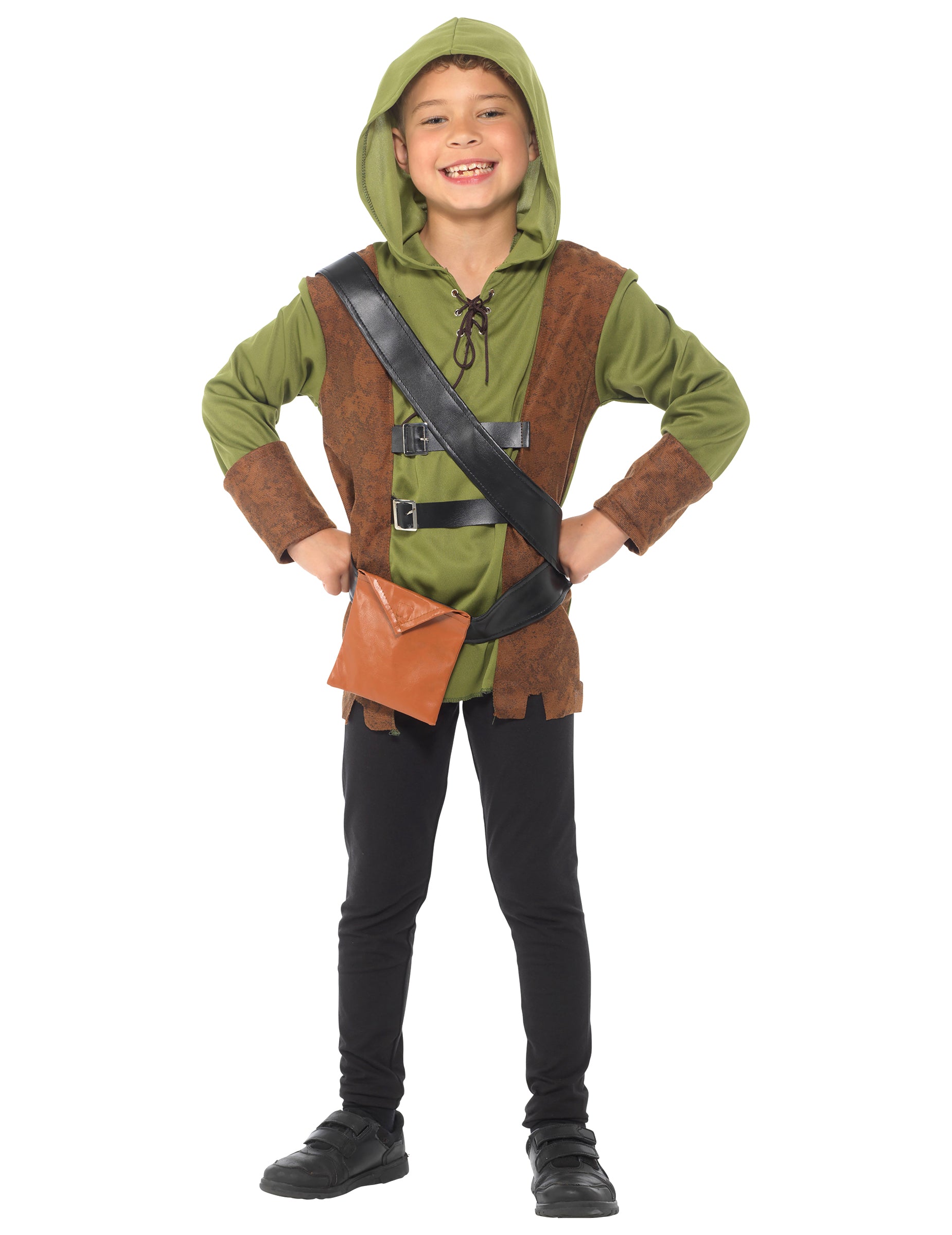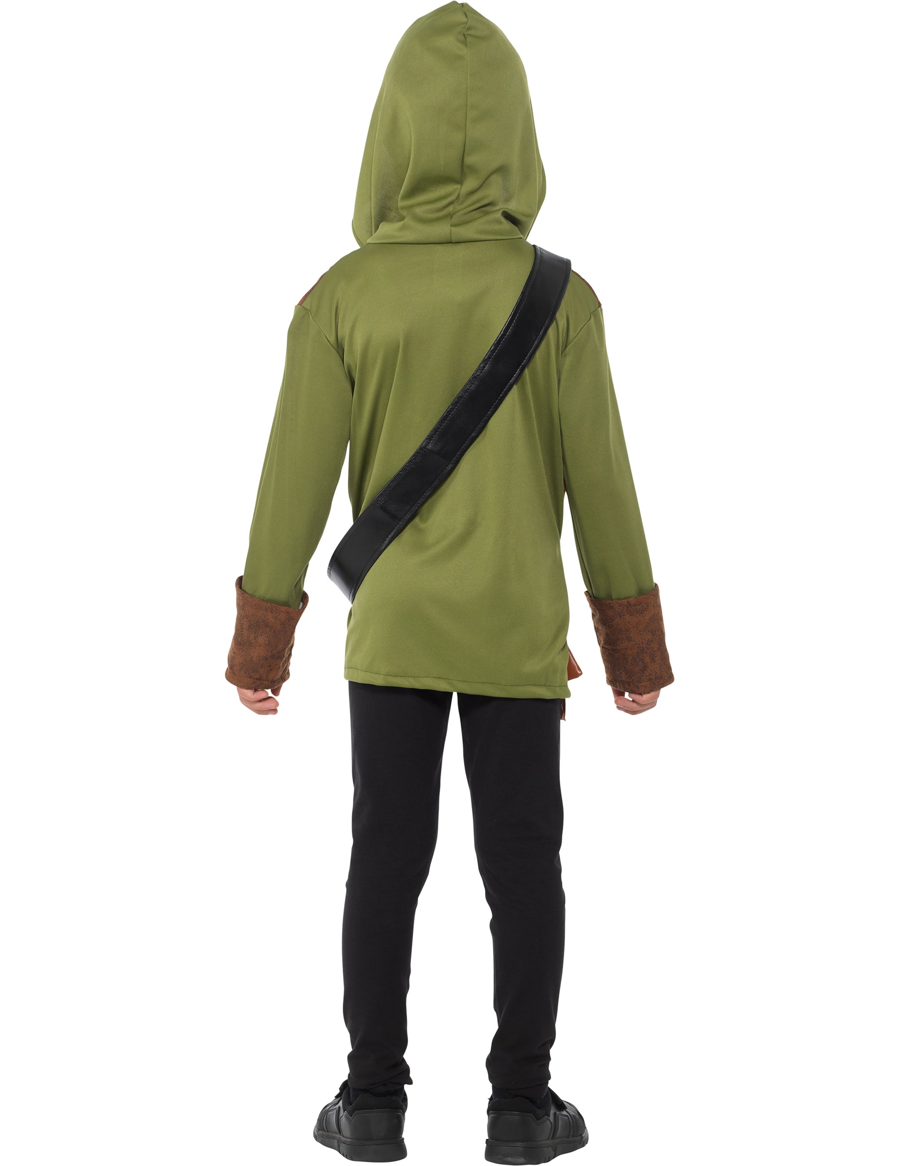 Ta moška lesena preobleka za fanta je sestavljena iz vrha s kapuco, jopiča, vzmetenja, pasu in škornjev (meč, hlače in čevlji niso vključeni). Vrh s kapuco je zelen in rob rokavov je rjav. Rjavi telovnik je brez rokavov in je prišit nad zgornjim kapuco. Pasovi so črni in imajo žep. Kar zadeva škornje, so rjave. Ta komplet bo idealen za vašega sina za prikrito zabavo ali karneval!