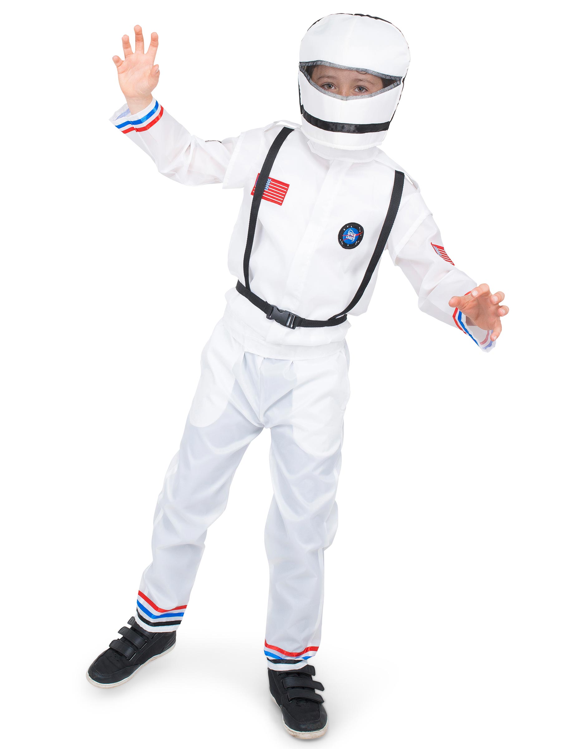 Tega otroškega astronavta je sestavljen iz suknjiča, hlač in čelade (čevlji niso vključeni). Bela jakna ima spredaj in na rokavih različne značke, pa tudi črni pas, ki se zapira s pasom. Hlače so bele in črtaste na dnu. Kar zadeva čelado, je bela in ima odprtino za oči. Ta astronavtski kostum bo idealen za prikrito zabavo ali za karneval!