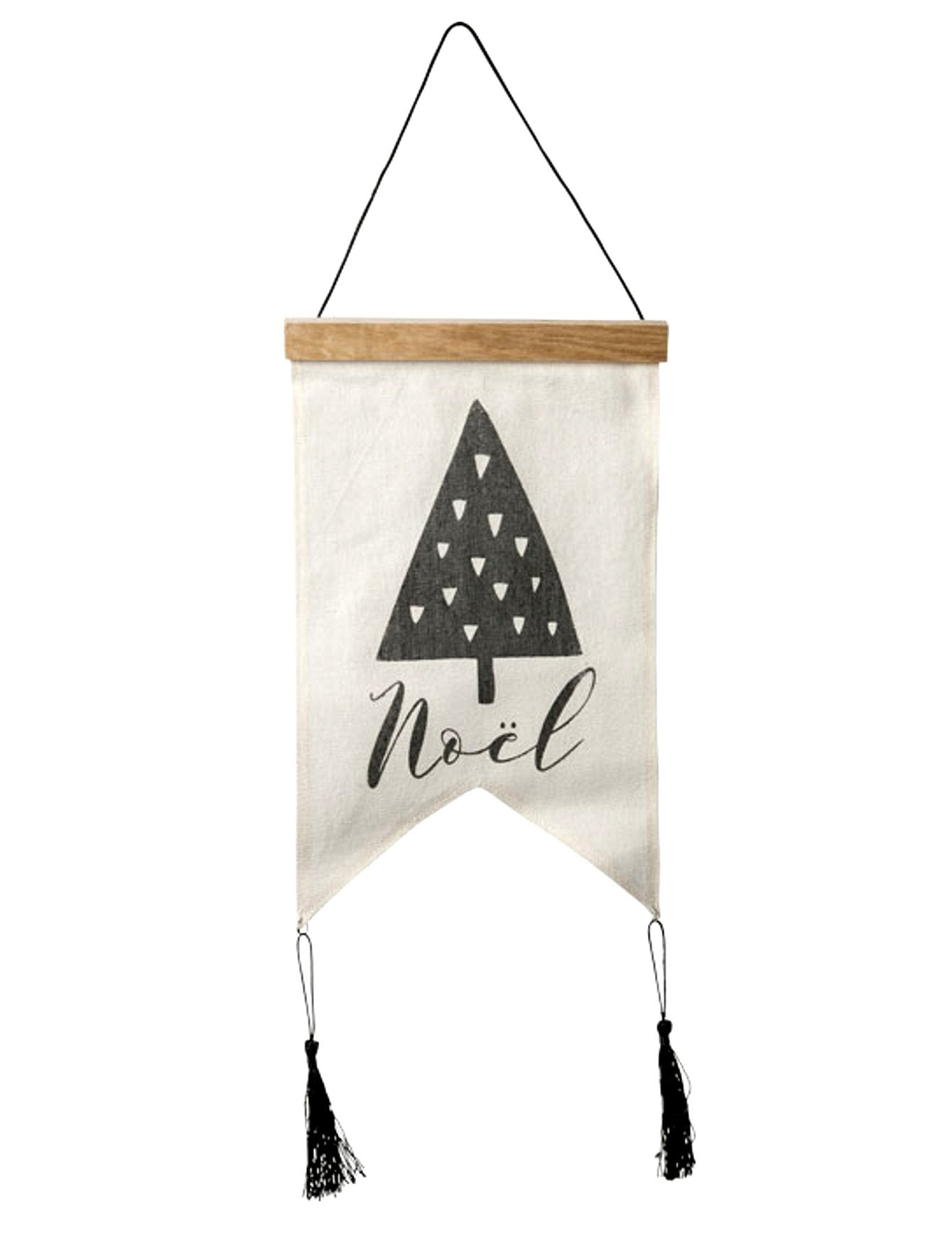To tapiserija Izdelano iz lanenega blaga, dimenzije 37 x 40 cm in se ponaša z minimalističnim slogom. Ima belo platno, okrašeno z dvema črnima cofomoma, ki sta pritrjena na lesen moznik z vrvico za enostavno namestitev. Ta model ima grafični motiv jelke in črno besedo "Božič". dekoracija Če ga obesite, boste izboljšali svoje Božični okraski za moderno in nagnjenost.