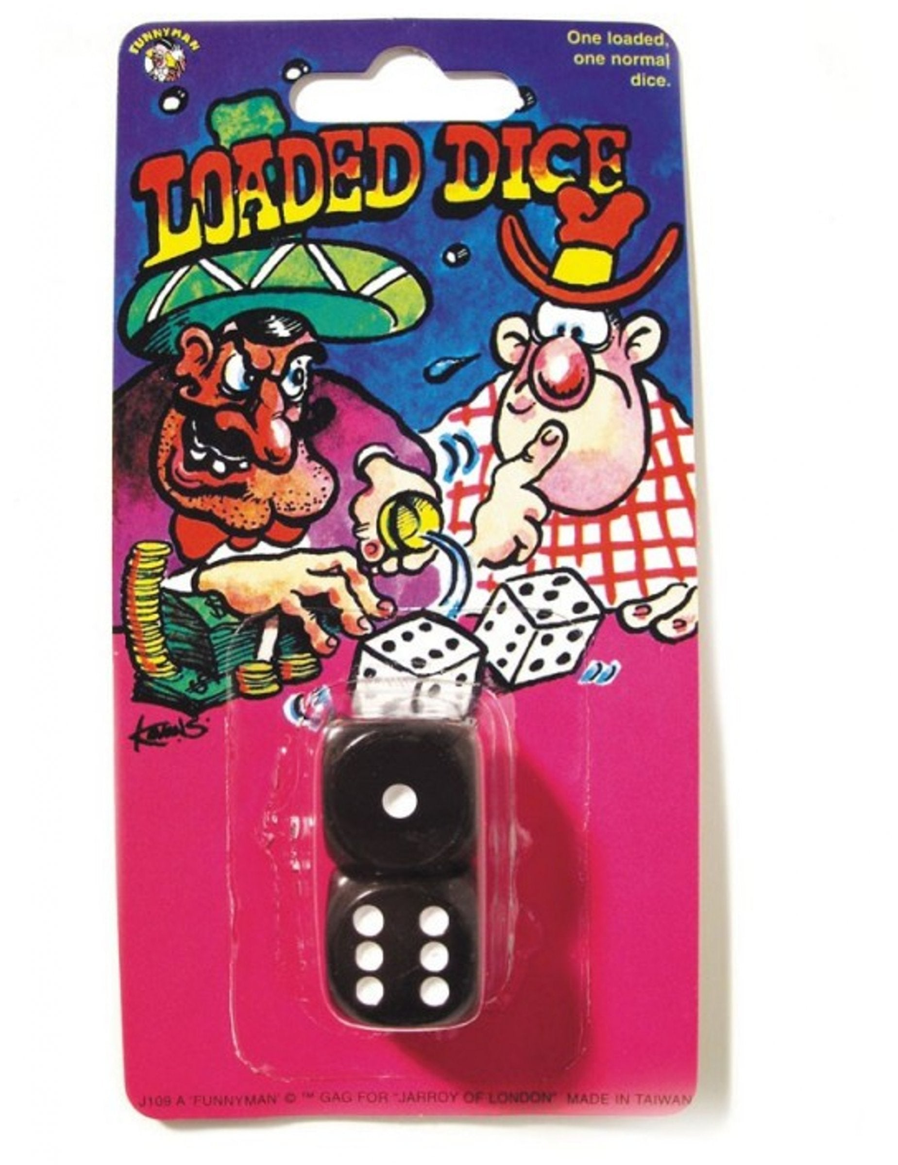Ta komplet vsebuje 2 kocki, od katerih je ena prirejena. Ena vam namreč omogoča, da pri metanju v 80 % primerov vržete šestico.