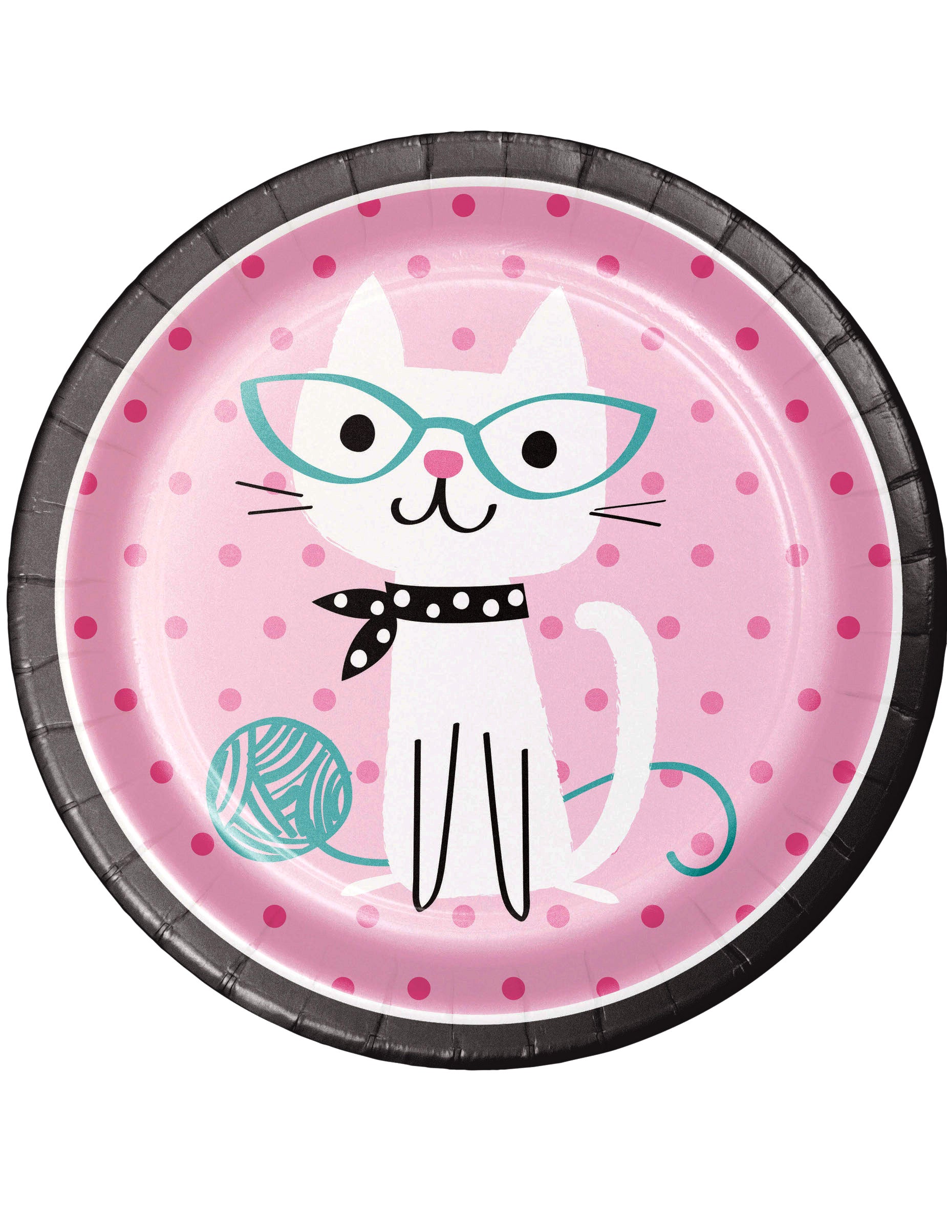 Dodajte svoji zabavi kanček sladkosti s tem paketom 8 kosov kartonske krožnike od 22 cm. Vsak krožnik z roza pikčastim ozadjem in črnim robom predstavlja čudovito mačka Elegantna bela obleka z očali in pikčasto ruto. Majhen klobčič preje dopolnjuje ta ljubki prizor. krožniki za enkratno uporabo so idealni za praznovanje rojstni dan na temo mačk, s čimer bodo razveselili vse male ljubitelje mačka.