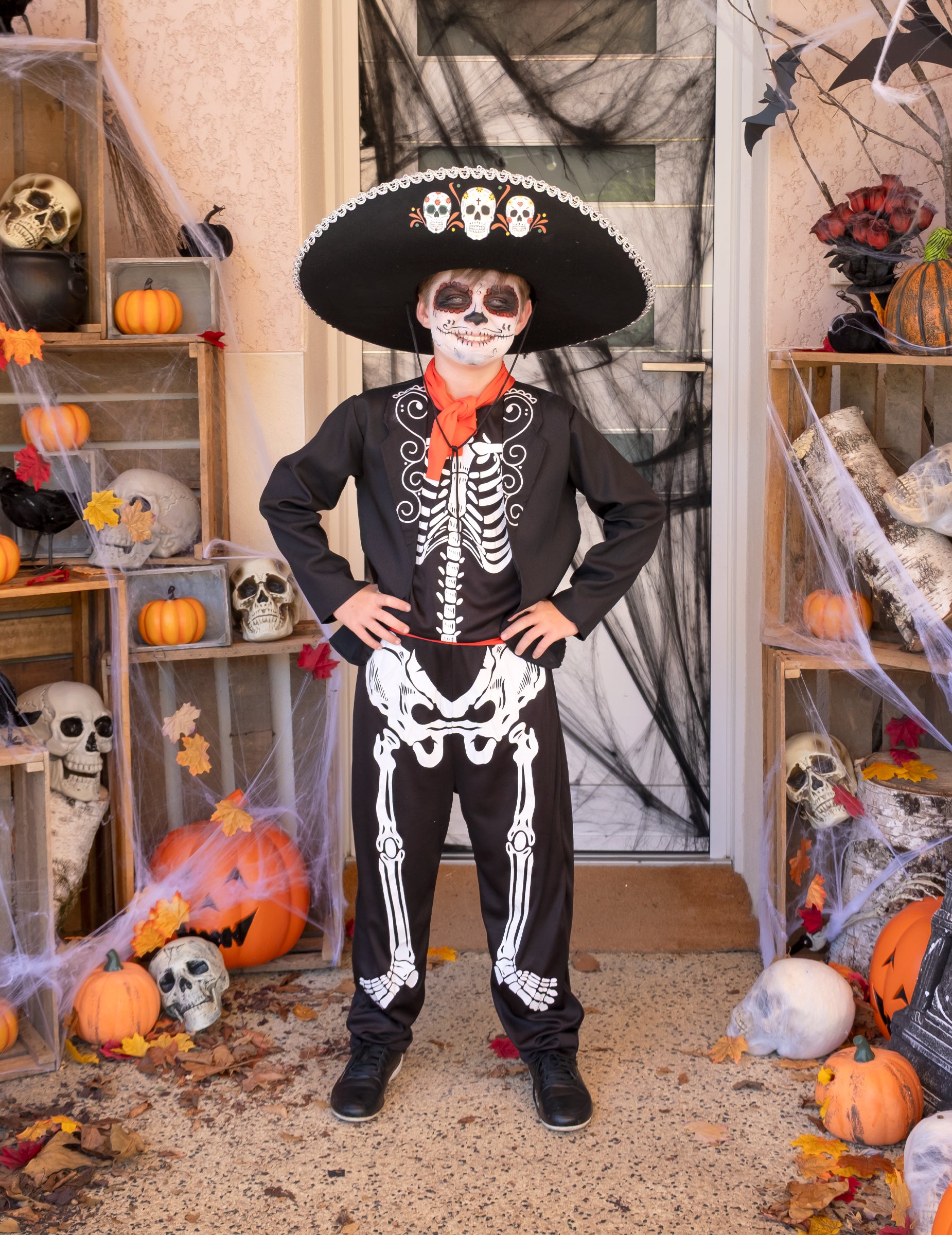 Ta skeletni kostum Dia de Los Muertos je sestavljen iz bandane, kombinacije, jakne in pasu. Črna jakna je okrašena z belimi odtisi na sprednji strani. Rdeča bandana se ujema s pasom, ki je privezan na pasu. Odločite se za ta skeletni skeletni kostum Los Muertos za fanta za noč čarovnic.