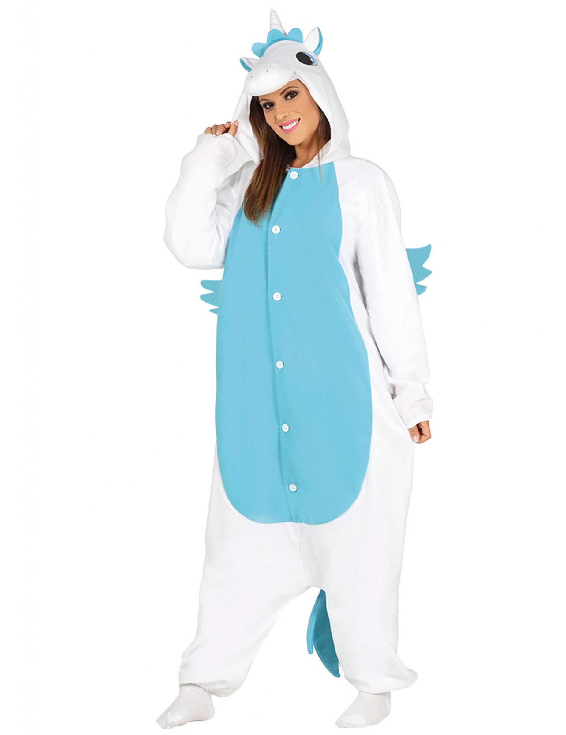 Ta preobleka za odrasle samoroge je sestavljena iz velike kombinacije s kapuco. Kombinacija bele barve z modrim trebuhom se zapre z gumbi na sprednji strani. Dolg rep z modrimi lasmi. Kapuca predstavlja glavo samoroga z velikimi modrimi očmi. Ta kostum bo kot nalašč za karneval.